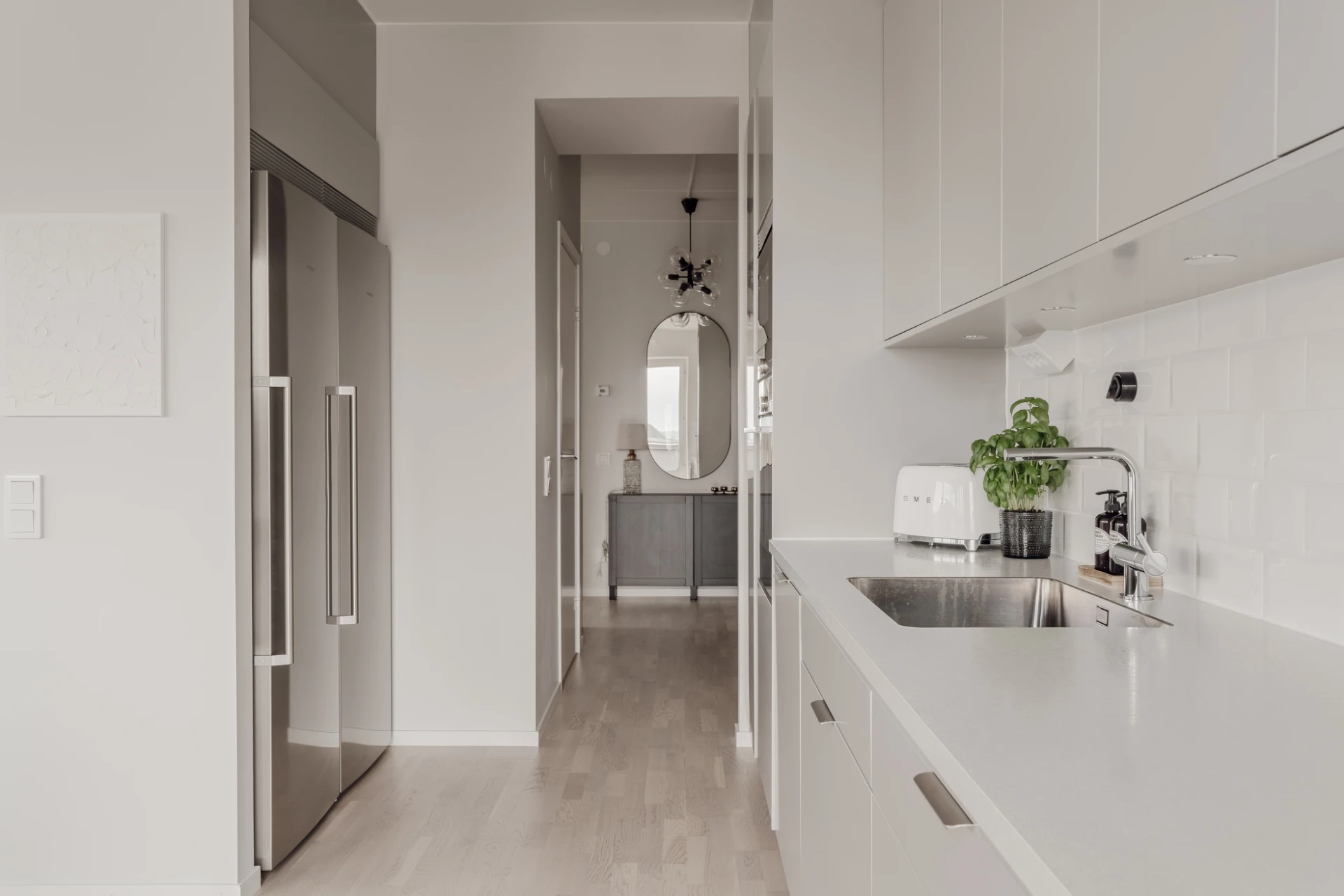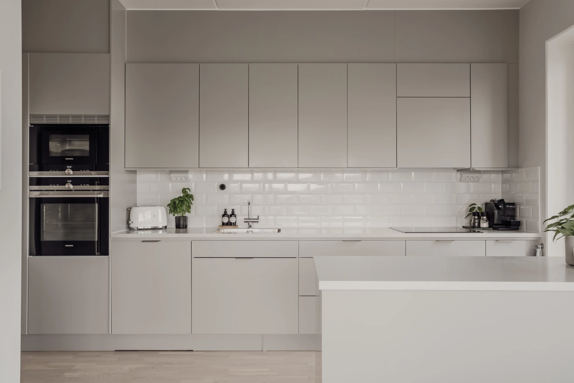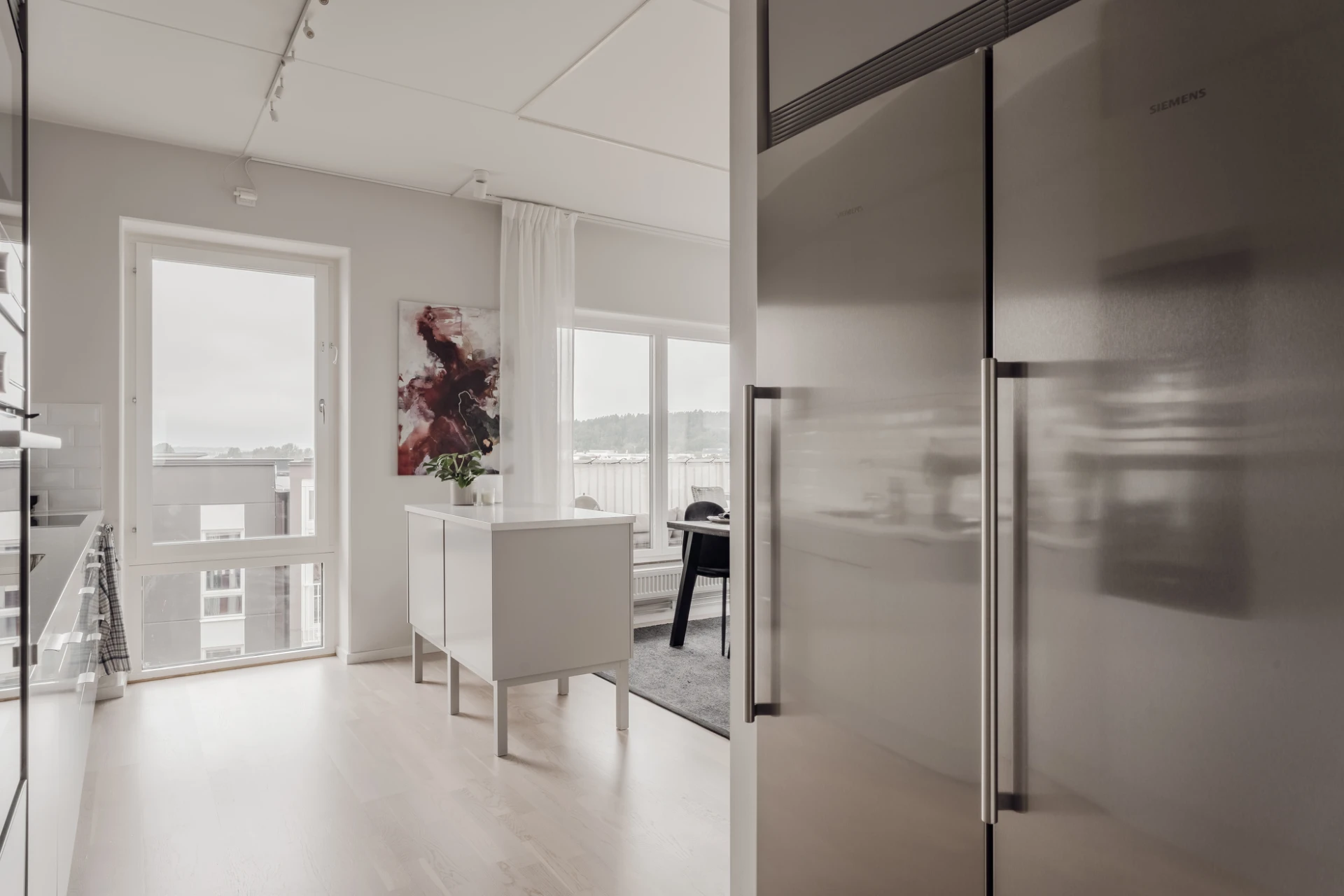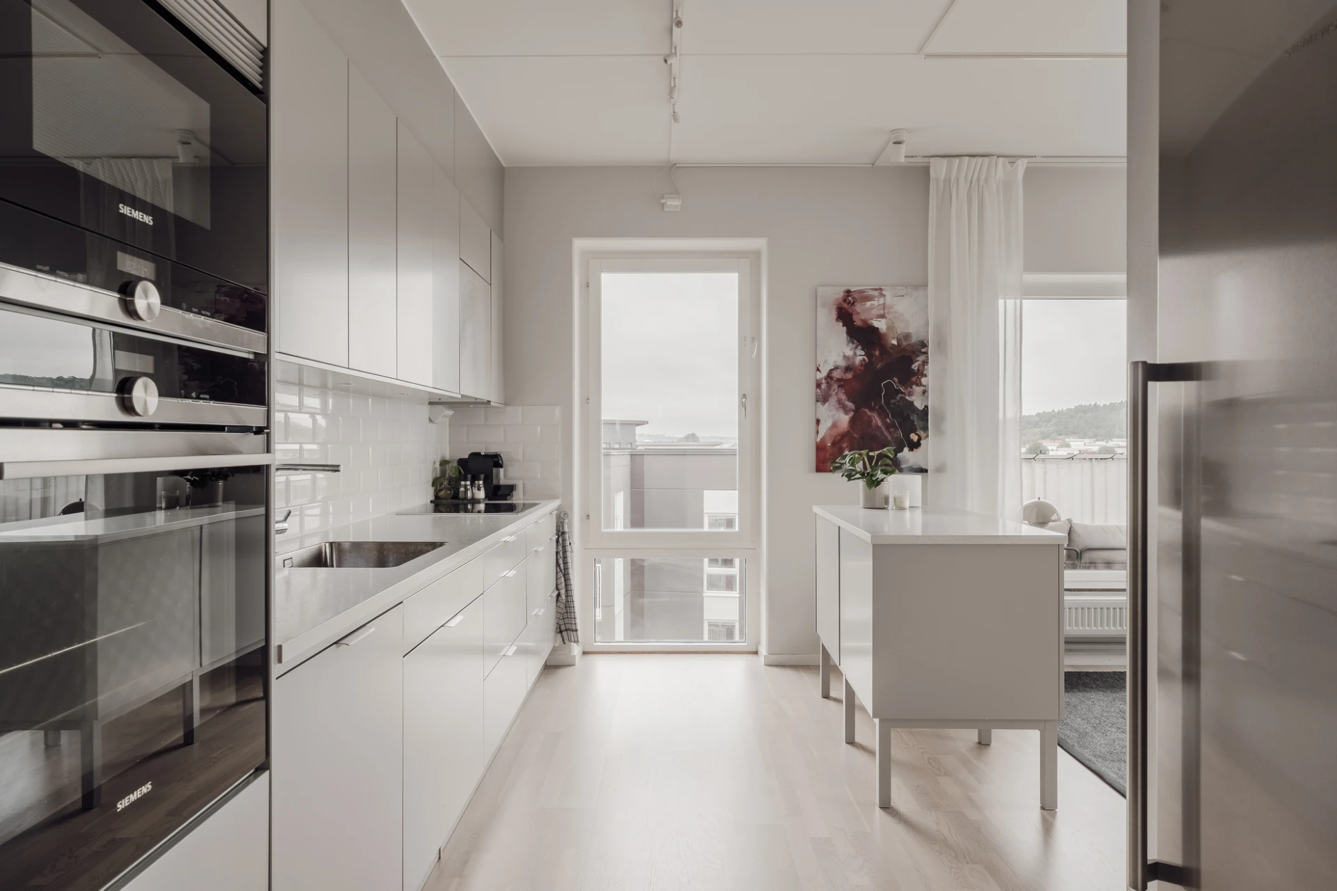 Vitlaserad ekparkett och ljusgråa väggar. Köksinredning med köksö i ljusgrått från Vedum med en vitskimrande arbetsbänk i laminat, vitt fasat kakel samt infällda spotlights ovan bänkytorna. Den maskinella utrustningen består av induktionshäll, fläkt, inbyggd varmluftsugn och mikro, integrerad diskmaskin samt kyl och frys i fullhöjd. Samtliga vitvaror är av fabrikat Siemens. Matplats för ca 8-10 personer.