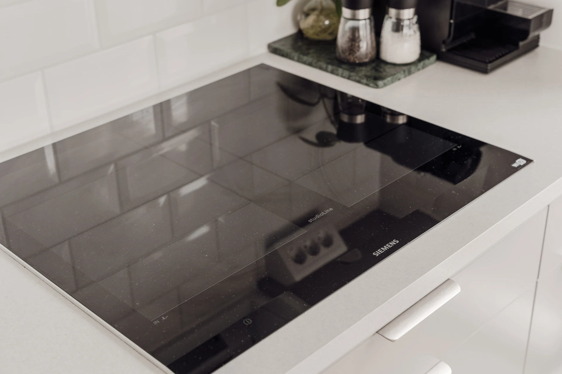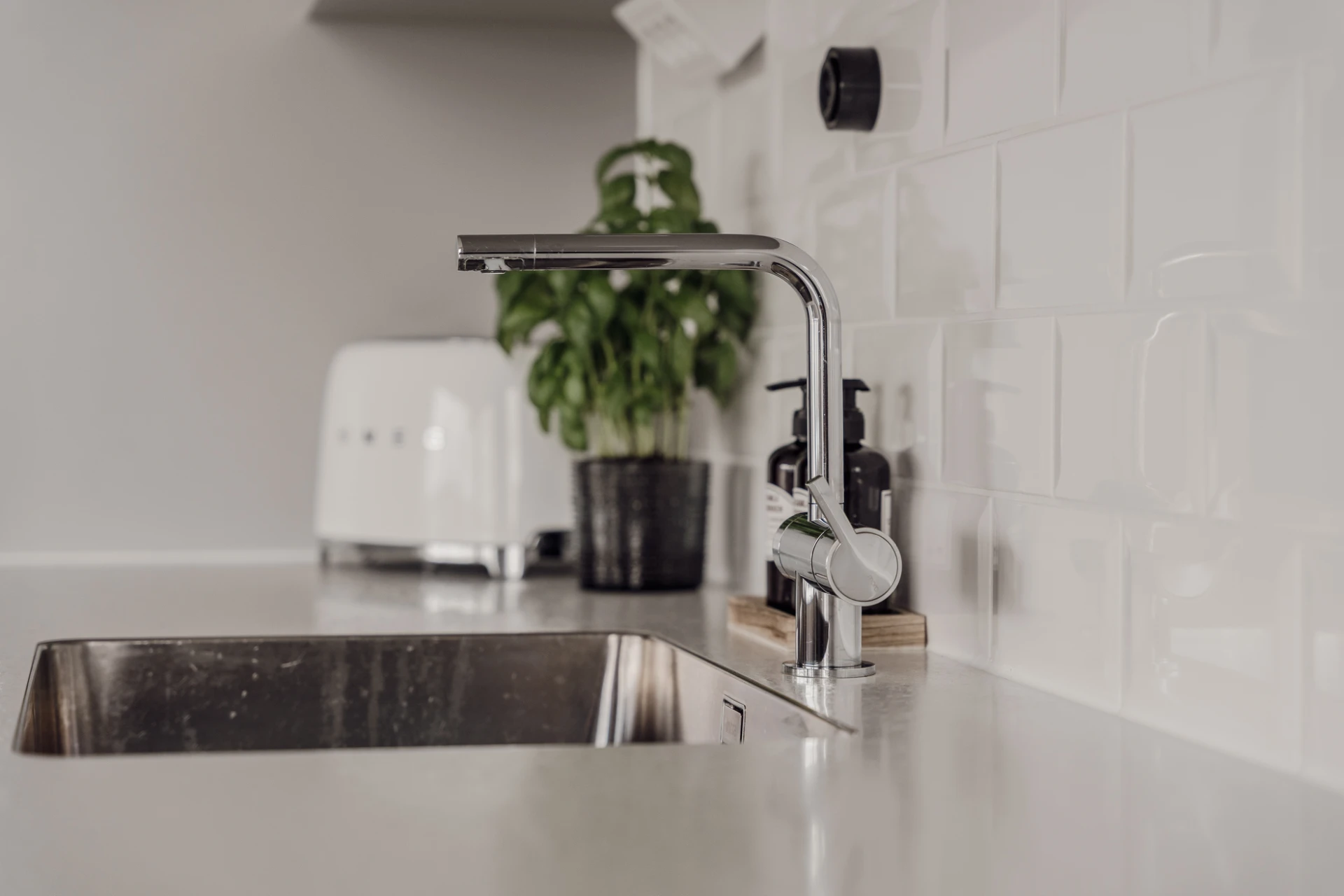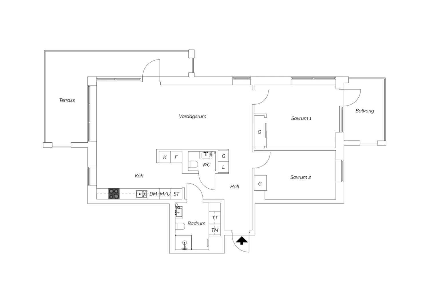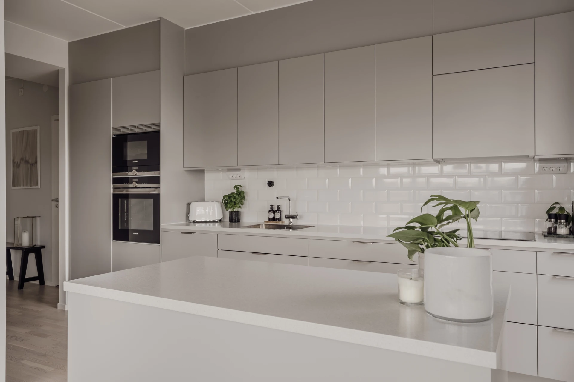 Vitlaserad ekparkett och ljusgråa väggar. Köksinredning med köksö i ljusgrått från Vedum med en vitskimrande arbetsbänk i laminat, vitt fasat kakel samt infällda spotlights ovan bänkytorna. Den maskinella utrustningen består av induktionshäll, fläkt, inbyggd varmluftsugn och mikro, integrerad diskmaskin samt kyl och frys i fullhöjd. Samtliga vitvaror är av fabrikat Siemens. Matplats för ca 8-10 personer.
