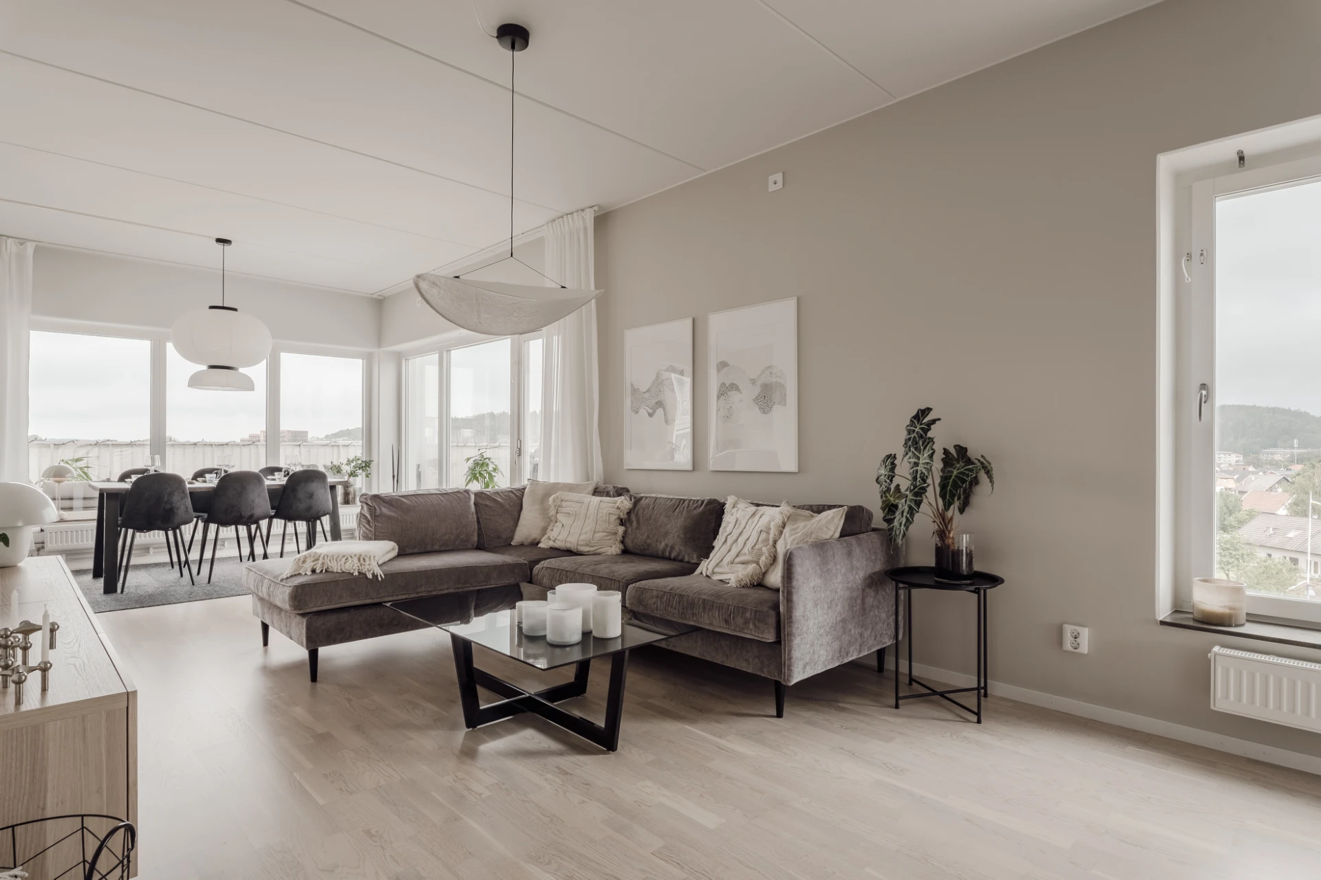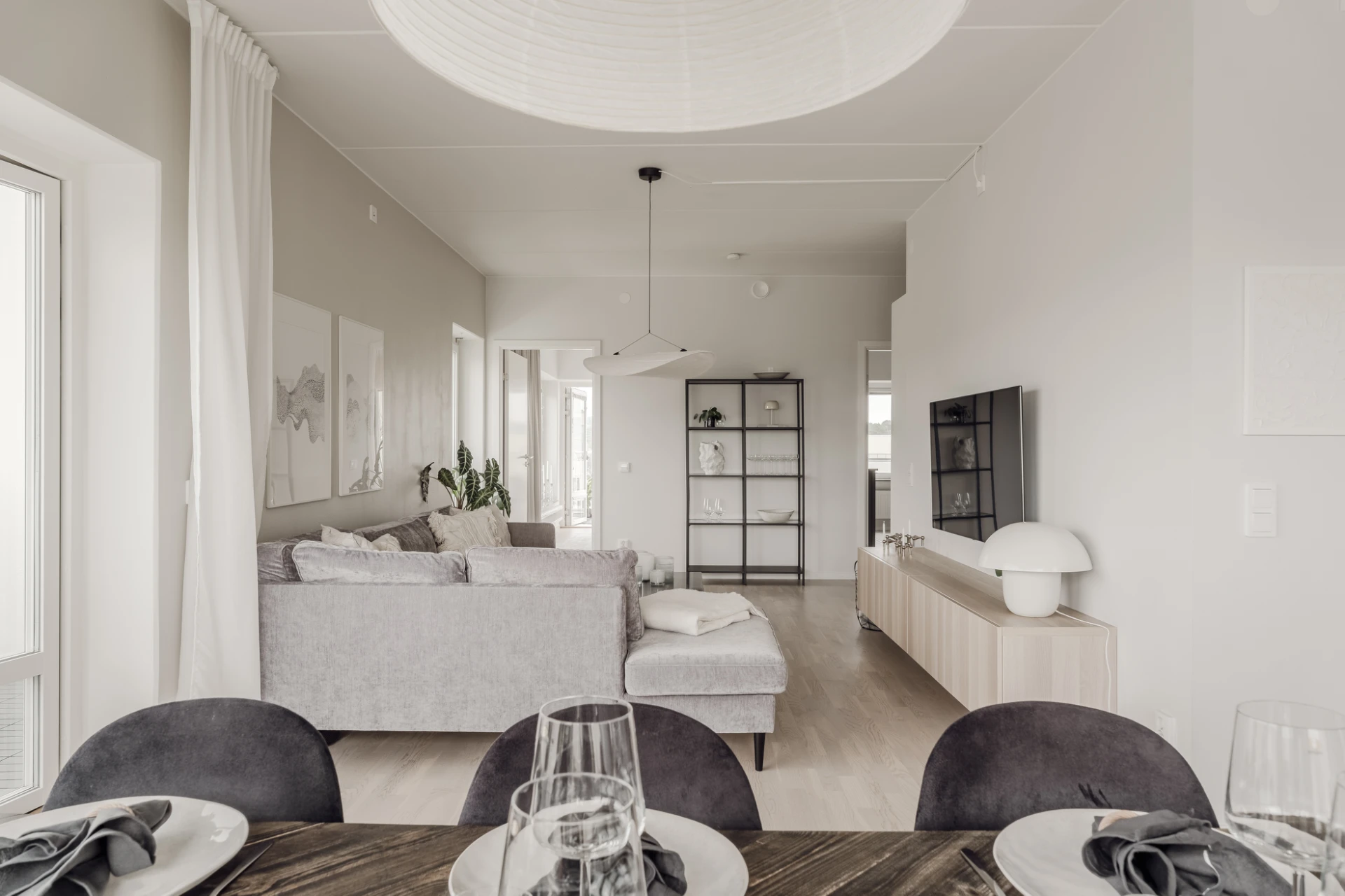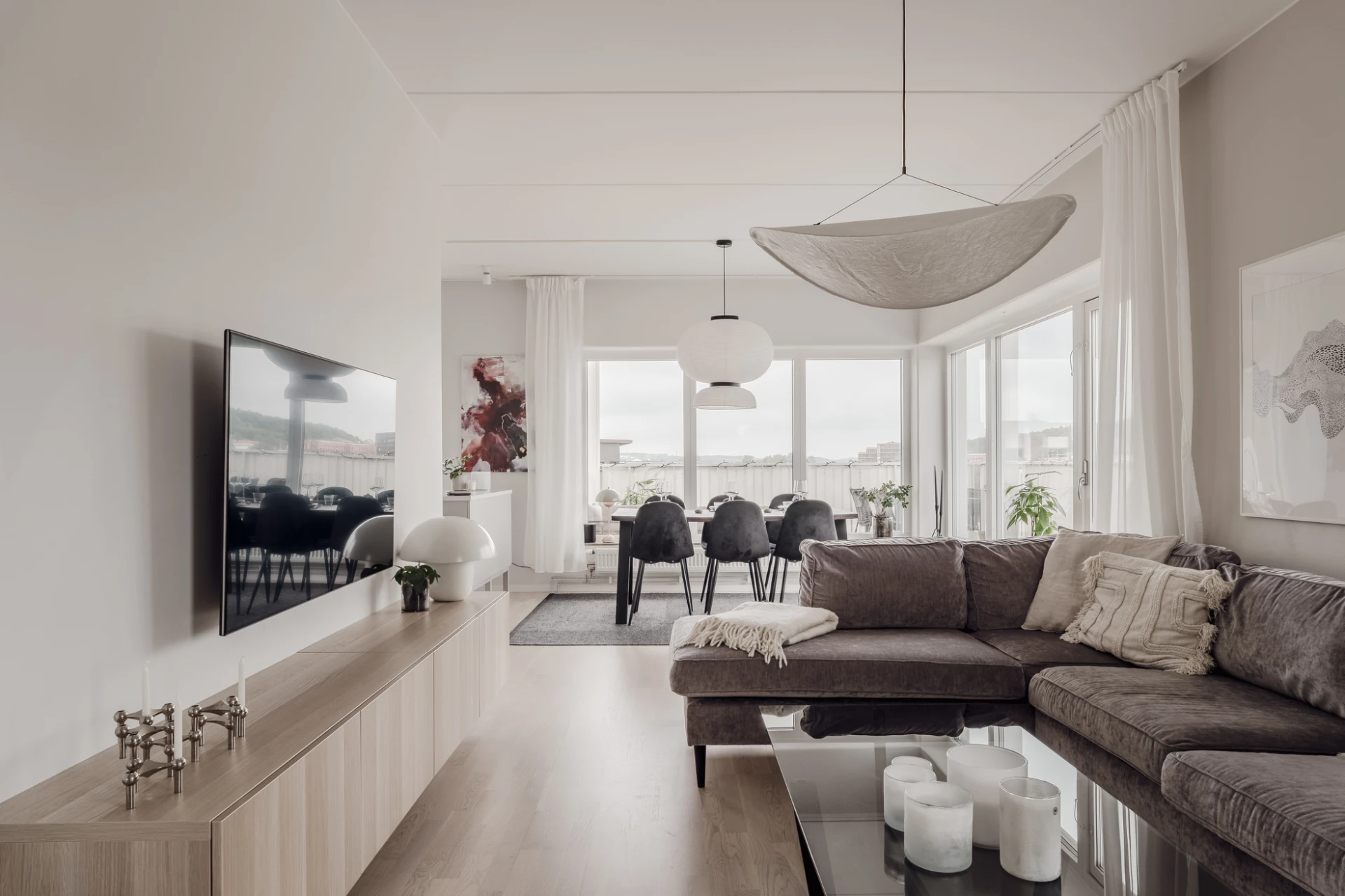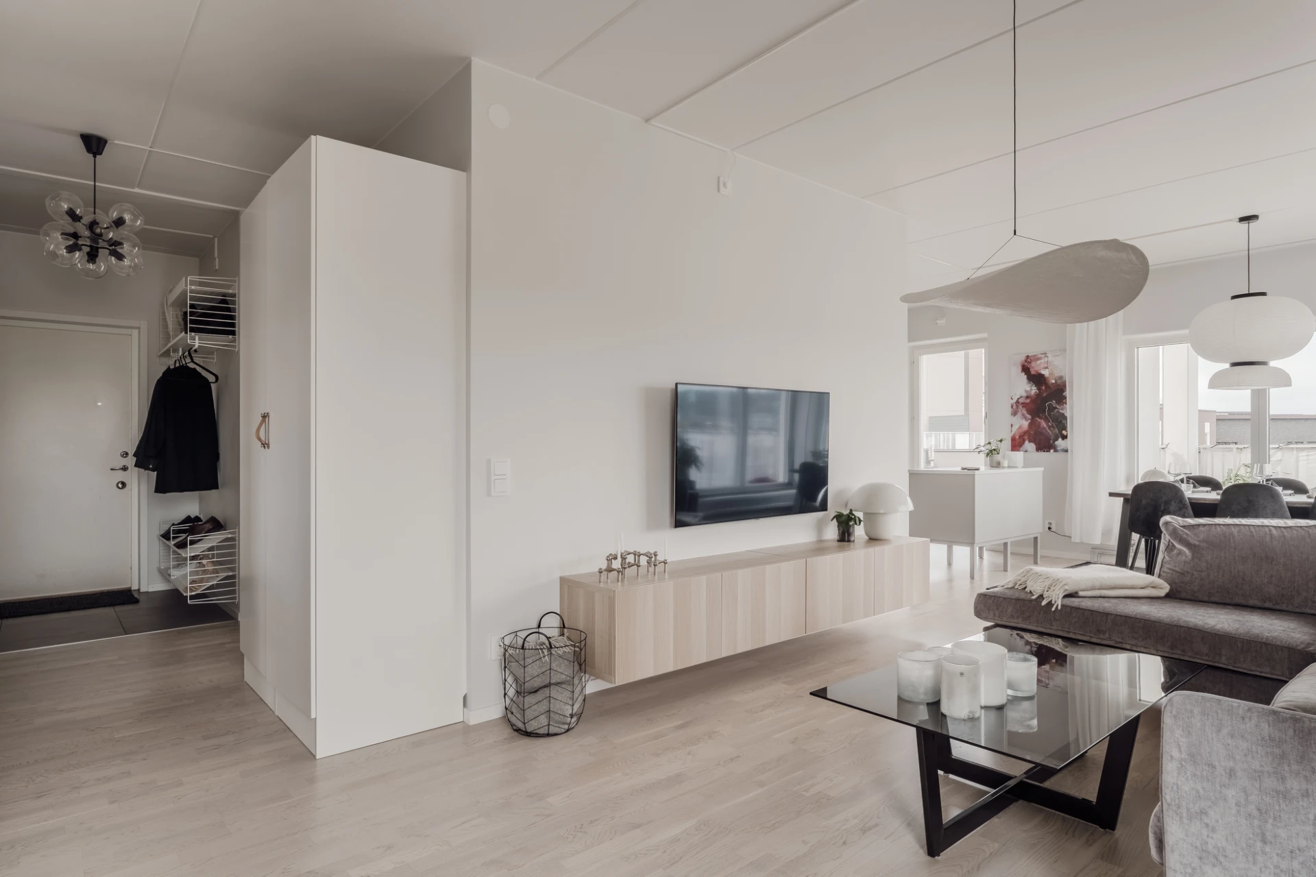 Vitlaserad ekparkett och ljust målade väggar med en fondvägg. I taket finns belysning med dimmerfunktion. Här finns plats att möblera med soffgrupp och tillhörande möblemang. Från vardagsrummet nås bostadens terrass.