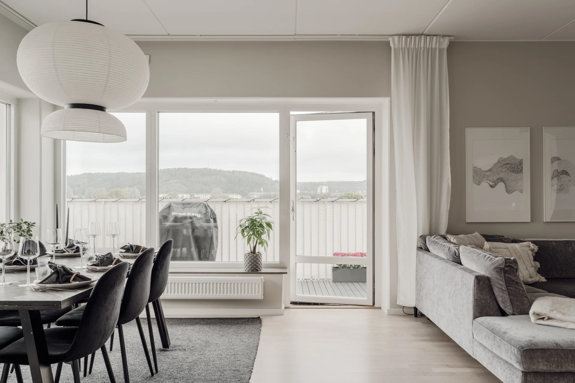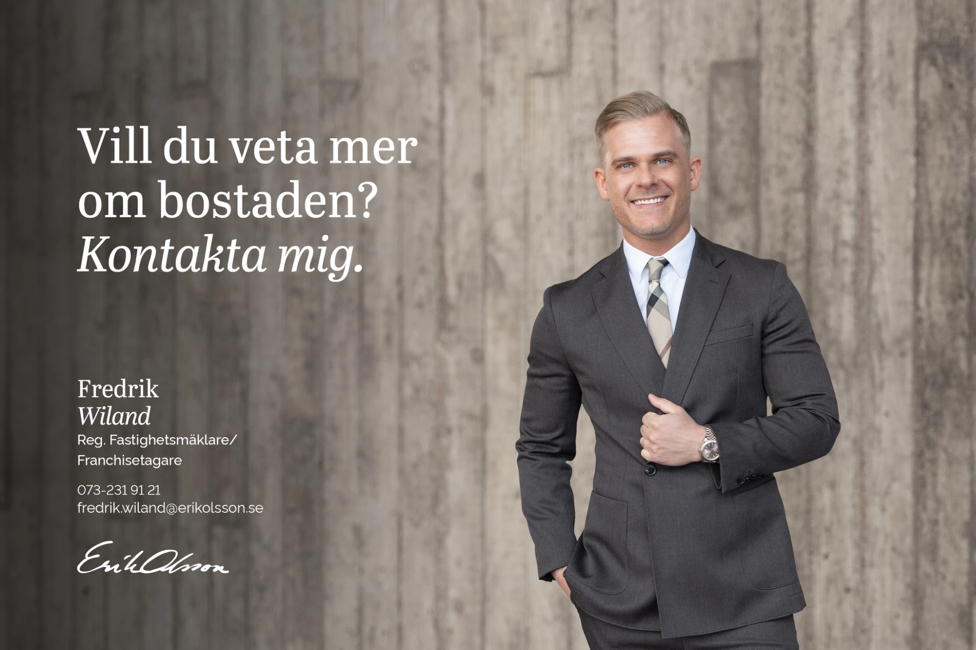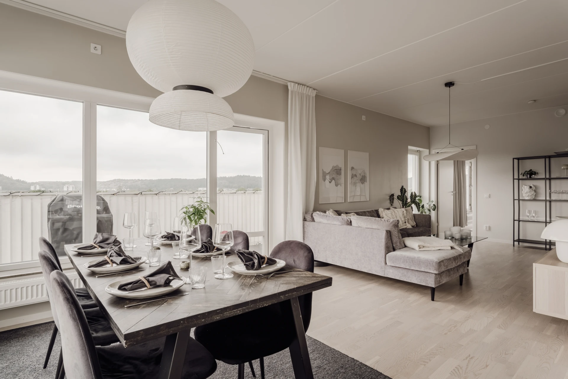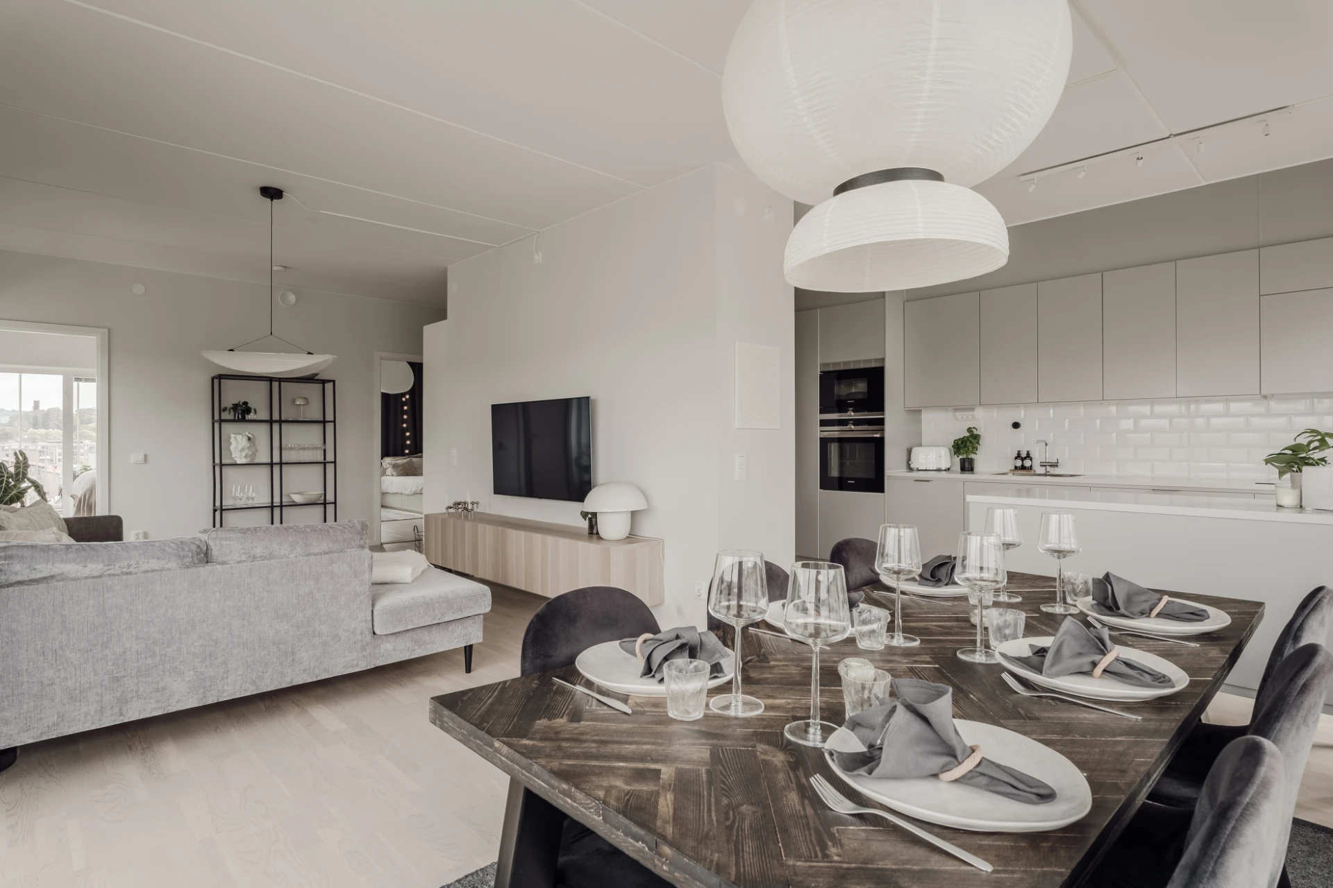 Vitlaserad ekparkett och ljust målade väggar med en fondvägg. I taket finns belysning med dimmerfunktion. Här finns plats att möblera med soffgrupp och tillhörande möblemang. Från vardagsrummet nås bostadens terrass.
