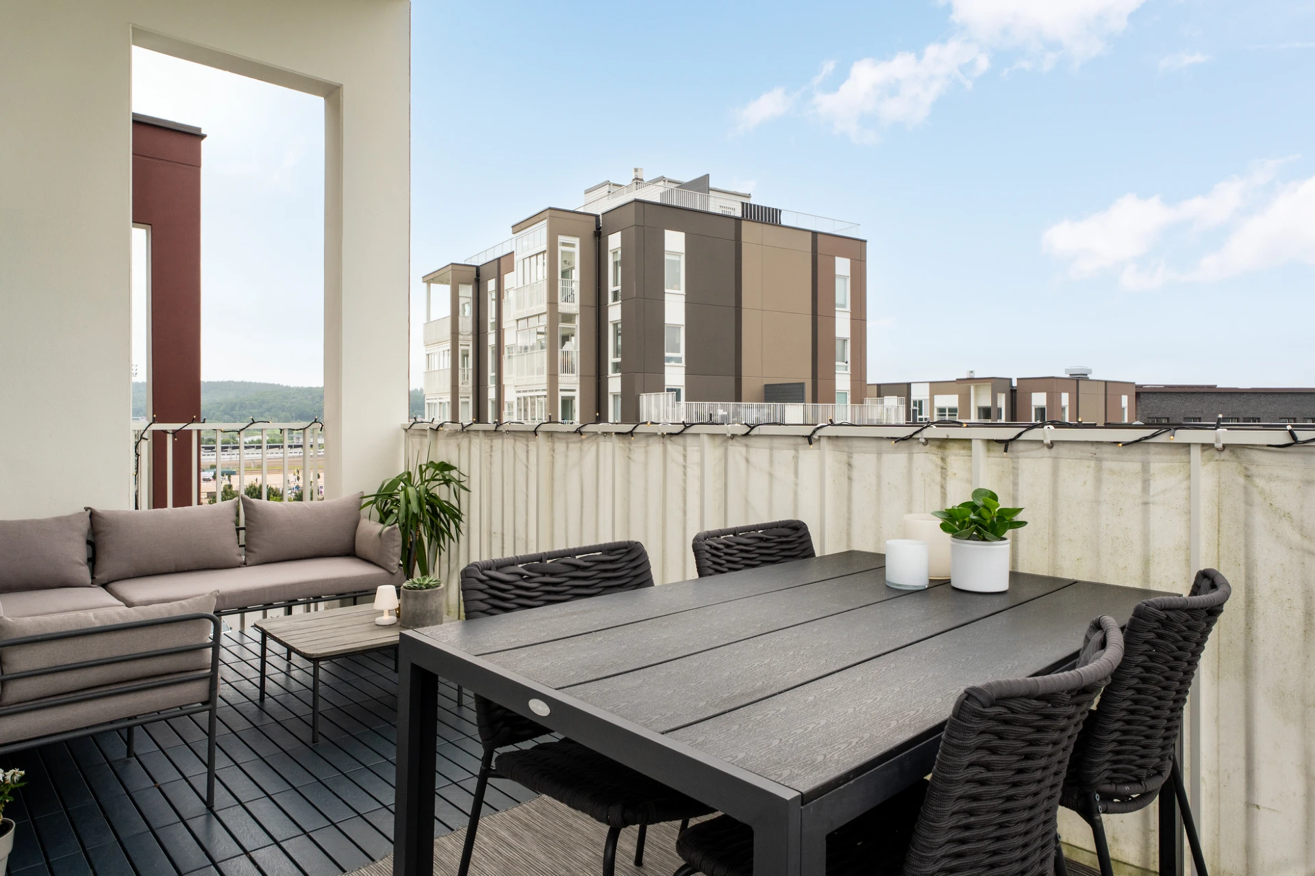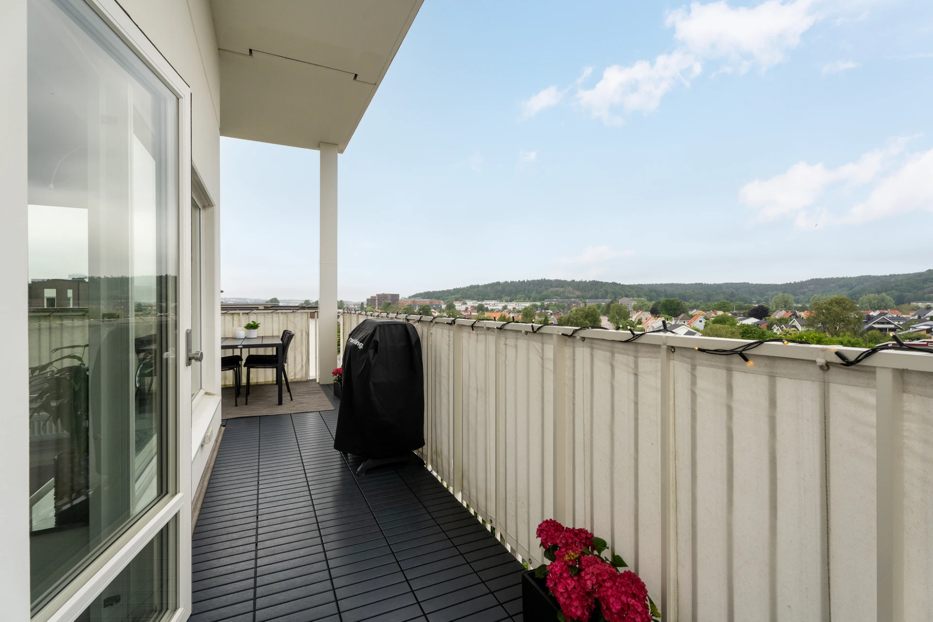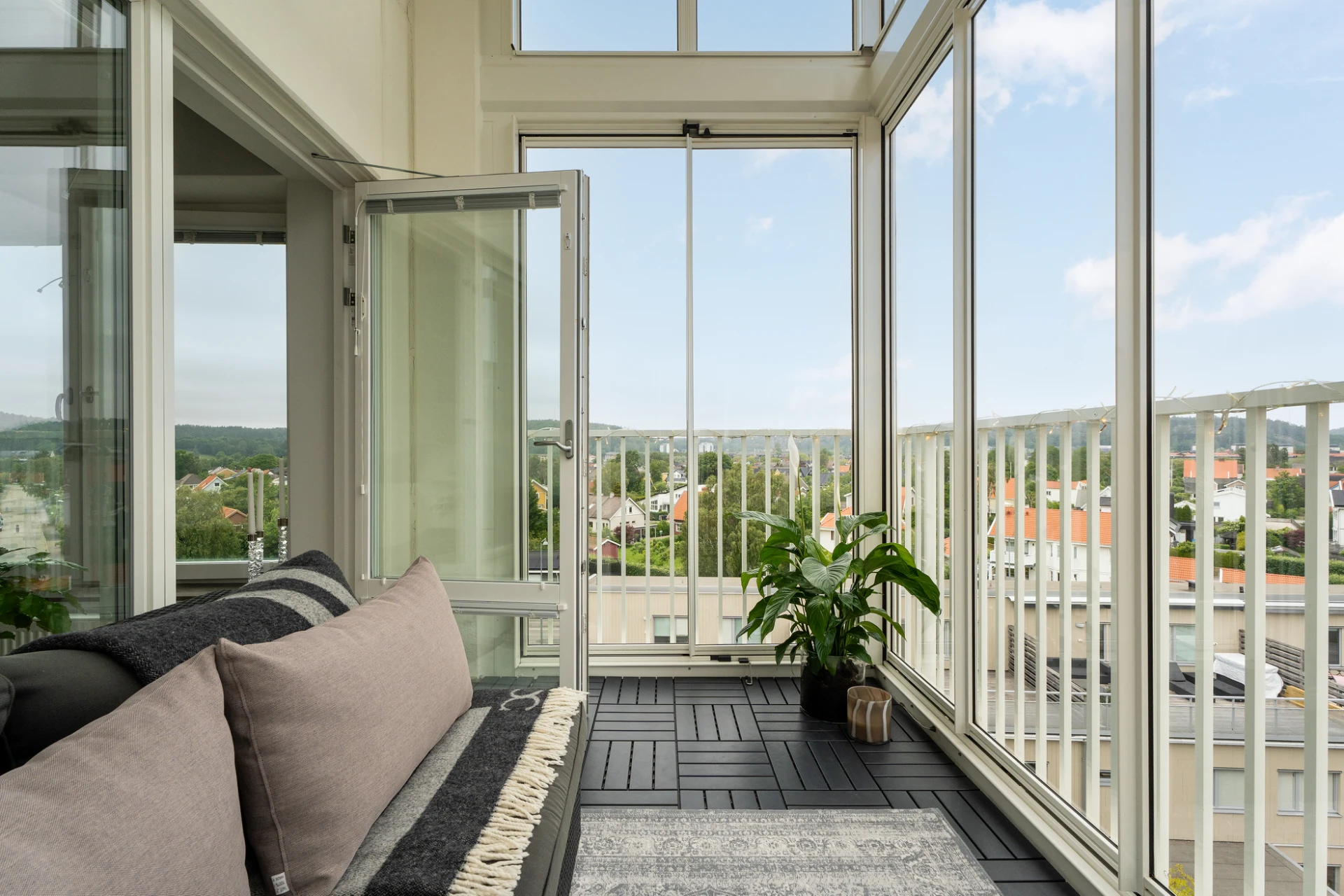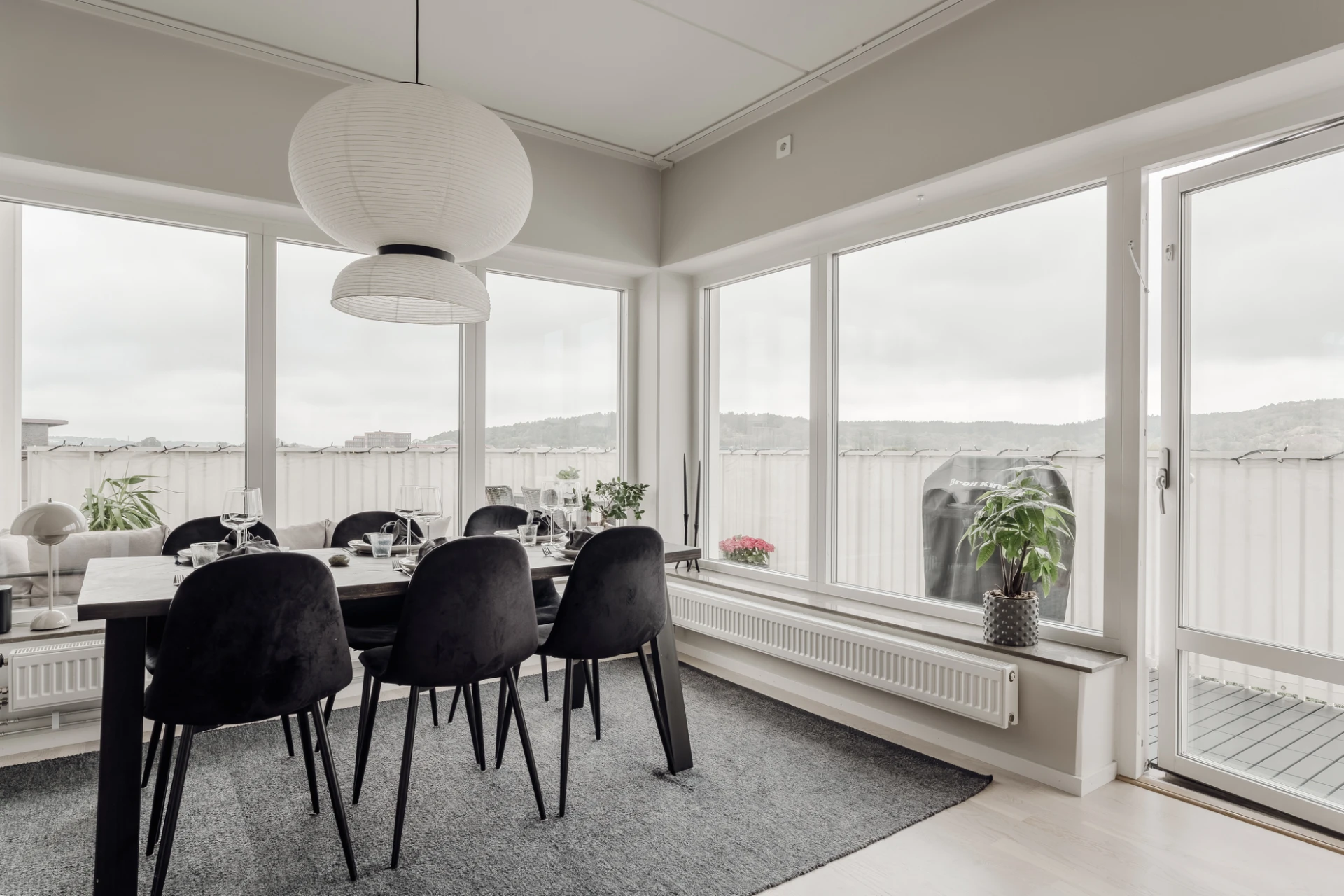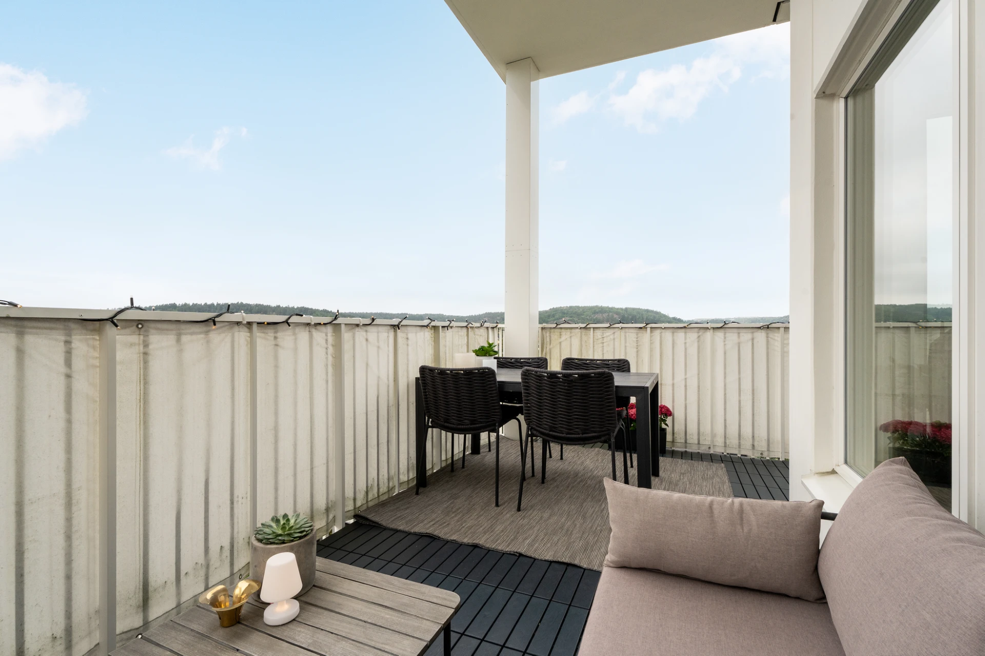 Vitlaserad ekparkett och ljust målade väggar med en fondvägg. I taket finns belysning med dimmerfunktion. Här finns plats att möblera med soffgrupp och tillhörande möblemang. Från vardagsrummet nås bostadens terrass.