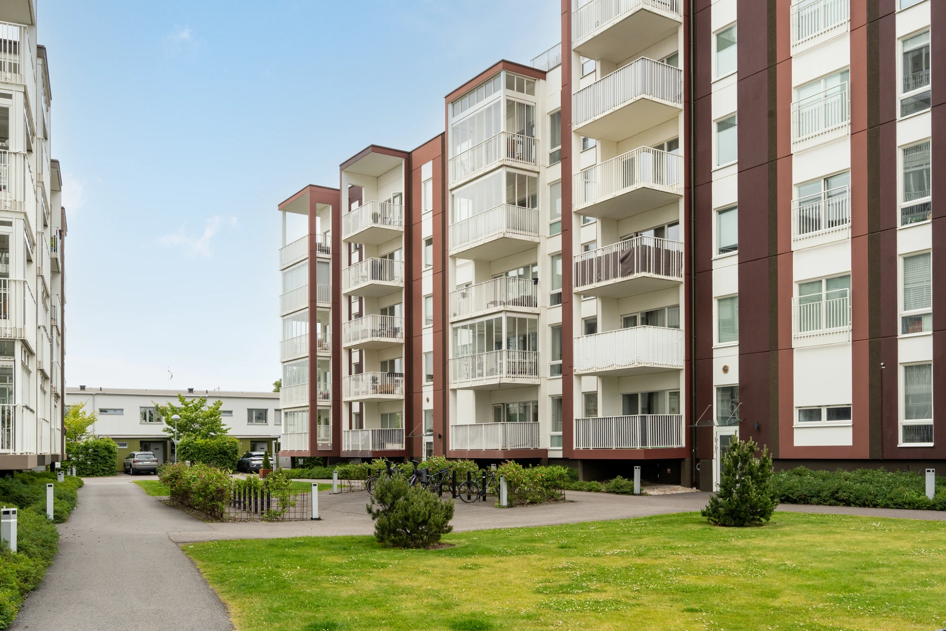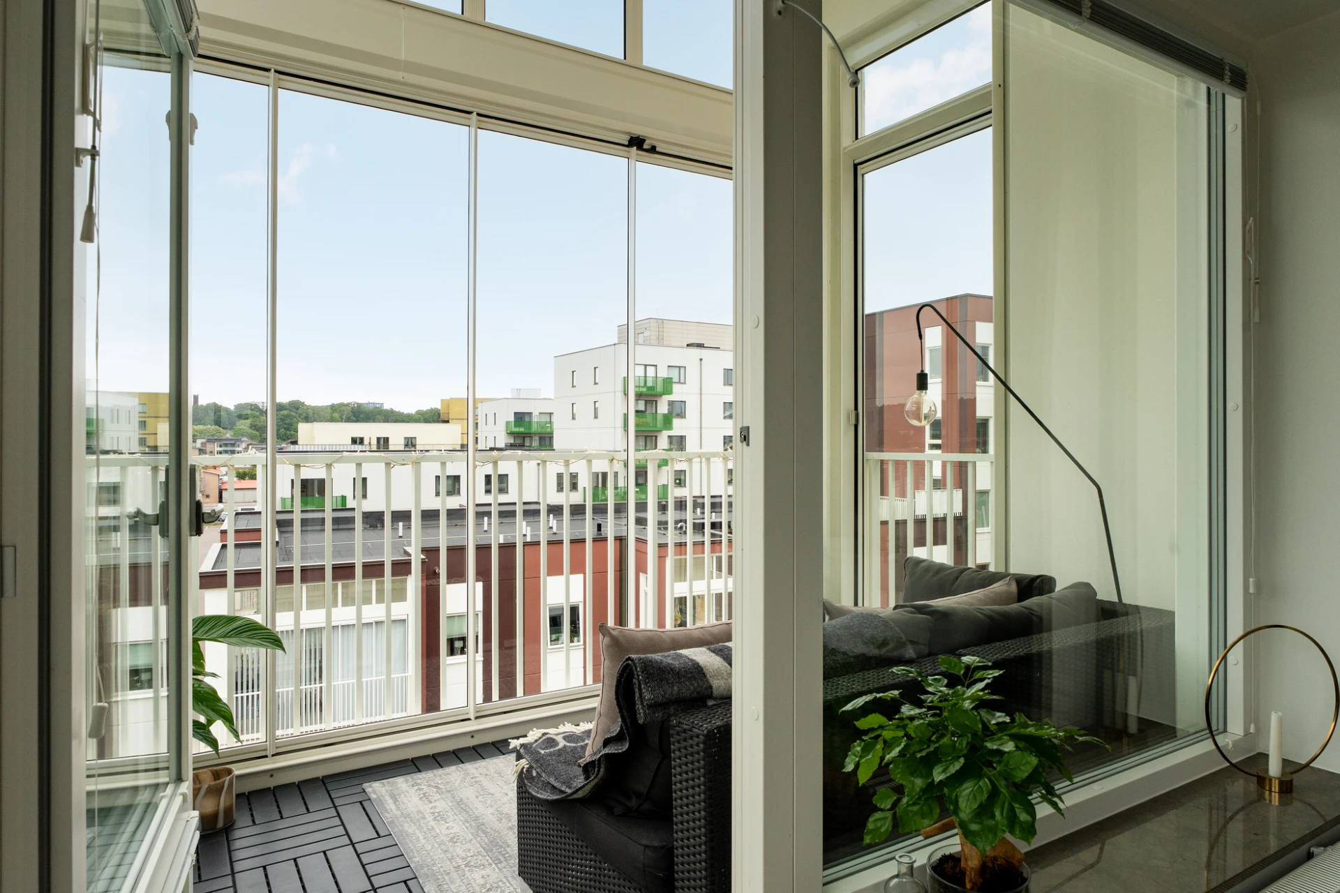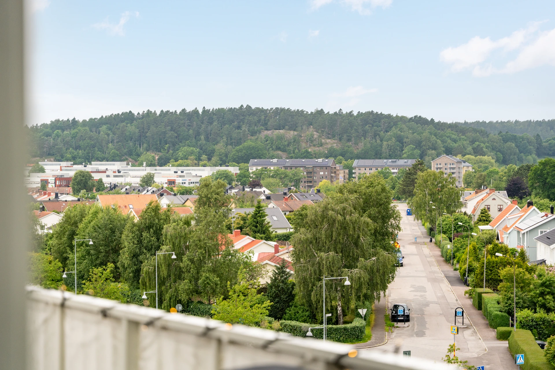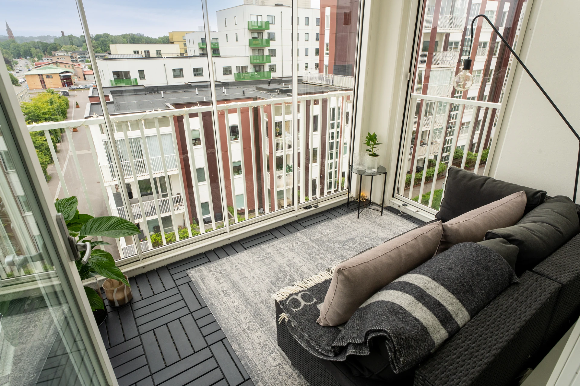 Vitlaserad ekparkett och ljust målade väggar med en fondvägg. I taket finns belysning med dimmerfunktion. Här finns plats att möblera med soffgrupp och tillhörande möblemang. Från vardagsrummet nås bostadens terrass.