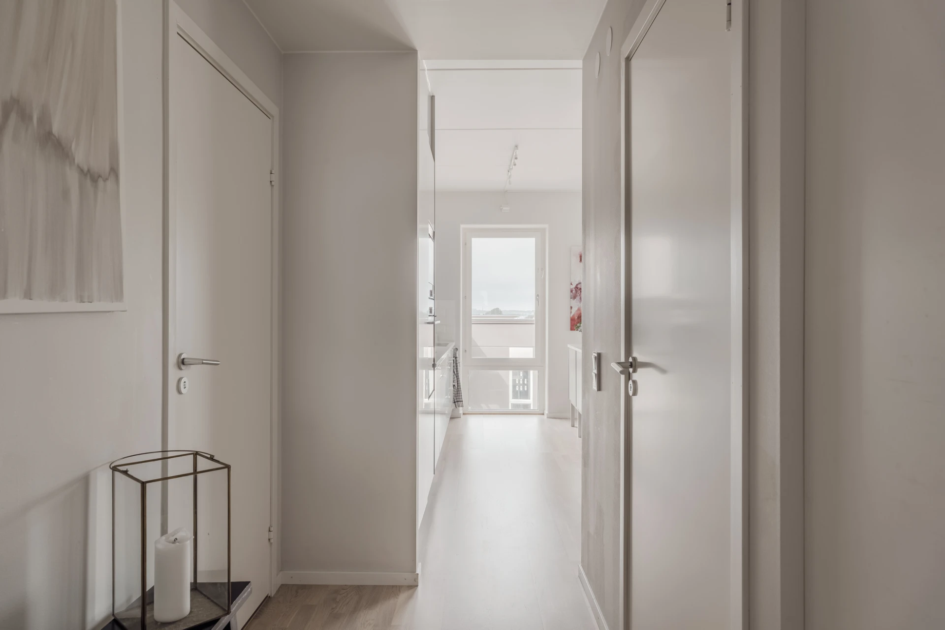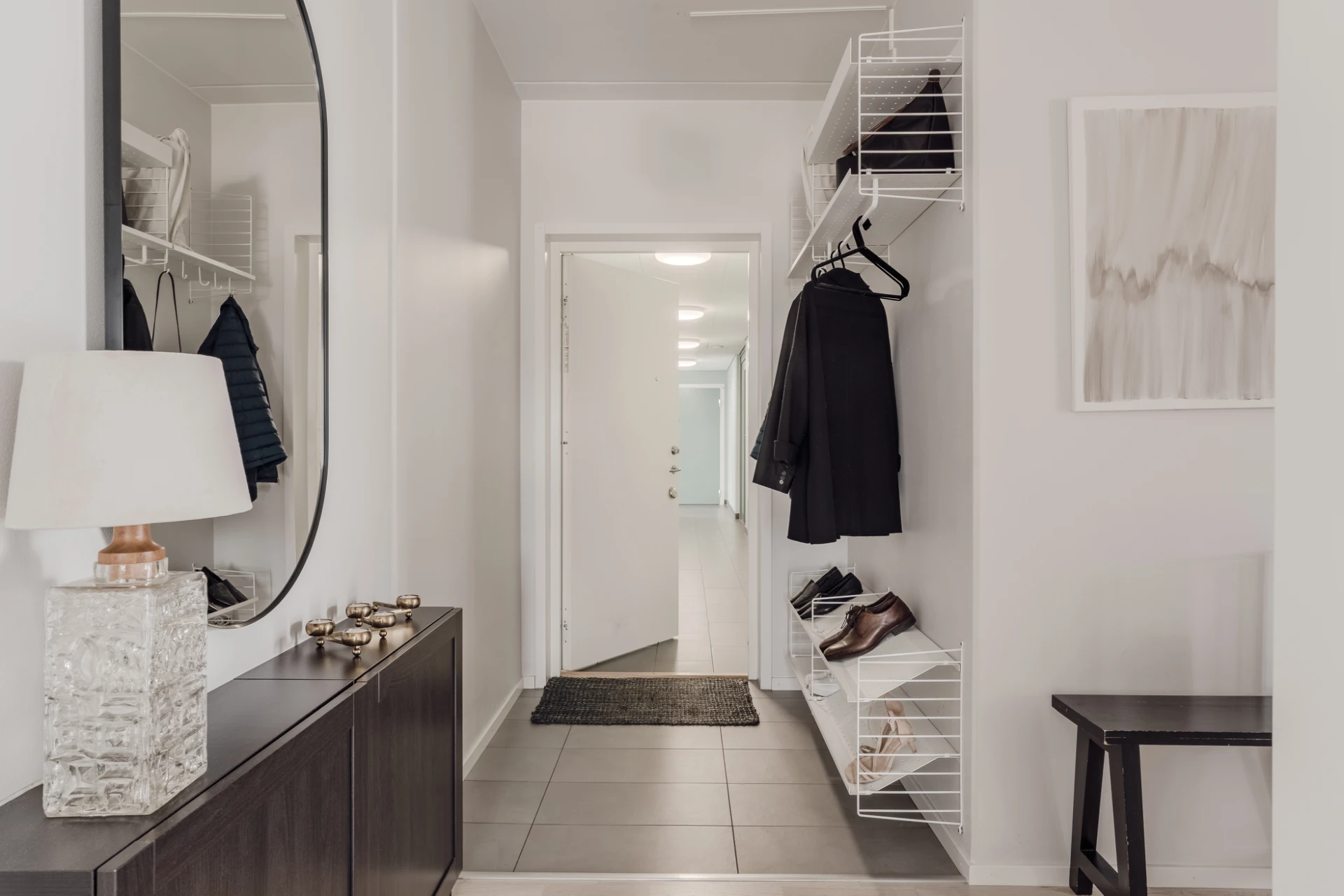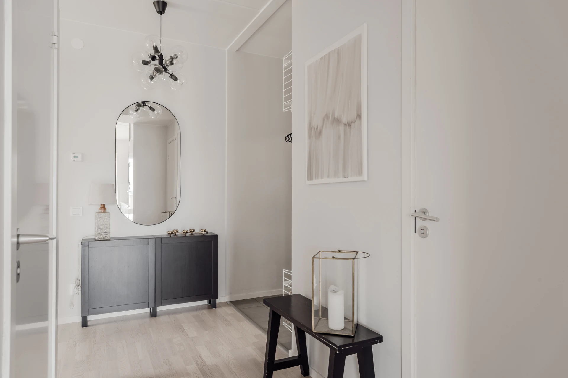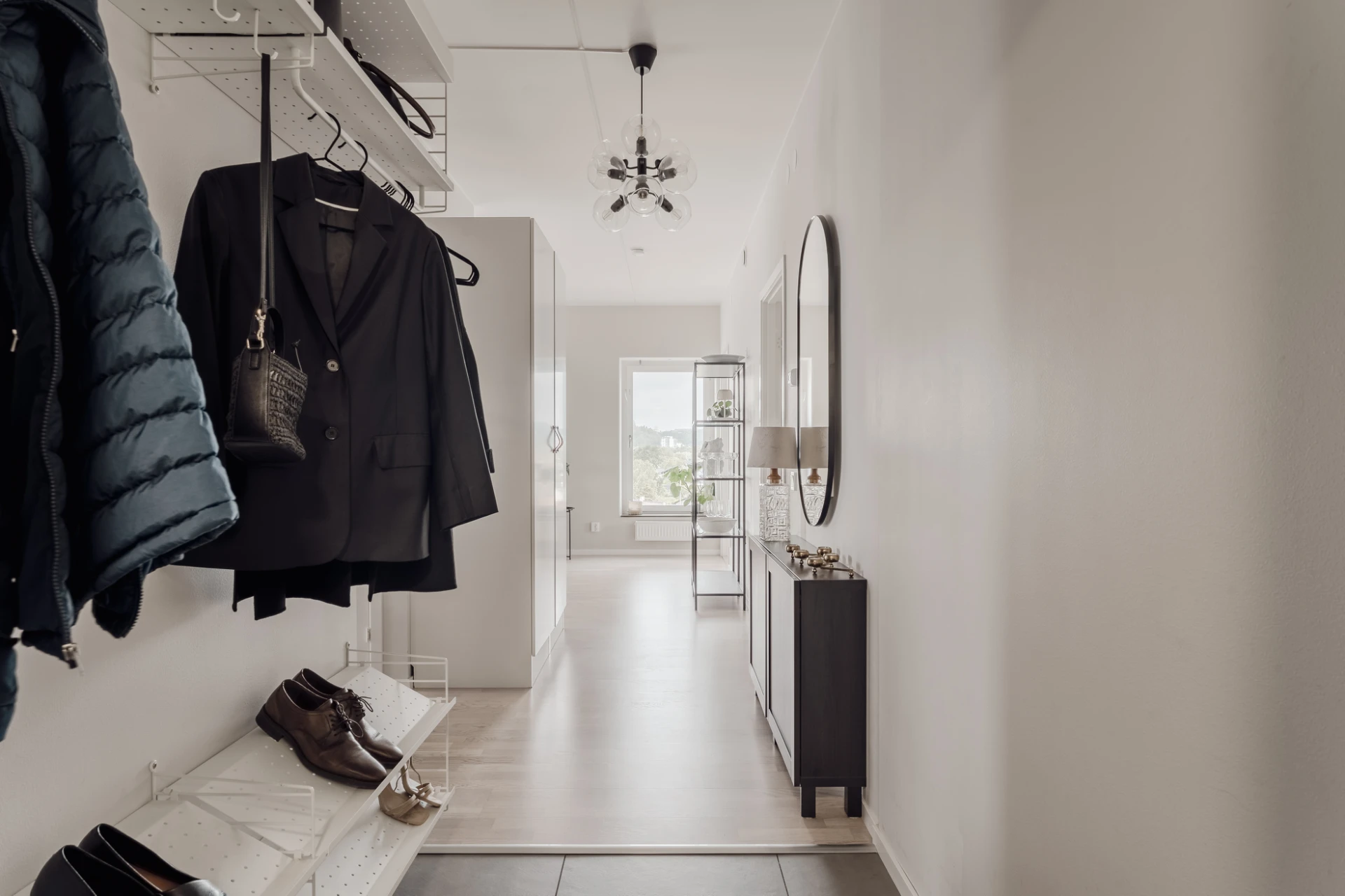 Grått klinkergolv närmast entrén och vitlaserad ekparkett längre in i hallen samt målade väggar ljusgrått. Takbelysning med dimmerfunktion. Här finns plats för avhängning av ytterkläder samt förvaring i en dubbelgarderob.