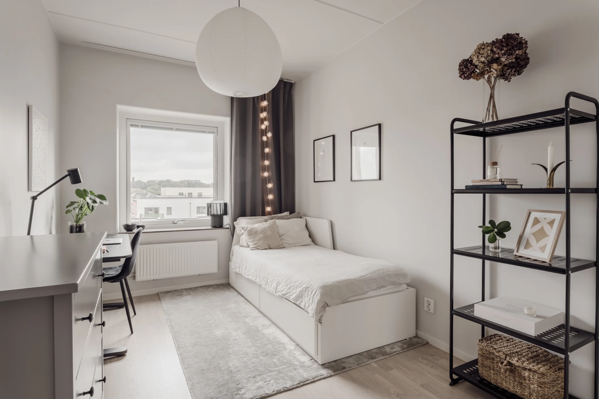 Vitlaserad ekparkett och vita väggar. Här finns plats för säng, skrivbord och förvaring i en platsbyggd dubbelgarderob (Vedum).