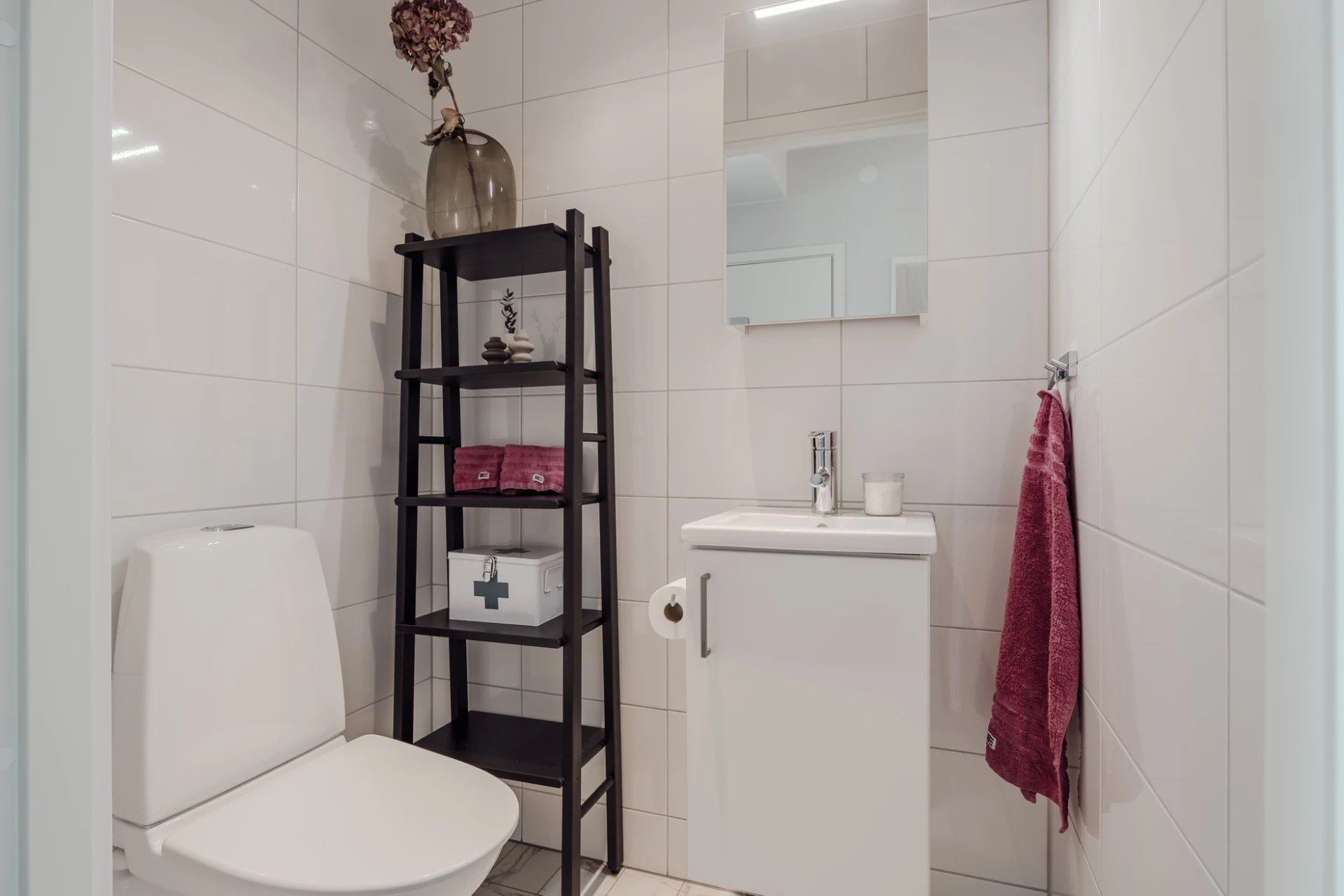 Marmormönstrat klinkergolv och vitt kakel på väggarna. Här finns WC, handfat med kommod samt spegelskåp.