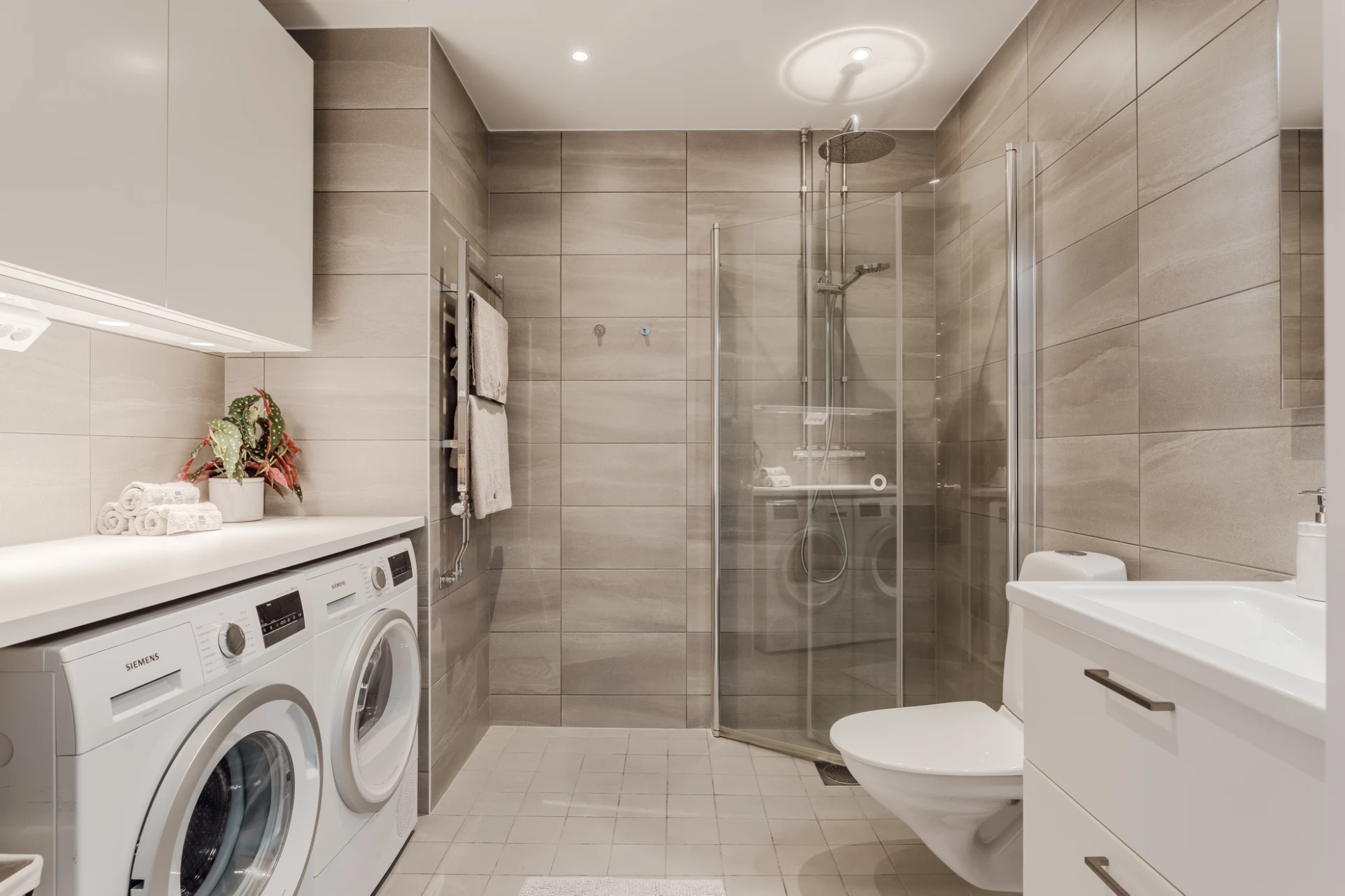 Ljusgrått klinkergolv med golvvärme och kaklade väggar i beige. I taket finns belysning med dimmerfunktion. Badrummet är utrustat med WC, handfat med kommod, spegel med belysning, handdukstork, takdusch med vikbara glasväggar, väggskåp, avlastningsbänk samt tvättmaskin och torktumlare.