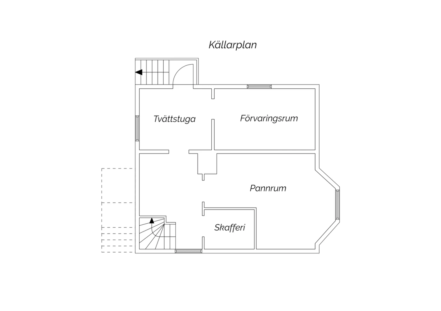 Källarplan med tvättstuga och direktutgång till bilplatsen. Pannrum och förvaringsrum.