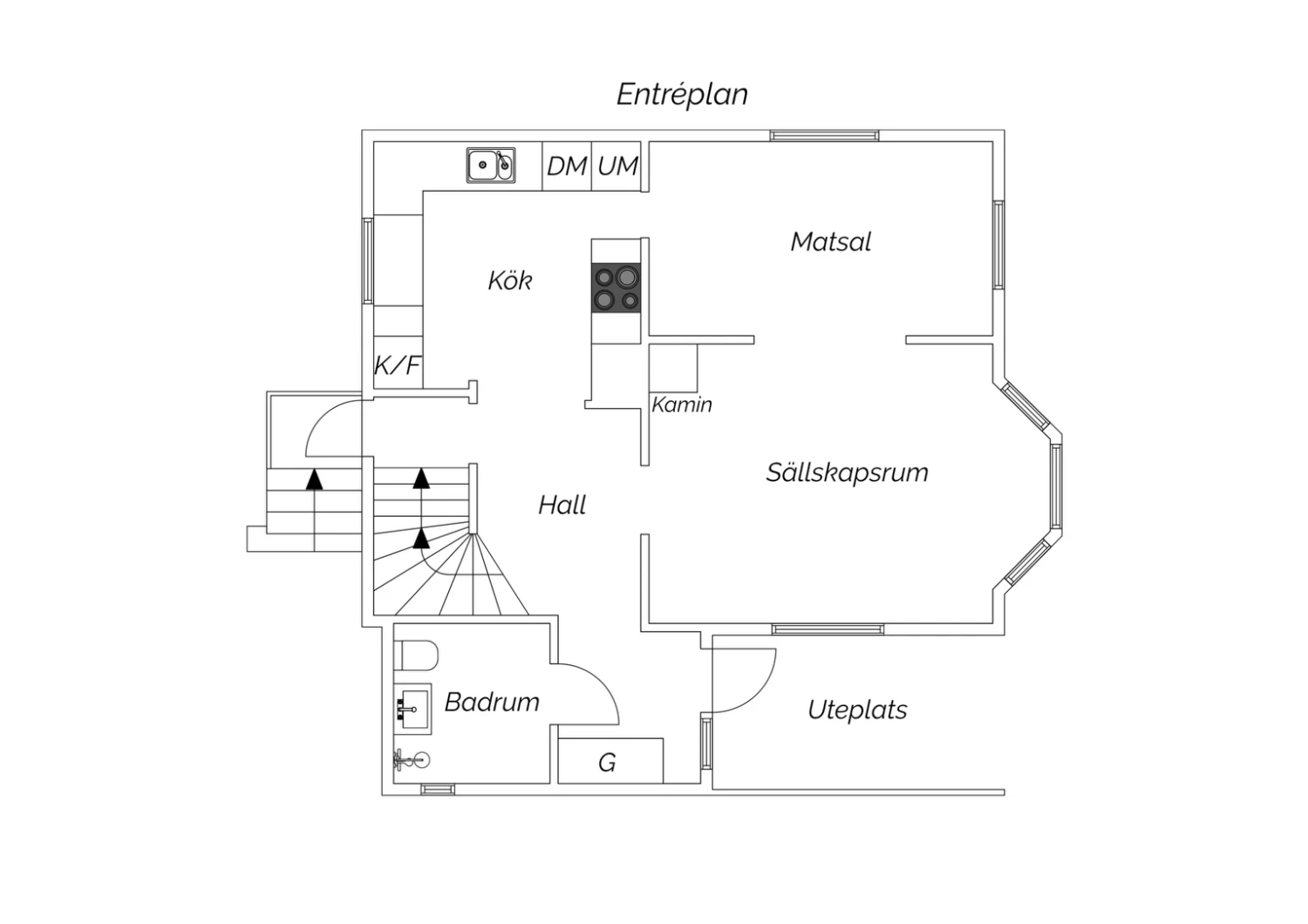 Fint rum med burspråk som ger karaktär och skänker ett fin ljus. Kamin värmer gott och höjer mysfaktorn.