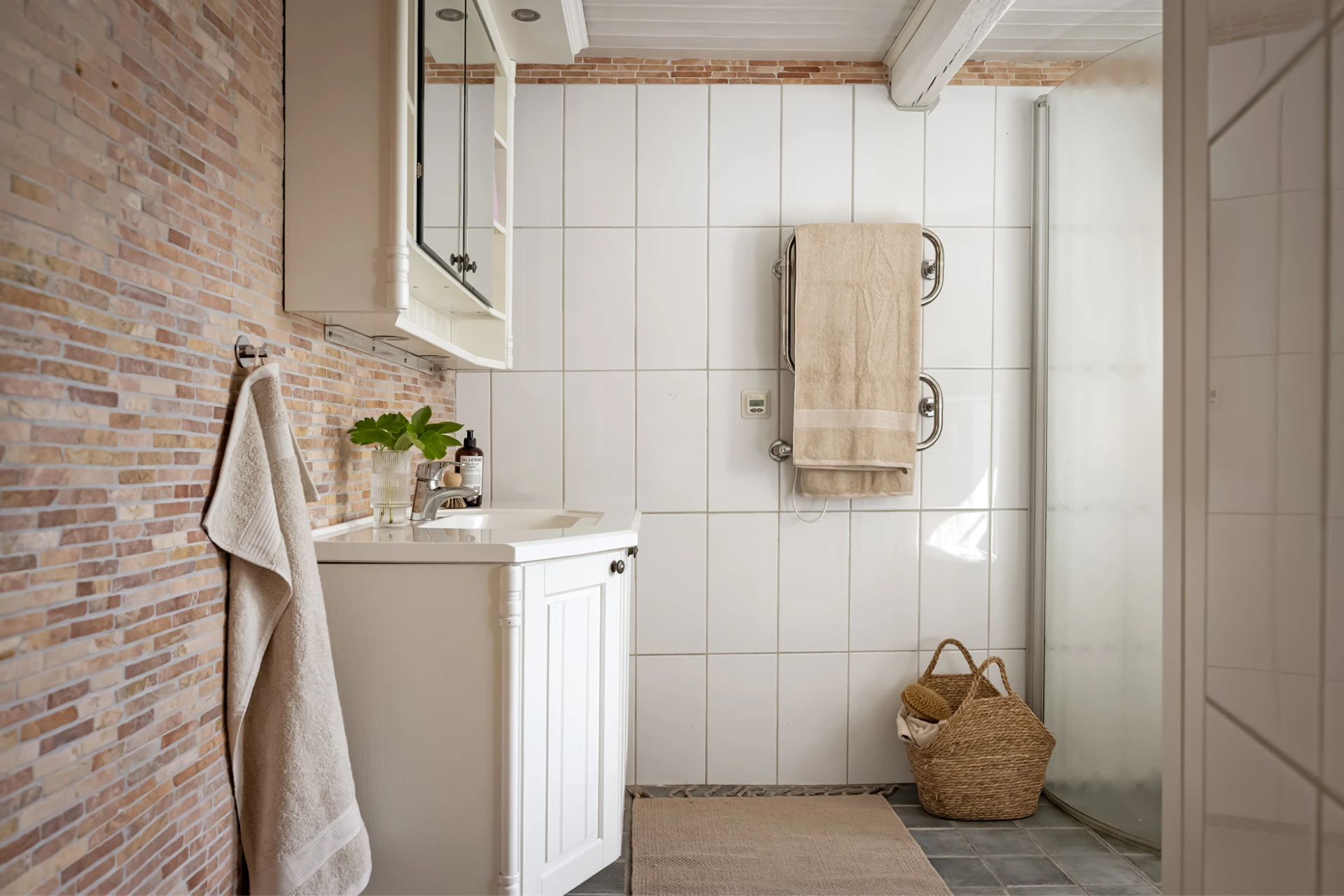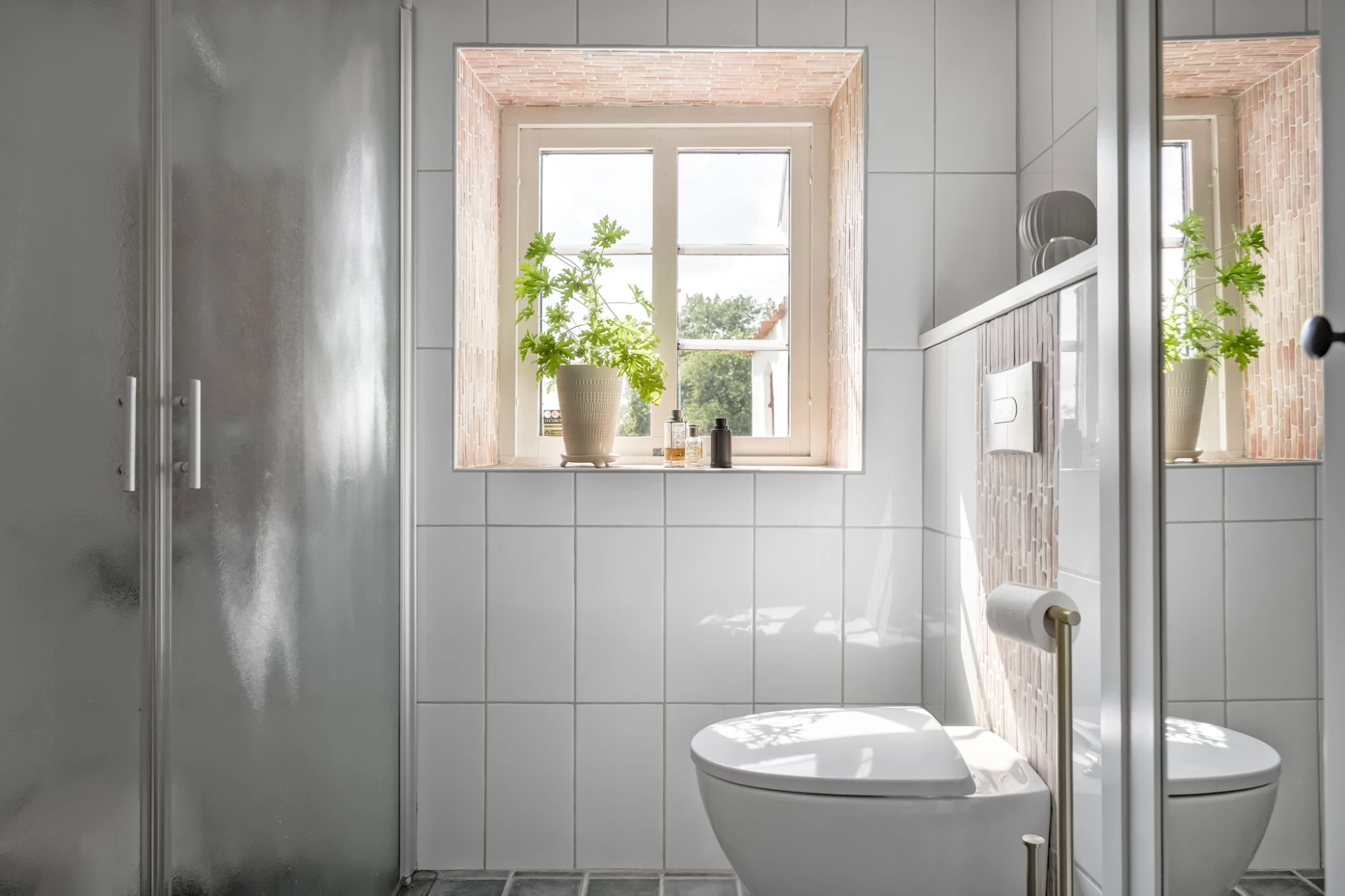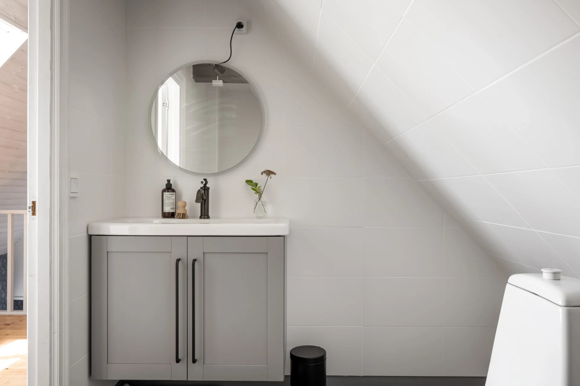 Duschrum på ovanplan med WC och tvättställ och duschhörna.