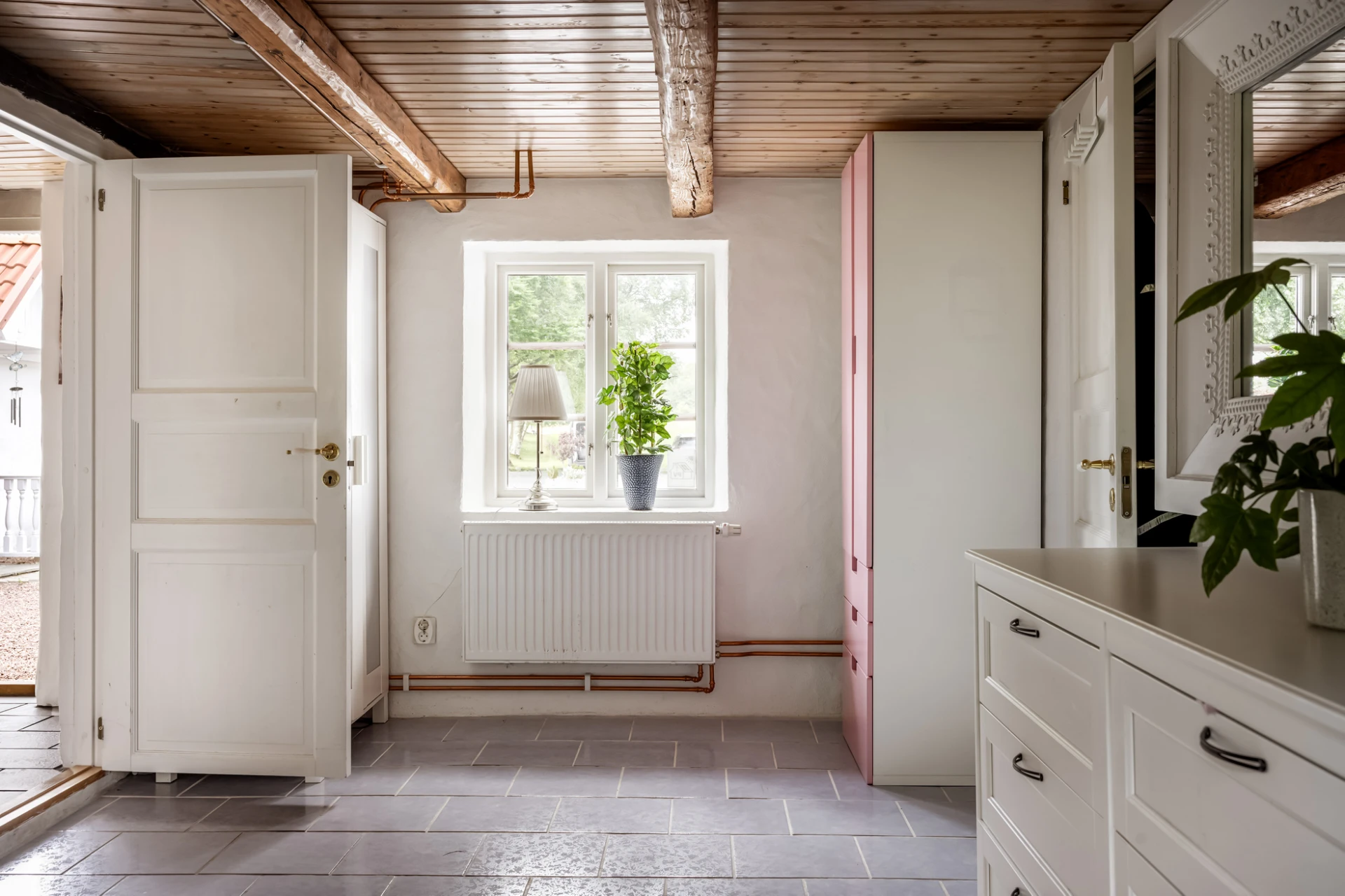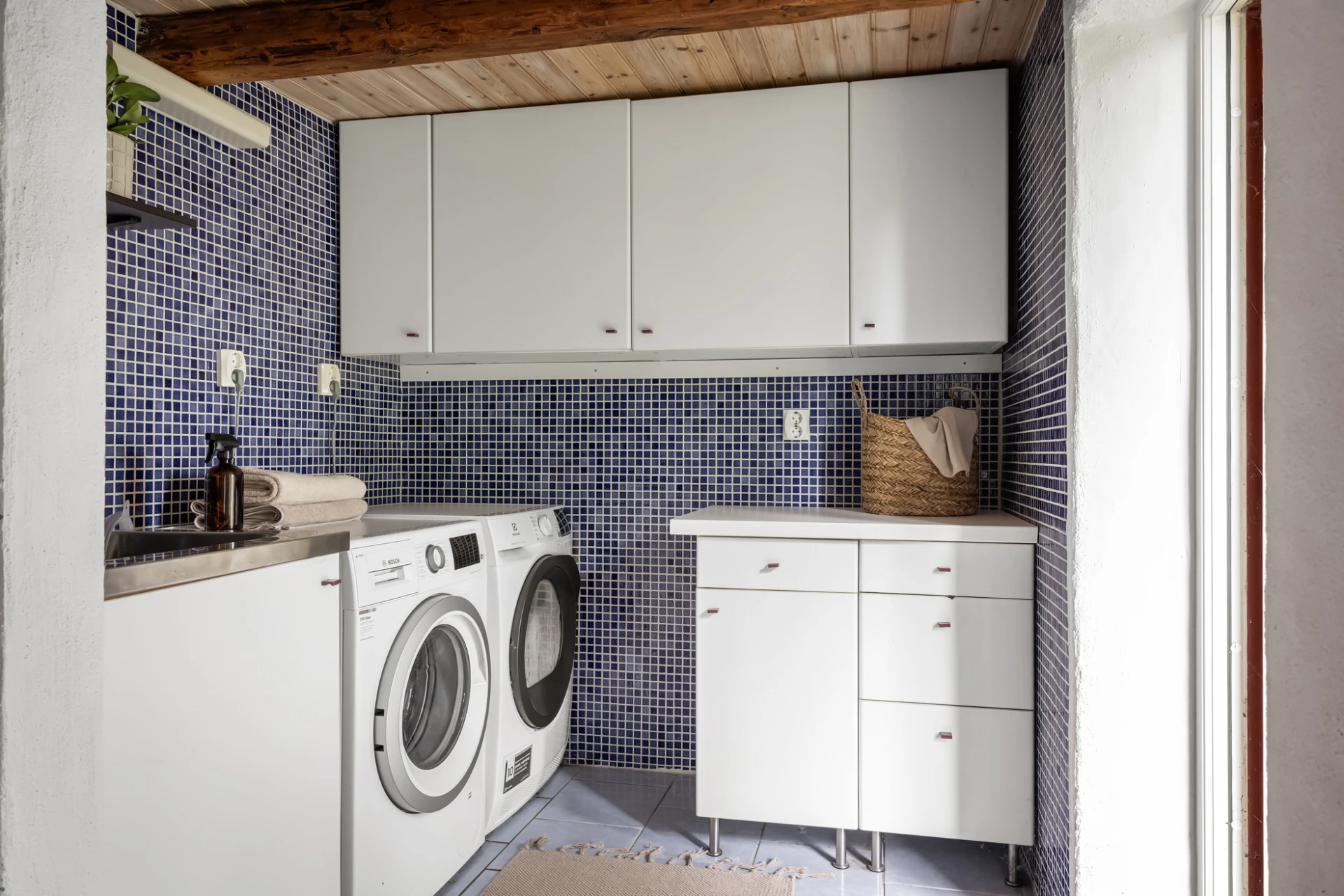 Groventré och stor tvättstuga. Tvättmaskin och torktumlare. Samt panna.