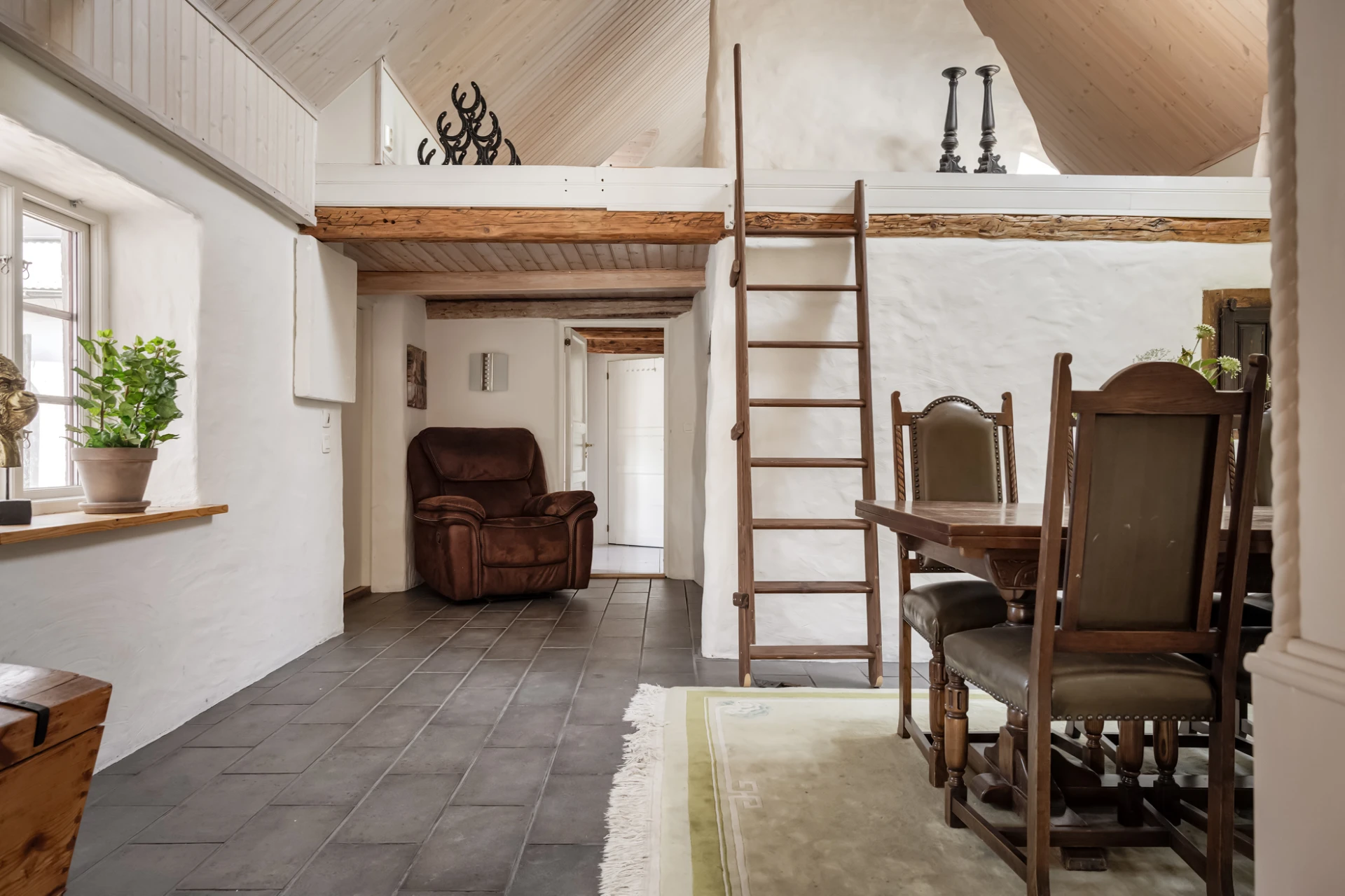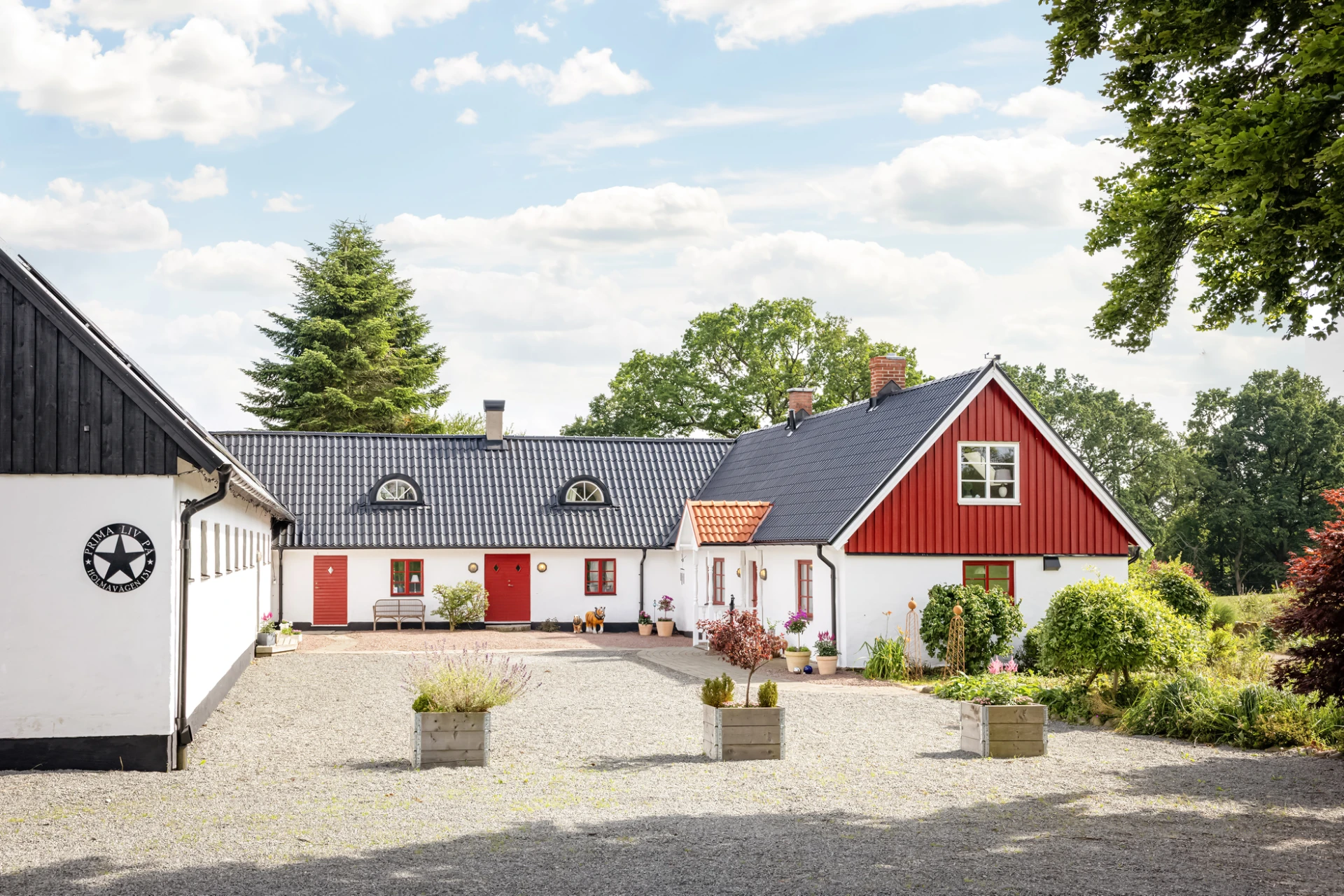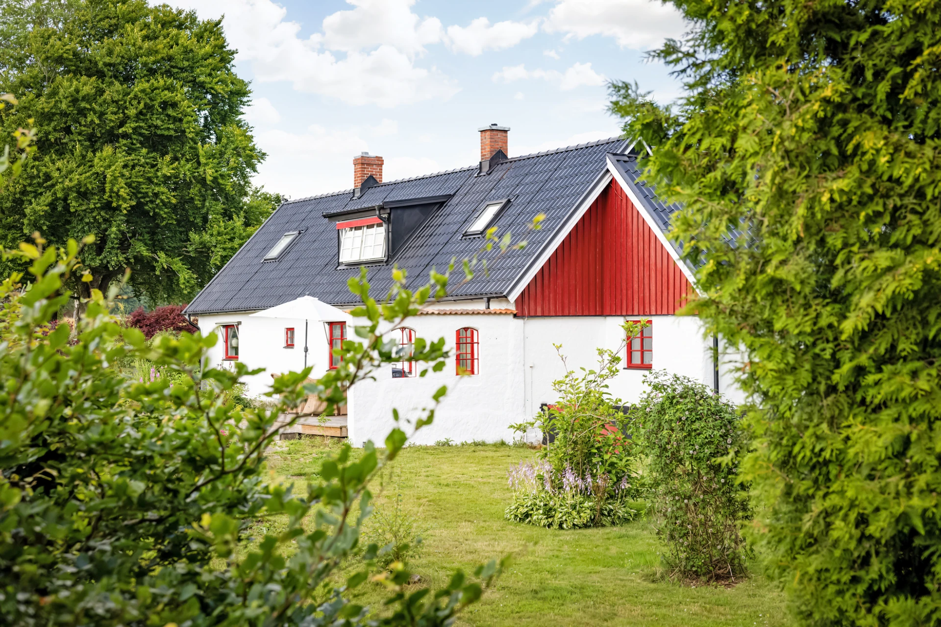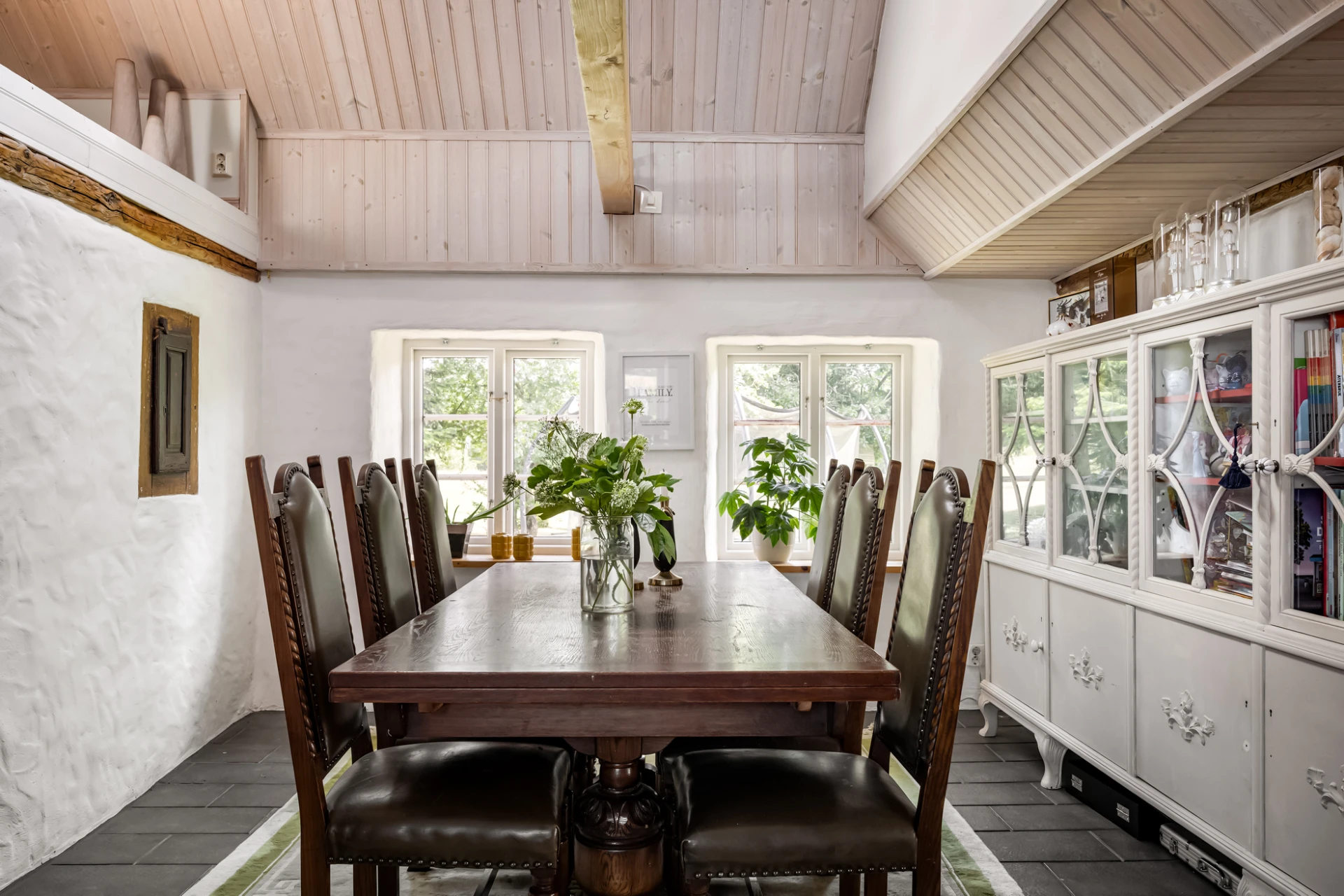 Bostadshuset, en vitputsad trelängad skånelänga med röda spröjsade fönster, är både traditionell och modern. Den rymmer ca 200 kvm med smakfulla materialval och bevarade originaldetaljer, såsom den charmiga bakugnen. Matplatsen är öppen i nock med generös rymd och vackert ljusinsläpp – perfekt för långa middagar med vänner eller familj.