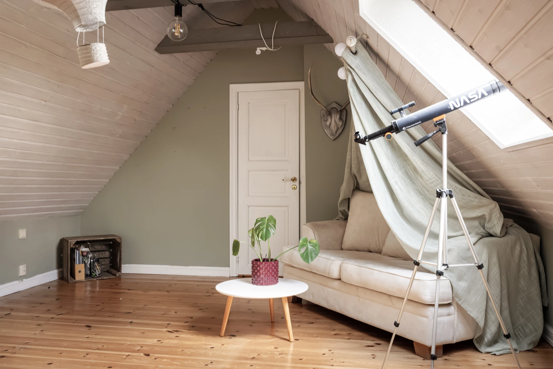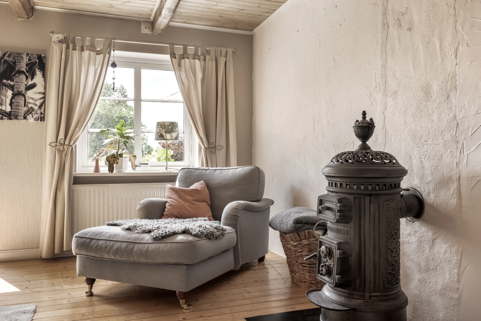 Uppvärmning sker genom jordvärme och huset är utrustat med solceller för en hållbar vardag. För kyliga kvällar finns härlig kamin som sprider värme och stämning.