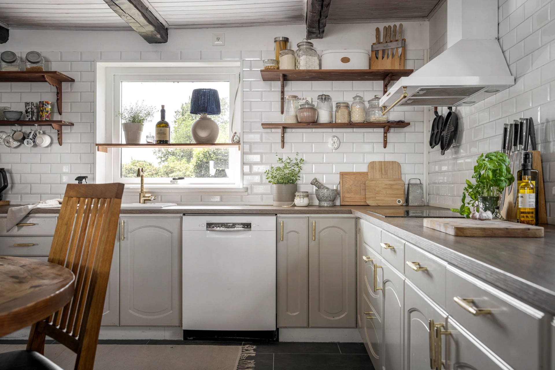 Stort kök med plats för matmöblemang. Klinkersgolv. Maskinell utrustning är spis, spisfläkt, diskmaskin, kylskåp och frysskåp. Murstock finns för den som eventuellt vill koppla till en kamin.