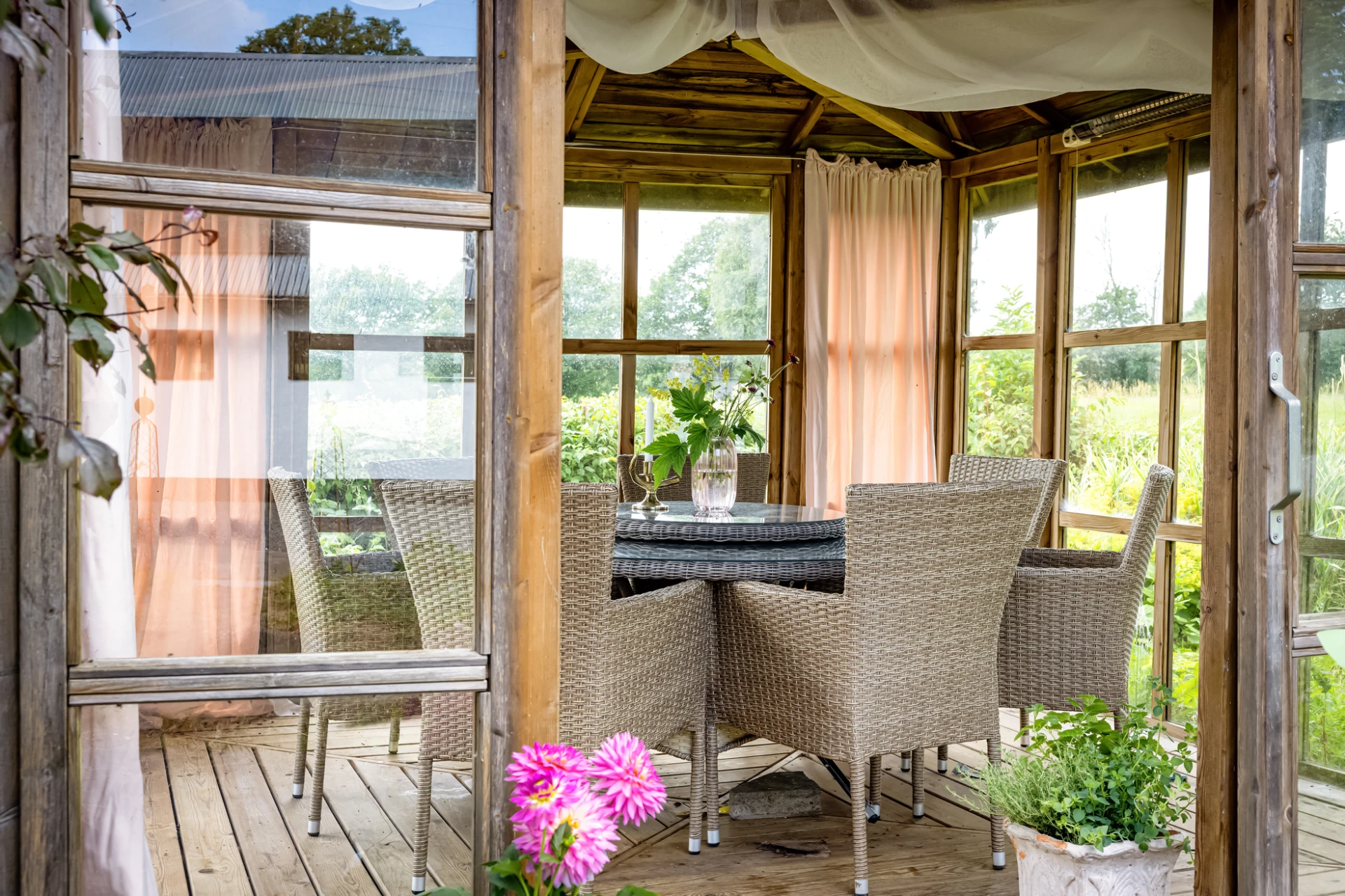 Sällskapsrum med trägolv. Värmande kamin. Utgång till uteplats i väster.