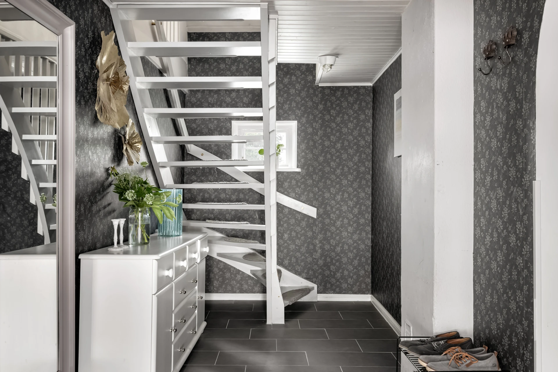 Välkommen in! Entré med stengolv. Ingång till kök och vardagsrum. Trappa till ovanplan.