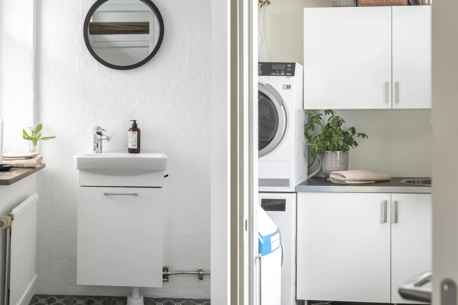 Praktisk och uppskattad av alla i hushållet – här finns en fullutrustad tvättstuga med gott om plats för både tvätt och förvaring. Funktionella ytor och smart planering gör vardagens sysslor enklare och mer trivsamma, samtidigt som rummet behåller en luftig och ordnad känsla.