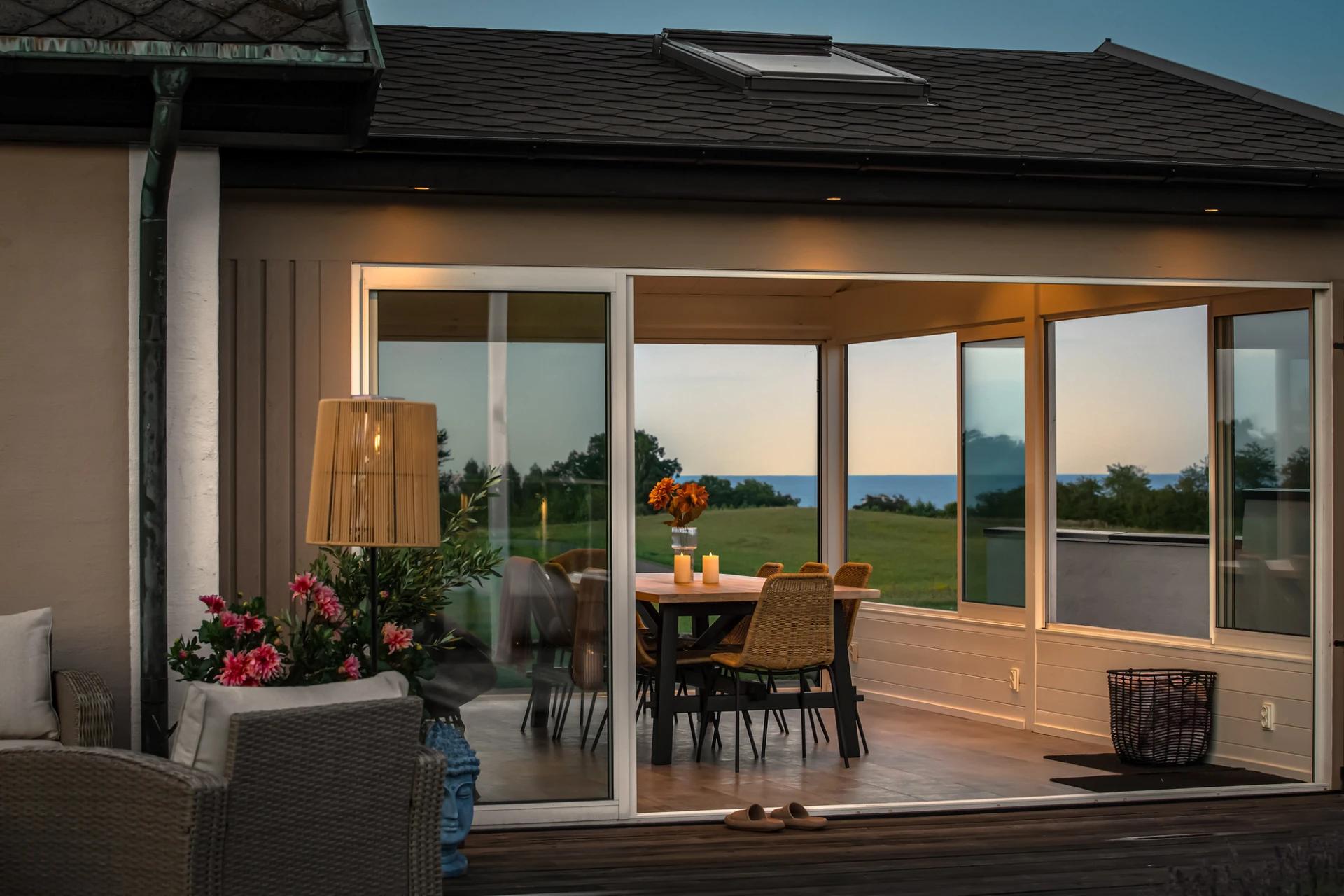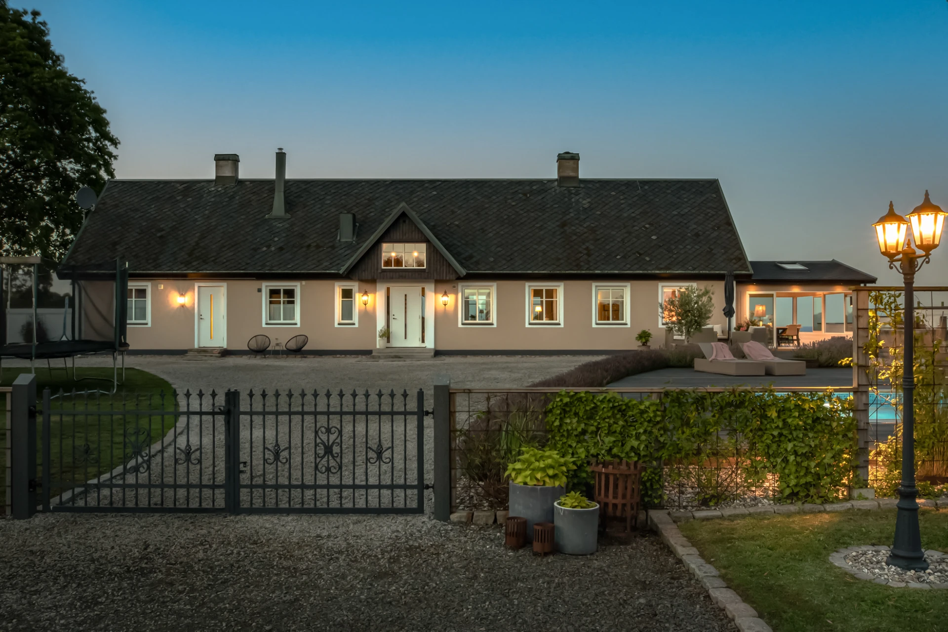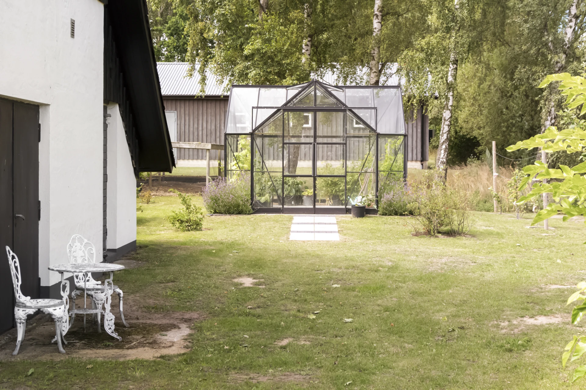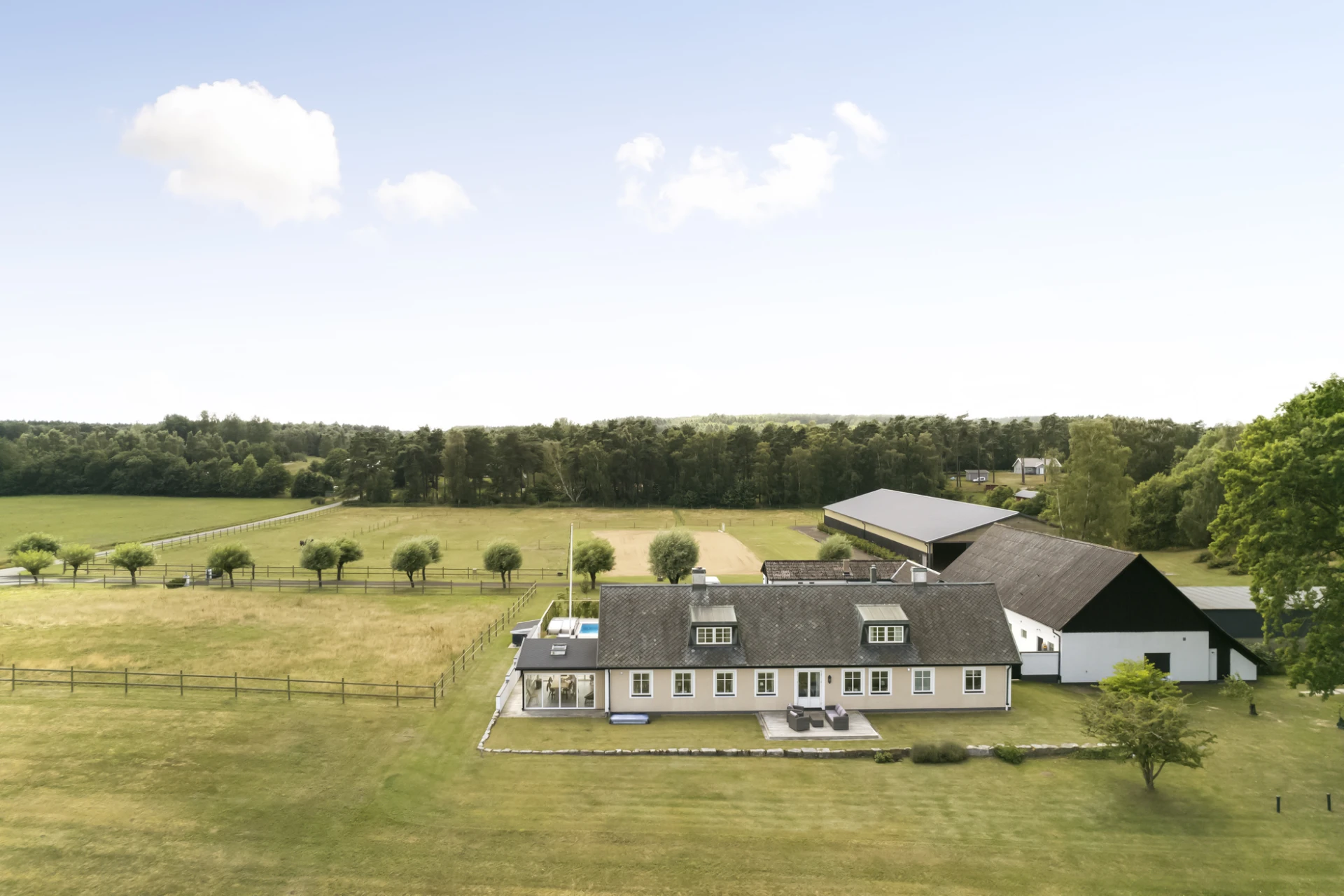 År 2021 tillkom det härliga uterummet som förlänger bostaden och bjuder in naturen året runt. Här flödar ljuset in och skapar en luftig känsla, samtidigt som rummet blir en självklar plats att samlas på för både vardag och fest. Att sitta här och blicka ut över hagarna med hästarna i blickfånget är en upplevelse som gör livet på gården alldeles extra speciellt.