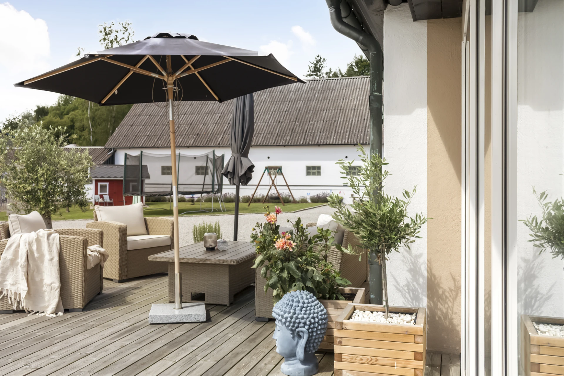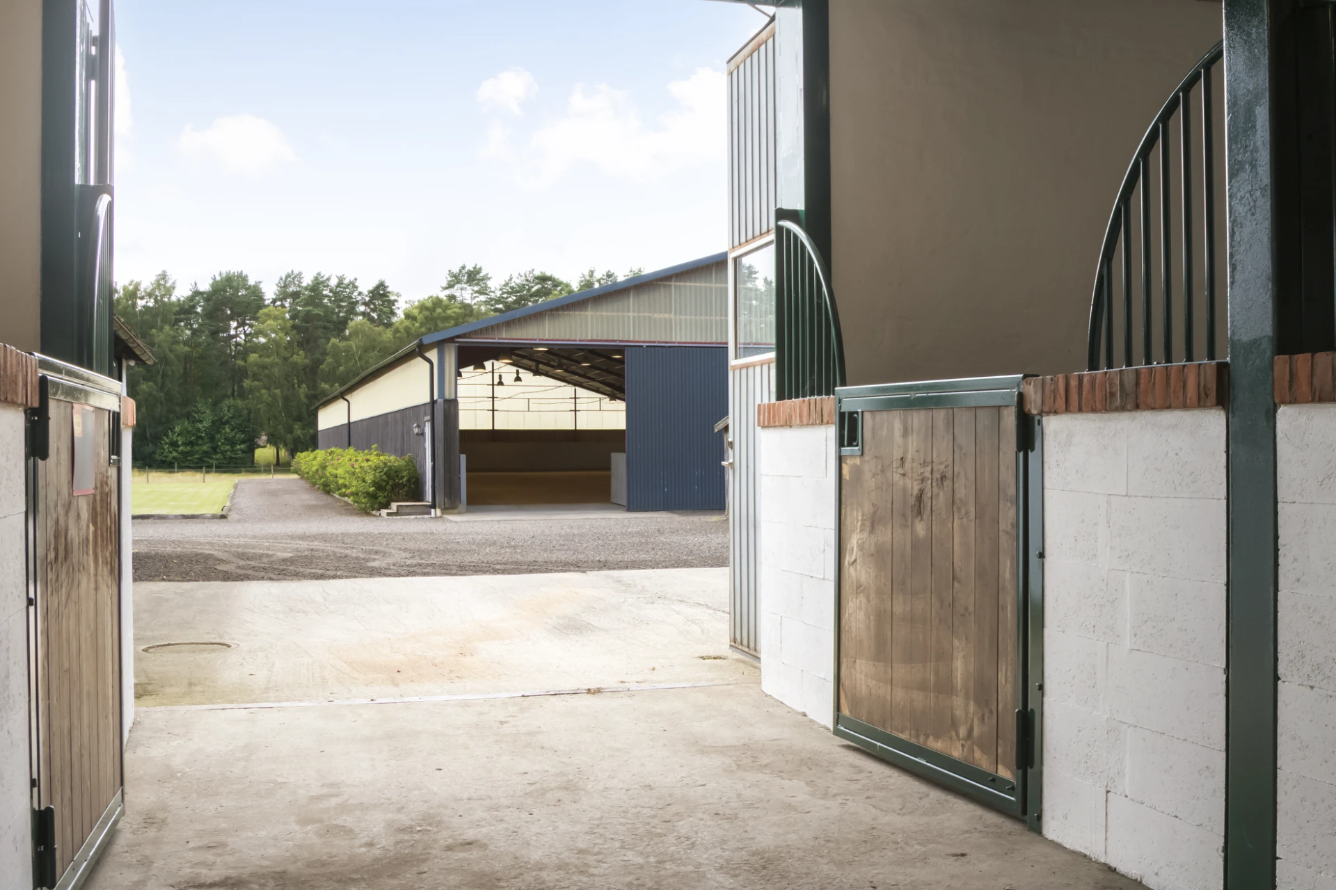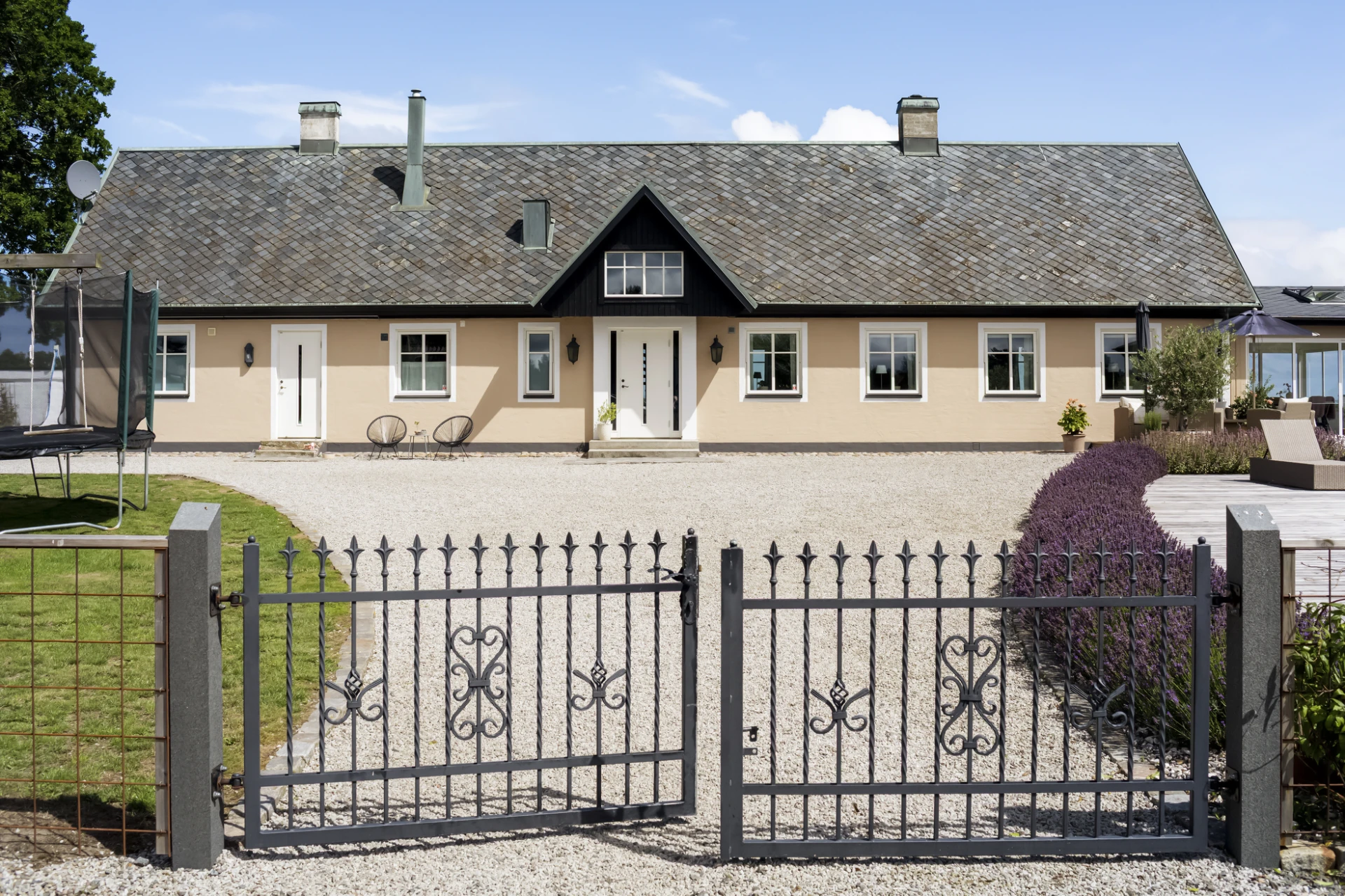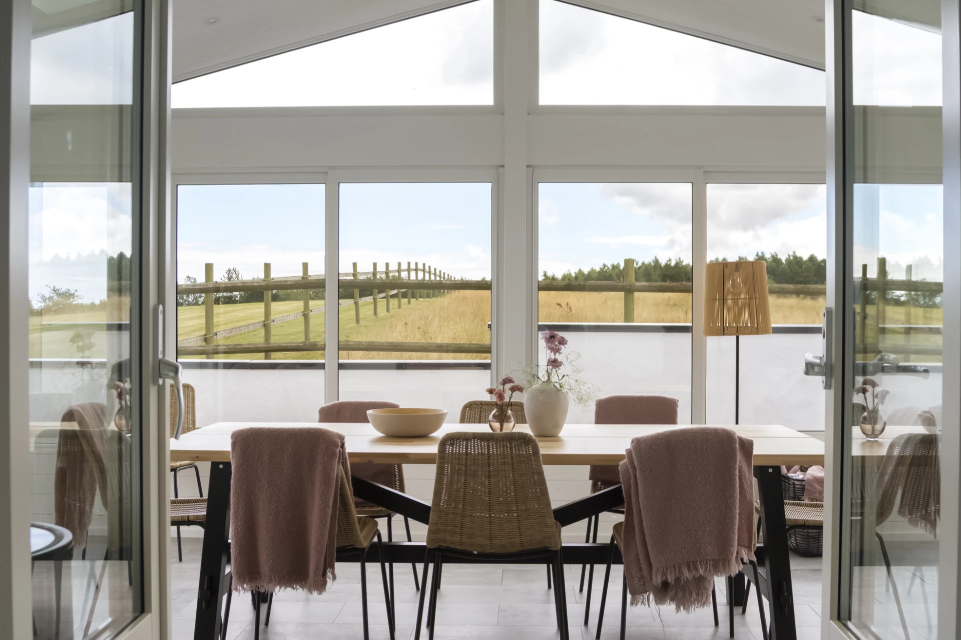 År 2021 tillkom det härliga uterummet som förlänger bostaden och bjuder in naturen året runt. Här flödar ljuset in och skapar en luftig känsla, samtidigt som rummet blir en självklar plats att samlas på för både vardag och fest. Att sitta här och blicka ut över hagarna med hästarna i blickfånget är en upplevelse som gör livet på gården alldeles extra speciellt.