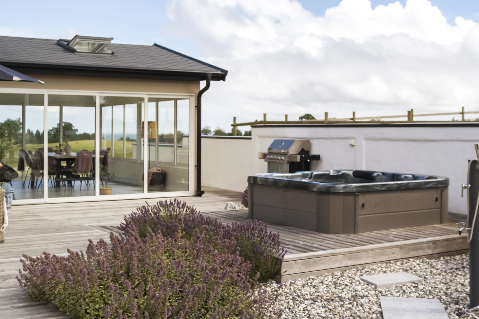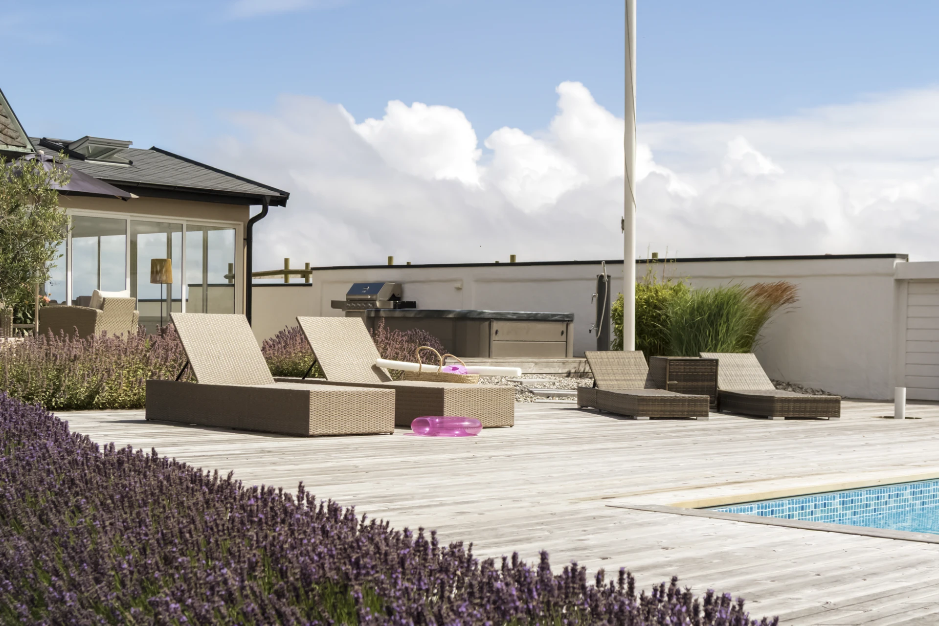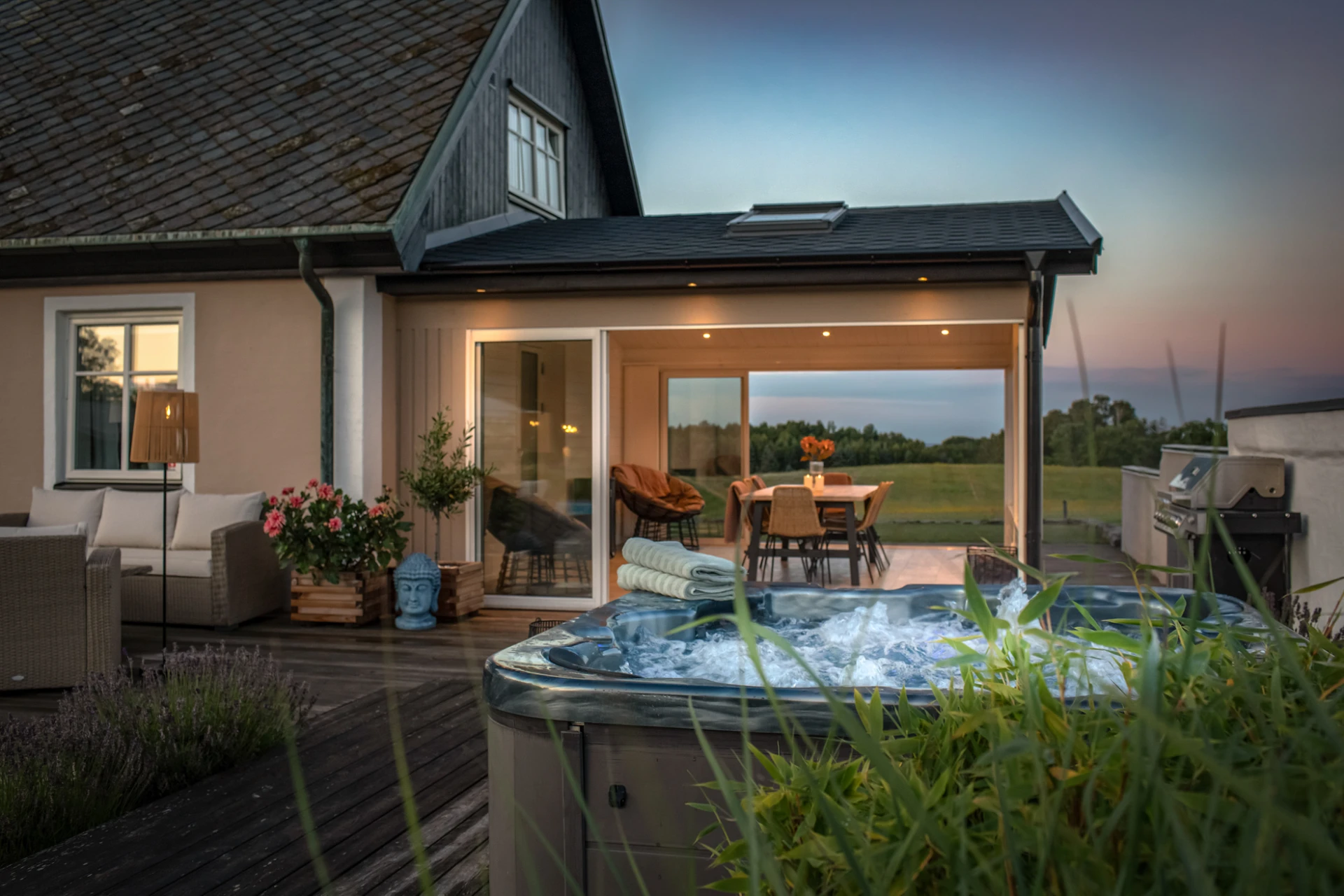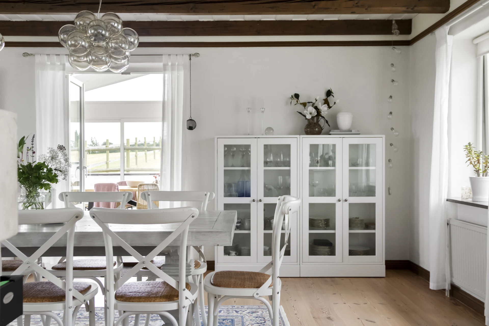 År 2021 tillkom det härliga uterummet som förlänger bostaden och bjuder in naturen året runt. Här flödar ljuset in och skapar en luftig känsla, samtidigt som rummet blir en självklar plats att samlas på för både vardag och fest. Att sitta här och blicka ut över hagarna med hästarna i blickfånget är en upplevelse som gör livet på gården alldeles extra speciellt.