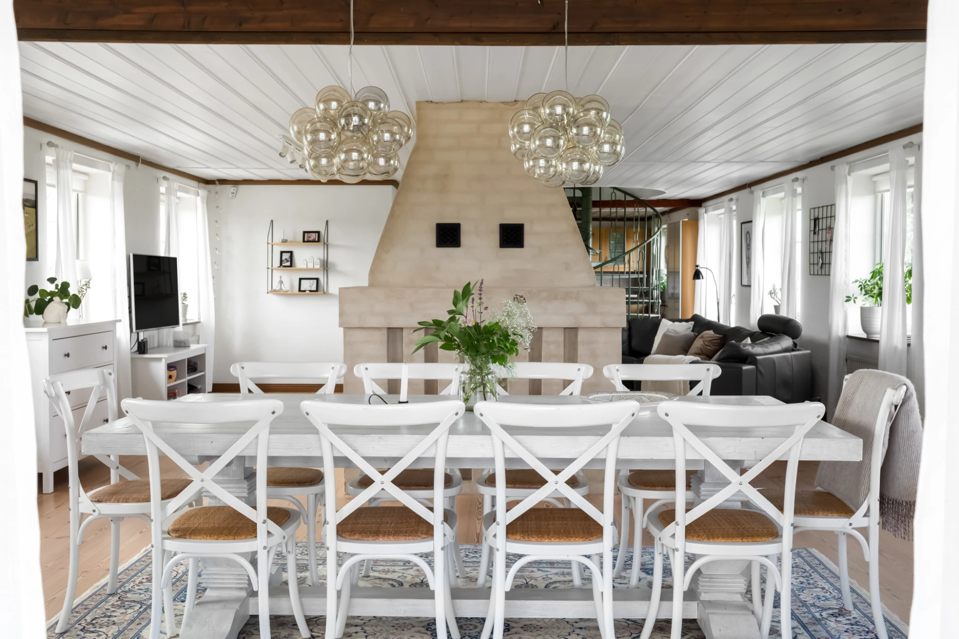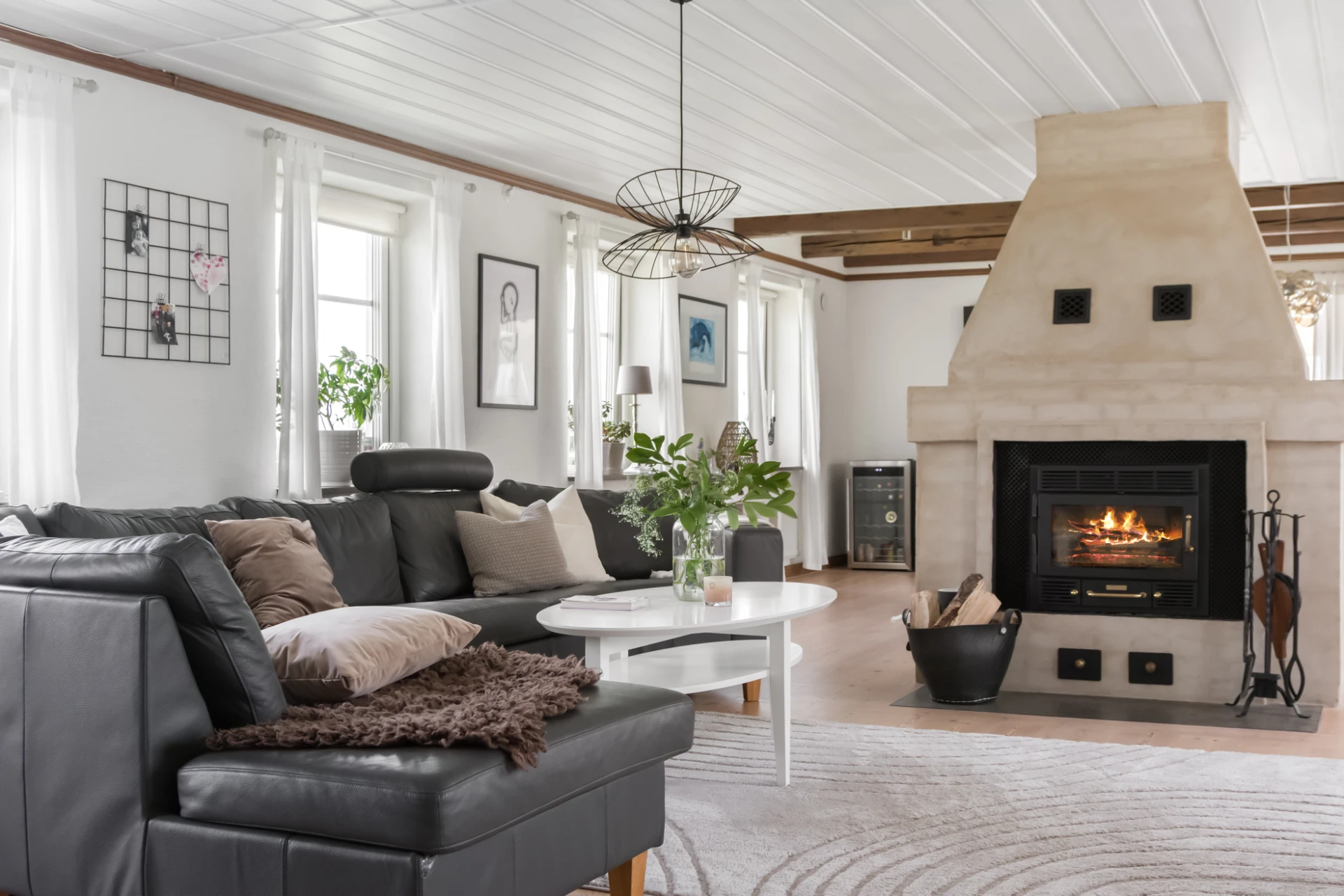 I direkt anslutning till köket öppnar det fantastiska sällskapsrummet upp sig – en inbjudande yta där den majestätiska kaminen i rummets mitt sätter tonen. Här samlas familj och vänner för avkoppling, umgänge och värme, i en miljö som både imponerar och omfamnar. Ett rum att slå sig ner i och verkligen njuta av.