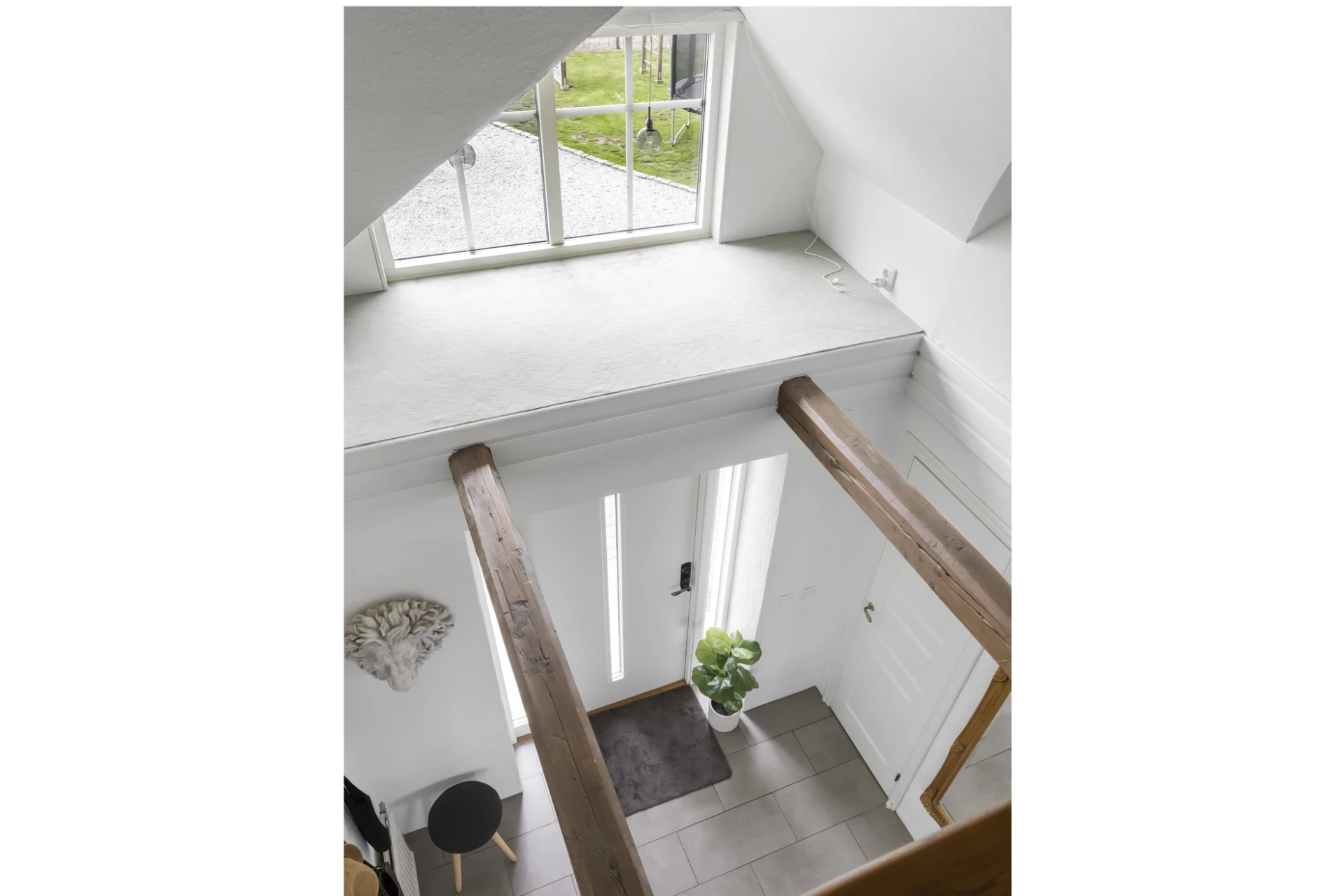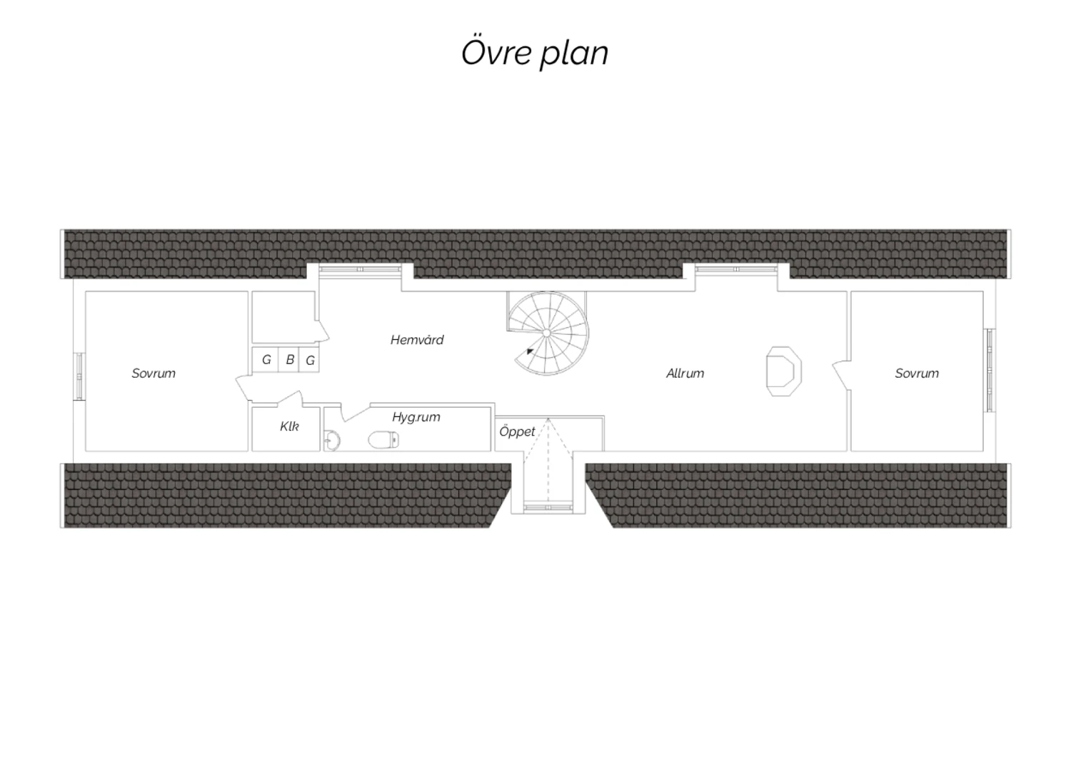 Ett underbart och rymligt ovanplan med generösa ytor och ljusinsläpp från takkupor och fönster, vilket ger en genomgående ljus och luftig känsla. Här finns idag två generösa sovrum i vardera gavel, och i mitten av våningsplanet finns utrymme som kan användas för sociala sammanhang eller som extra sovdel efter behov. Utsikten över havet är hänförande – en magisk plats att vakna upp till varje dag. För extra bekvämlighet finns även en badrum med wc, handfat och dusc på detta plan.
