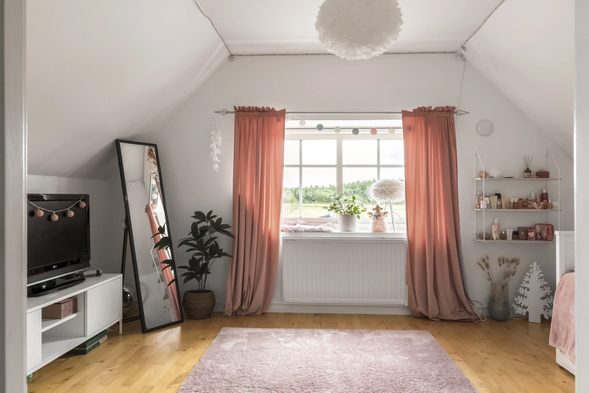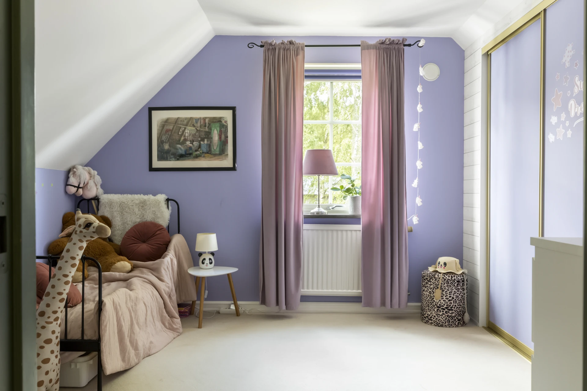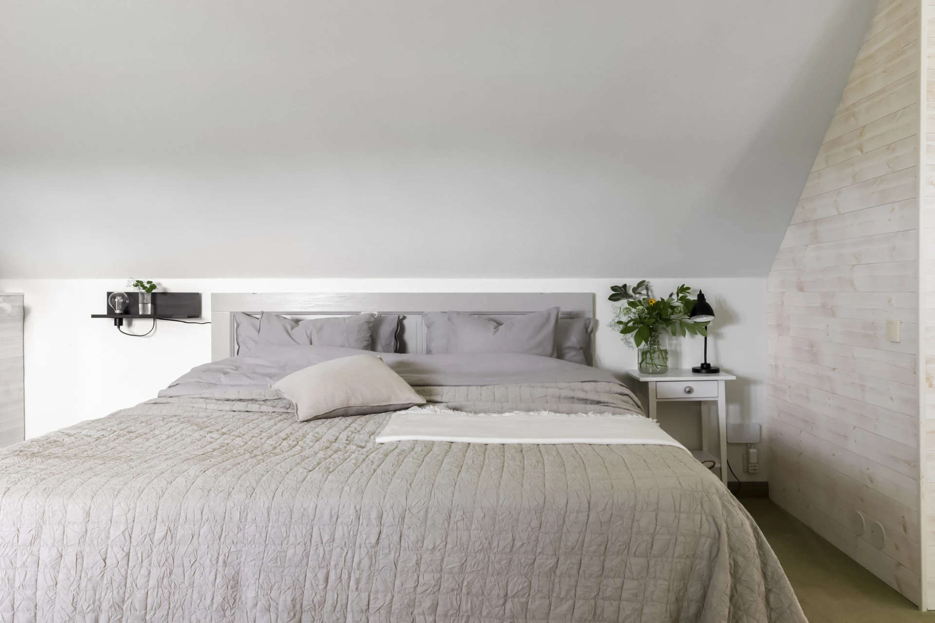 I husets västra gavel ligger ett generöst sovrum med stora ytor och harmonisk atmosfär. Från fönstren blickar man ut över det böljande landskapet, där naturen och ljuset skapar en rofylld inramning – en plats för vila, återhämtning och lugn.