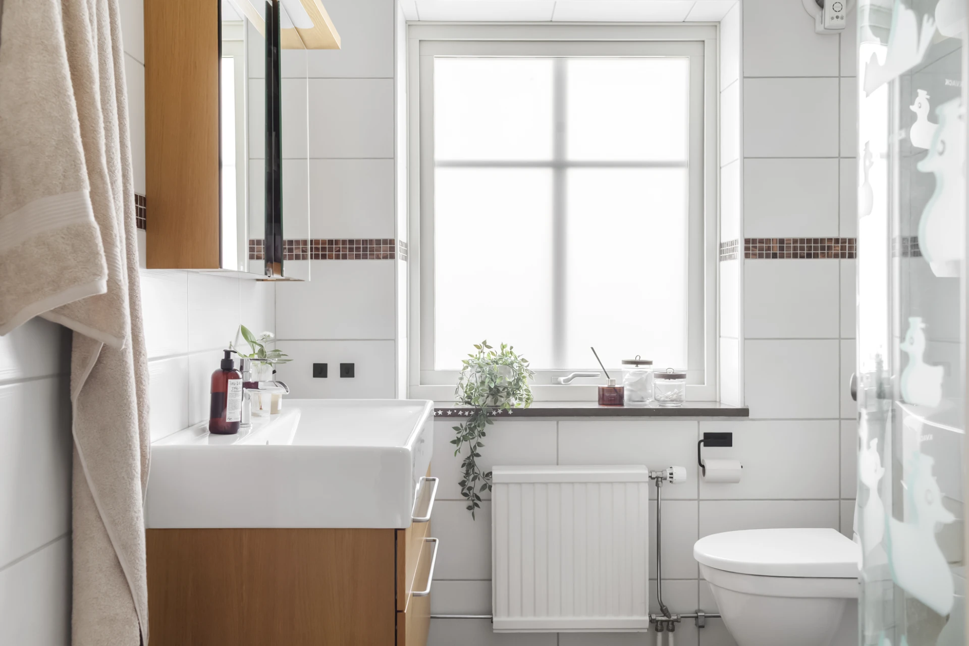 Ett fräscht och stilrent badrum som renoverades 2013, utrustat med wc, handfat och dusch. Helkaklade ytor kombineras med golvvärme, vilket skapar en behaglig och modern känsla. Här finns både funktion och komfort samlat i en elegant och välplanerad miljö.