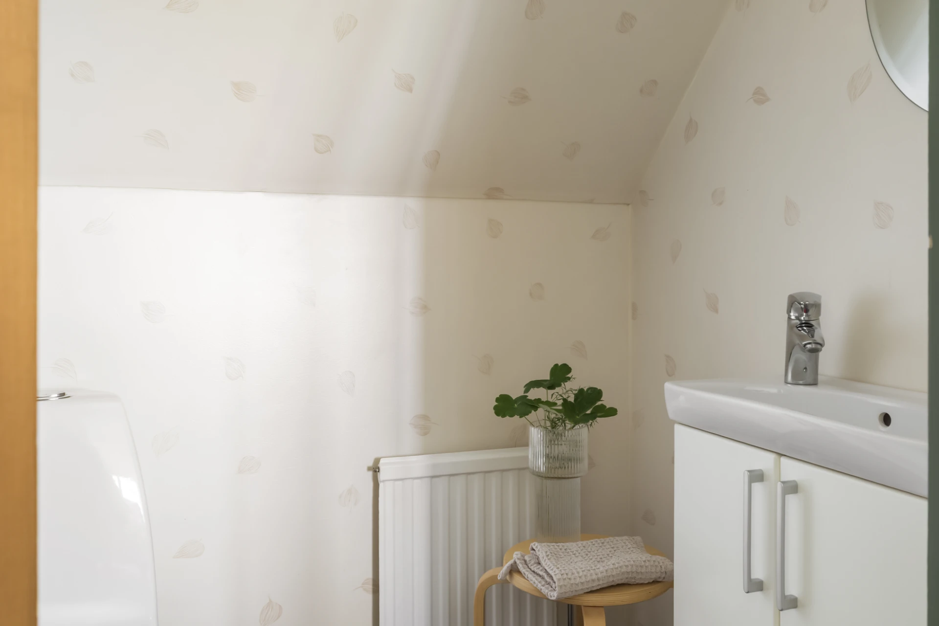 Invid kök och hall finns en praktisk gästtoalett – smidigt placerad för både familj och besökare. Här finns wc och handfat i en tidlös stil.