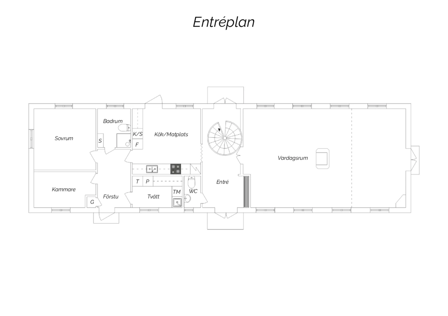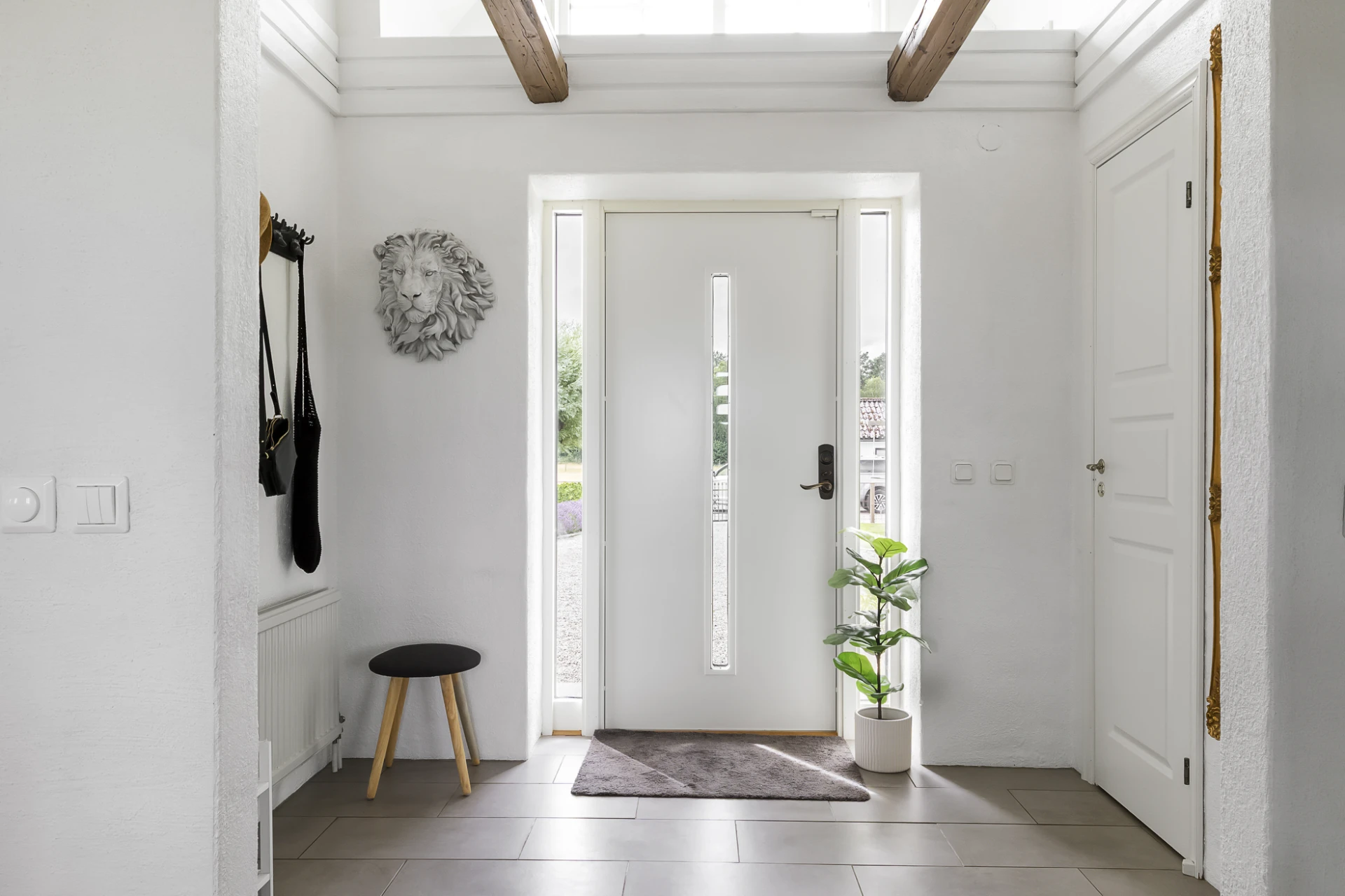 Bostaden välkomnar med två entréer – en representativ huvudentré och en praktisk vardagsentré. Här finns gott om plats för att hänga av sig ytterkläder och skapa en trivsam första känsla när man kliver in i hemmet. Kombinationen av stil och funktion gör att både vardag och fest tas emot på bästa sätt.