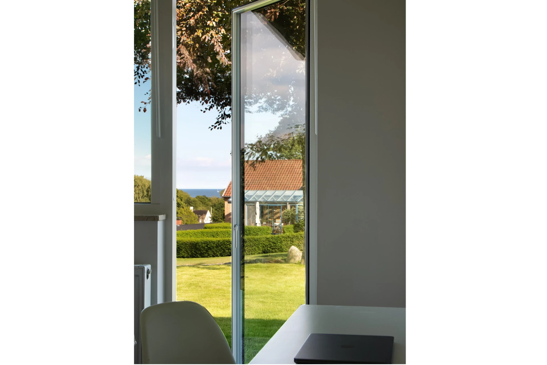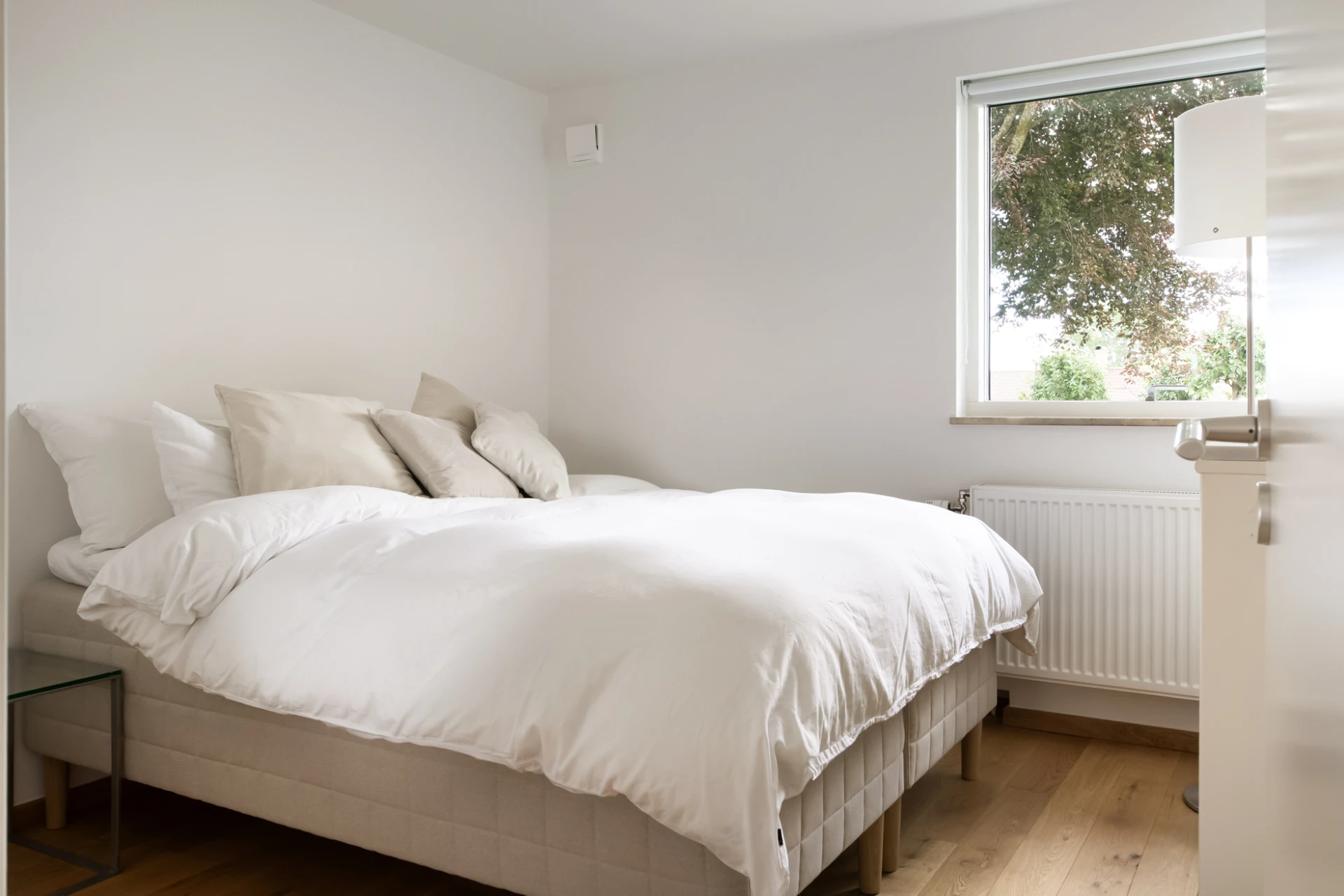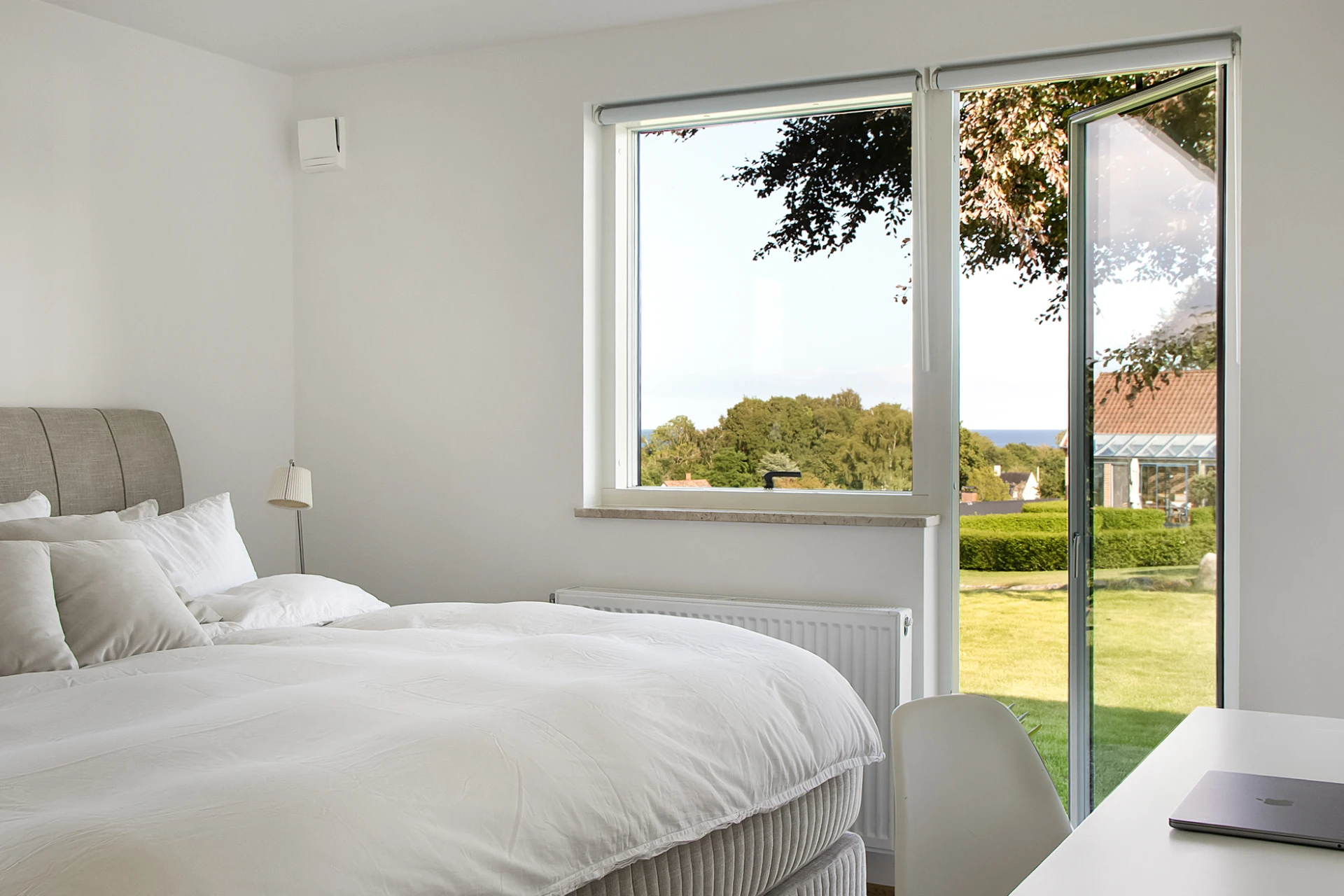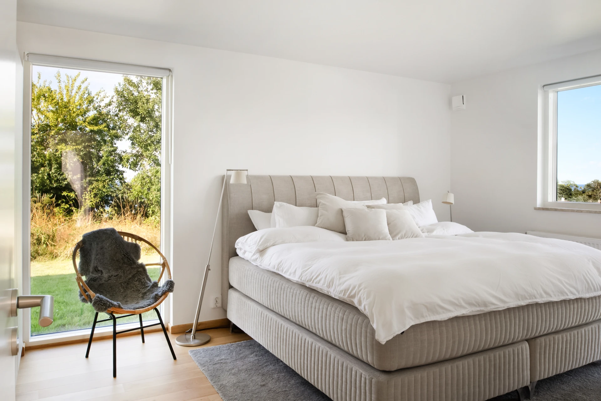 Ett generöst och harmoniskt sovrum med en känsla av perfekt balans. Här blickar du ut över havet genom ett stort fönsterparti från golv till tak, och via terrassdörren når du uteplatsen i öster – en idealisk plats för morgonkaffet. Längs ena väggen finns smart garderobslösning med gott om förvaring.