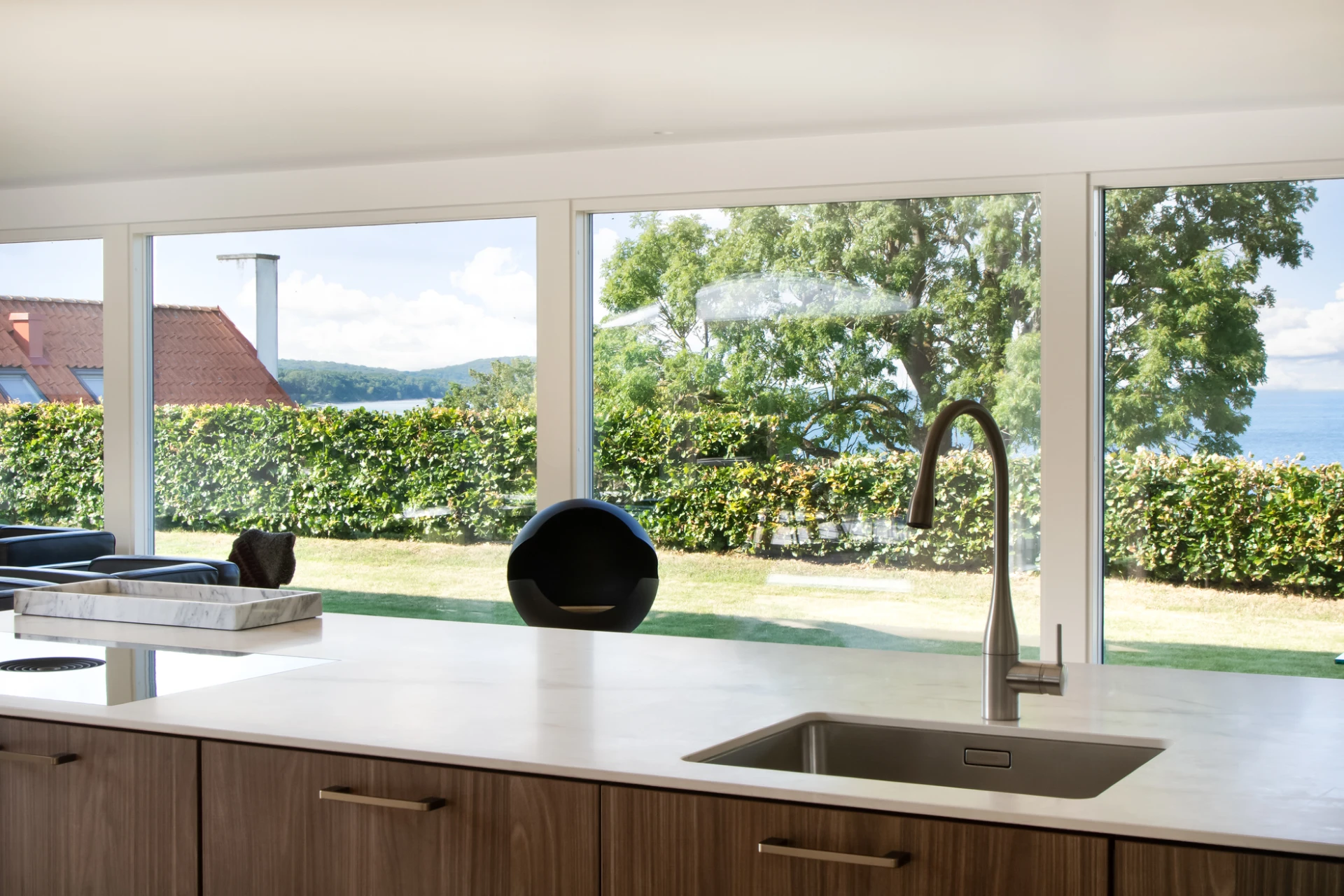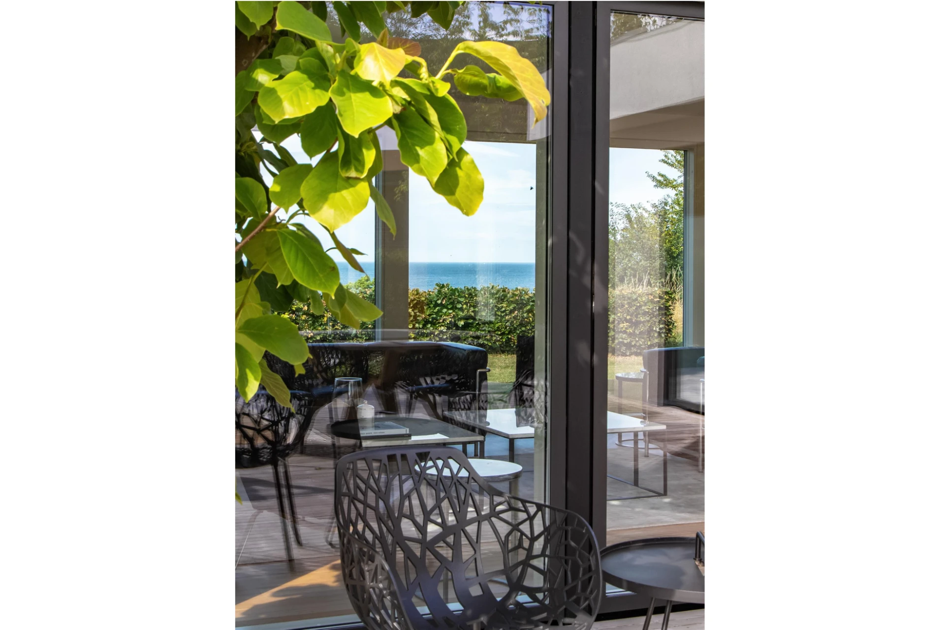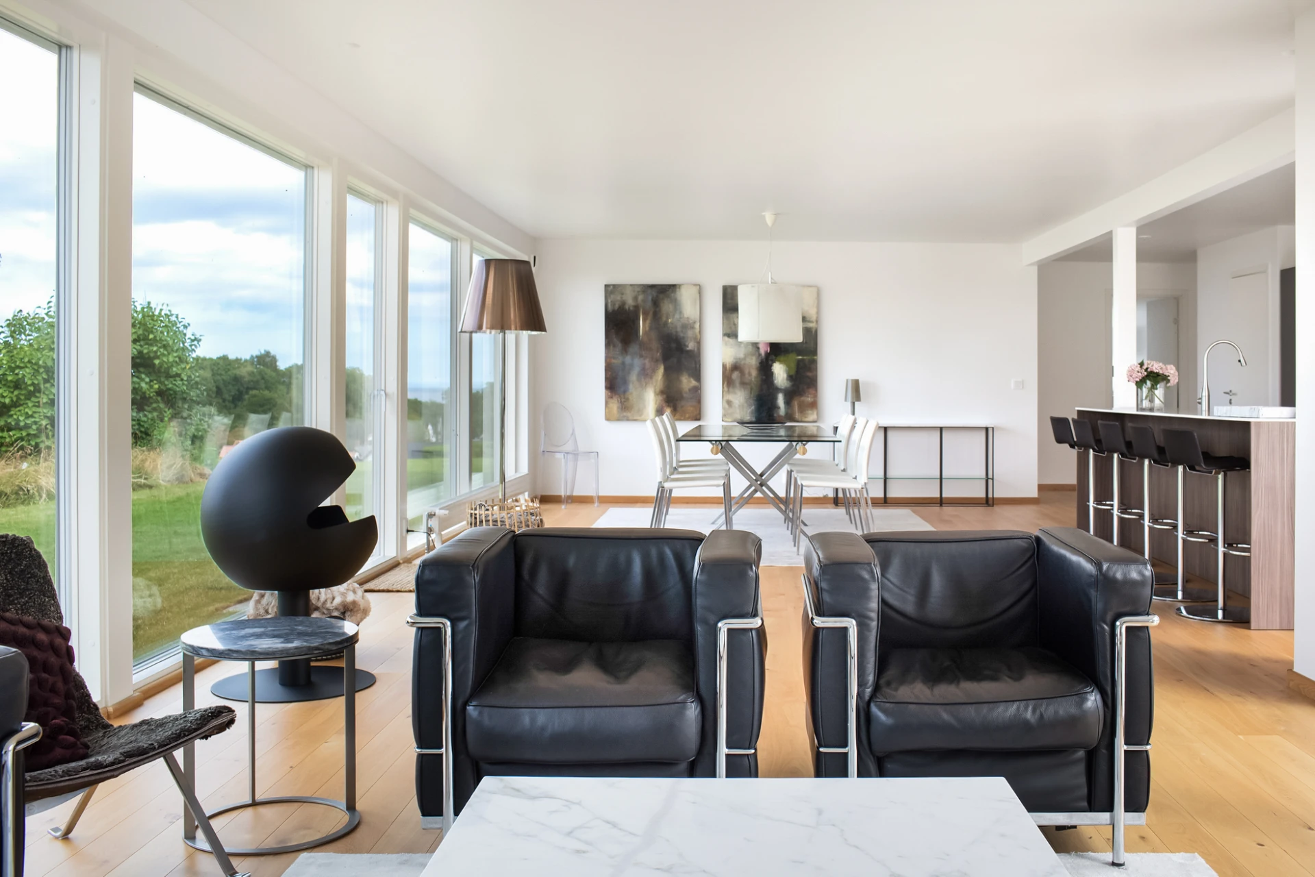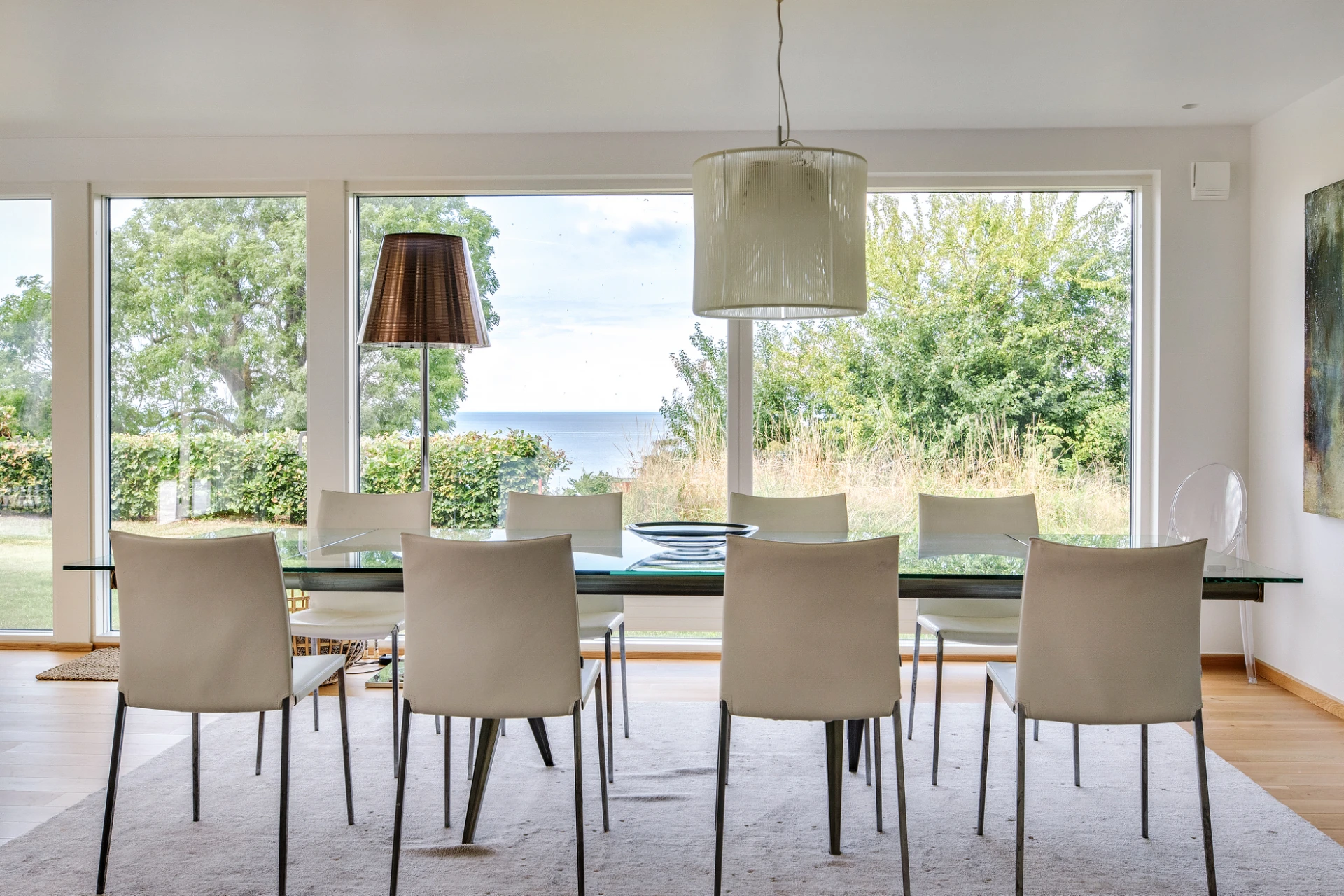 Ett sällskapsrum som tar andan ur dig. Här möts du av en unik indoor–outdoor känsla där den 13 meter långa väggen med fönsterpartier från golv till tak låter ljuset och utsikten dominera. Oavsett var du befinner dig i rummet har du fri vy över hav och natur. Infällda spotlights med dim-to-warm som ger en stämningsfull atmosfär, styrning via Plejd. Via dubbla terrassdörrar når du uteplatser i söder, väster och norr.