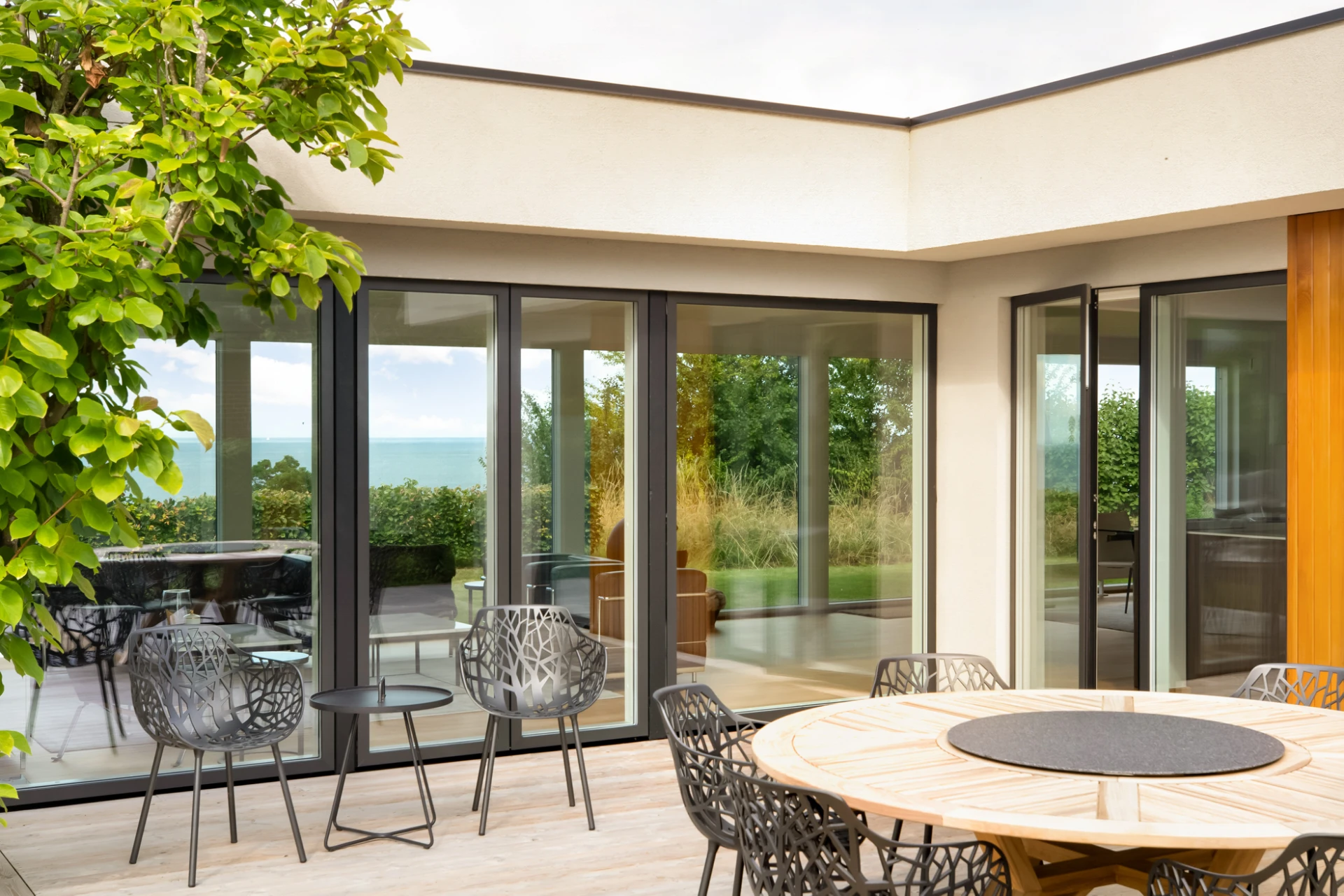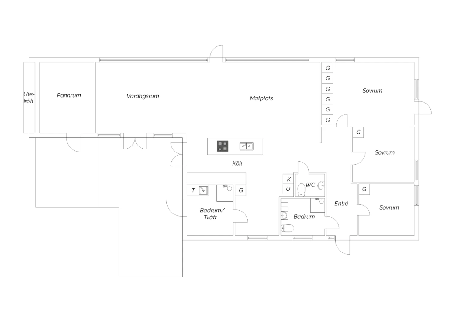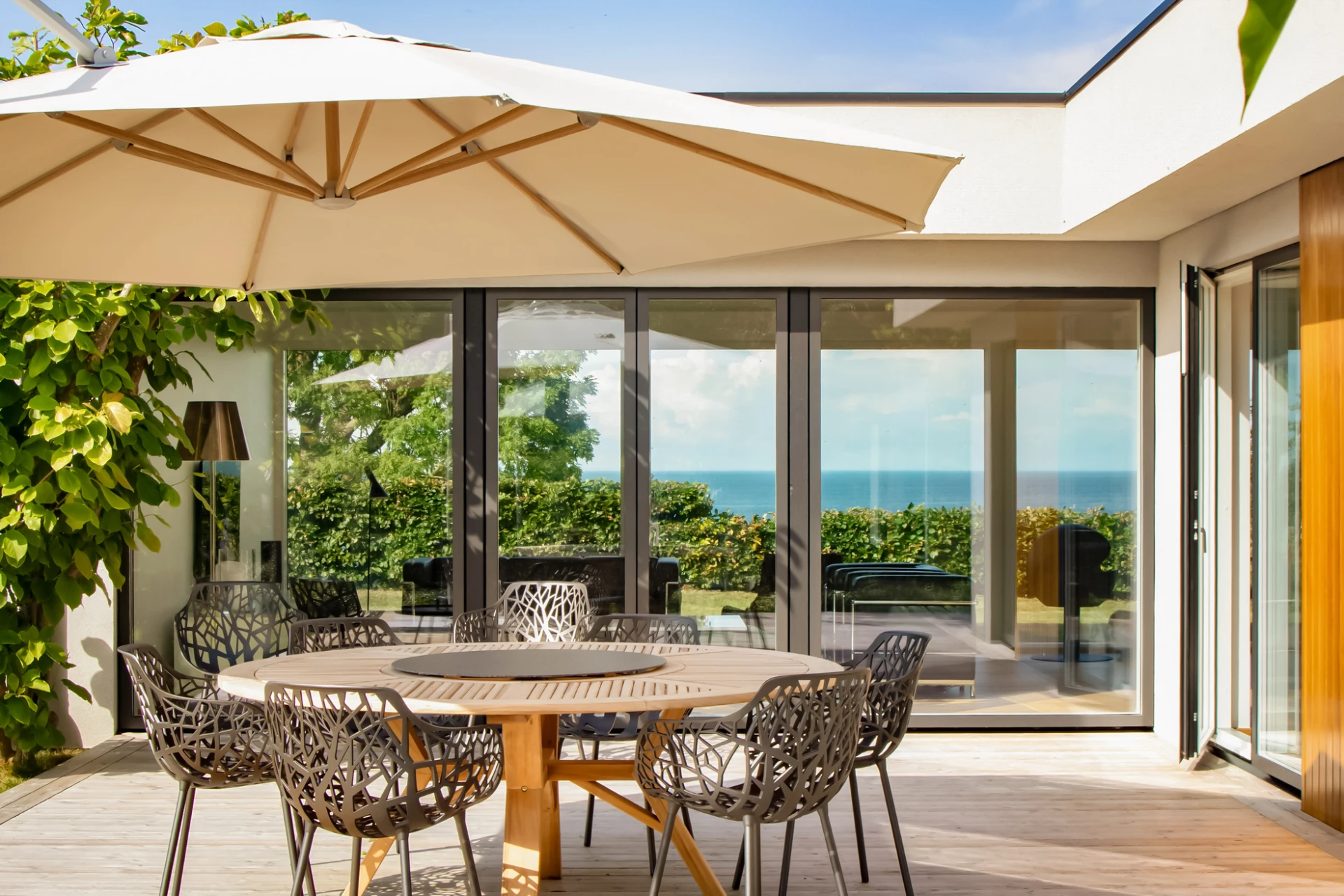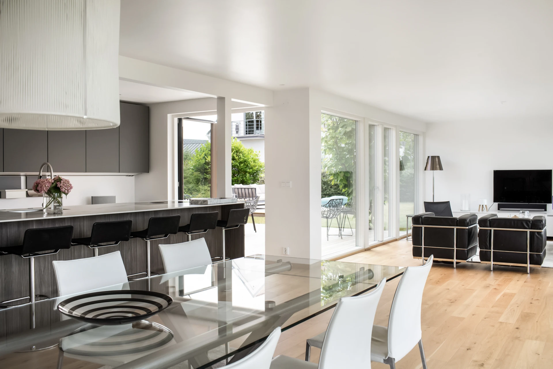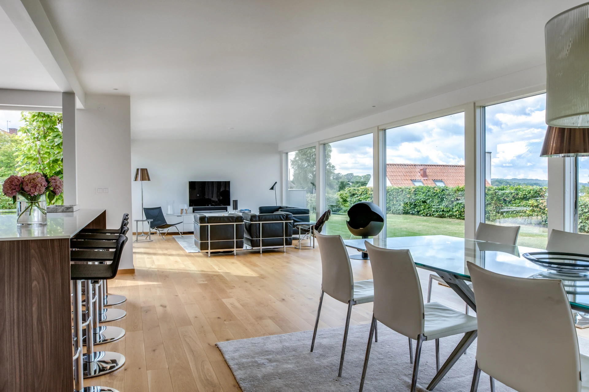 Ett sällskapsrum som tar andan ur dig. Här möts du av en unik indoor–outdoor känsla där den 13 meter långa väggen med fönsterpartier från golv till tak låter ljuset och utsikten dominera. Oavsett var du befinner dig i rummet har du fri vy över hav och natur. Infällda spotlights med dim-to-warm som ger en stämningsfull atmosfär, styrning via Plejd. Via dubbla terrassdörrar når du uteplatser i söder, väster och norr.