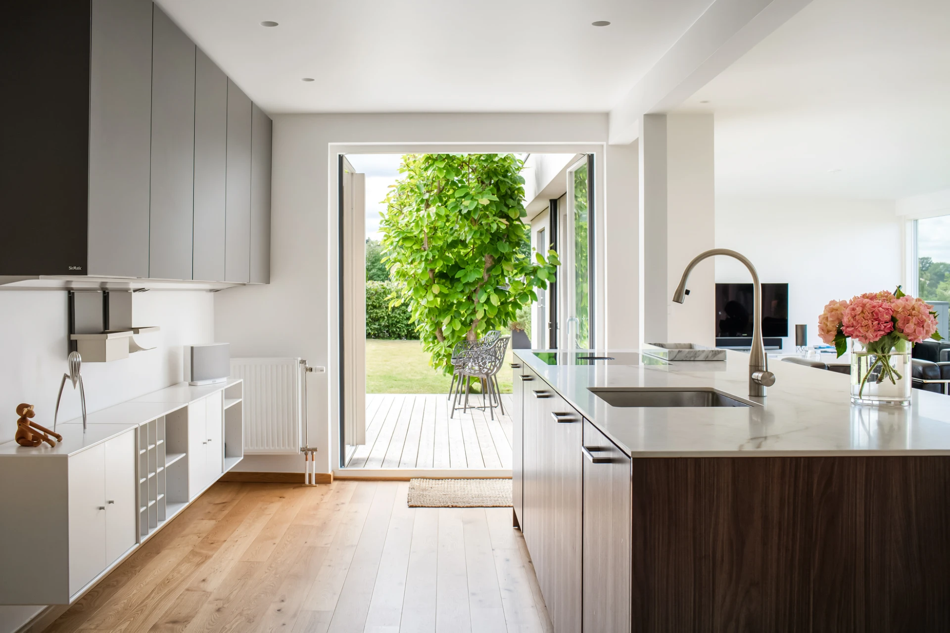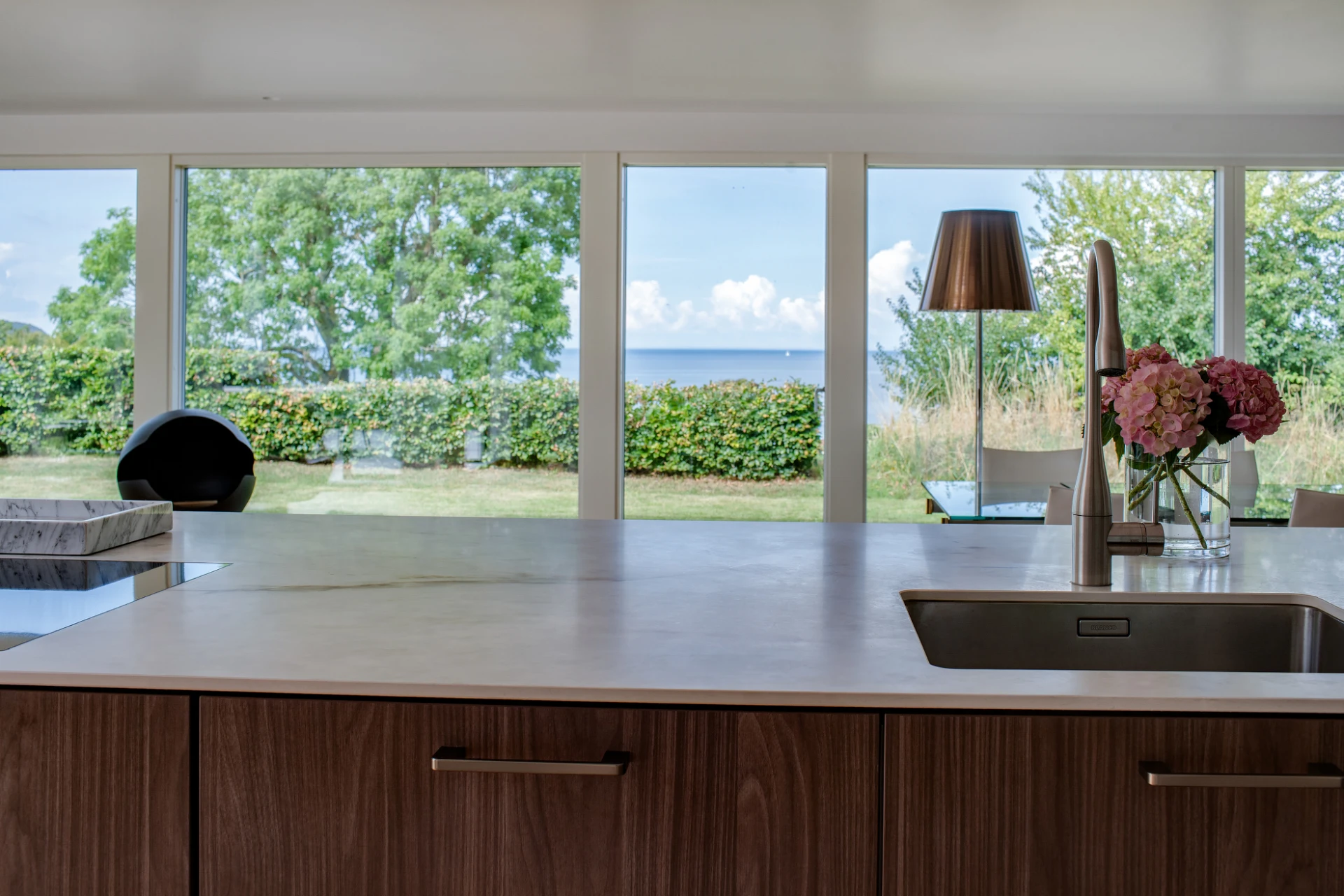 Exklusivt kvalitetskök från SieMatic (2023) i tidlös design med valnötsluckor, mellangrå toner och bänkskiva i ljus kompositsten. Köksön erbjuder barhäng för 5 personer och kompletteras av en matplats för 10–12 gäster. Maskinell utrustning i hög klass: induktionshäll med integrerad fläkt från Bora, ugn, kyl och frys från Siemens samt diskmaskin från Miele. Stämingsbelysning i olika färger från SieMatic. Infällda spotlights med dim-to-warm som ger en stämningsfull atmosfär, styrning via Plejd. Från köket nås terrass och utekök i soligt västerläge.