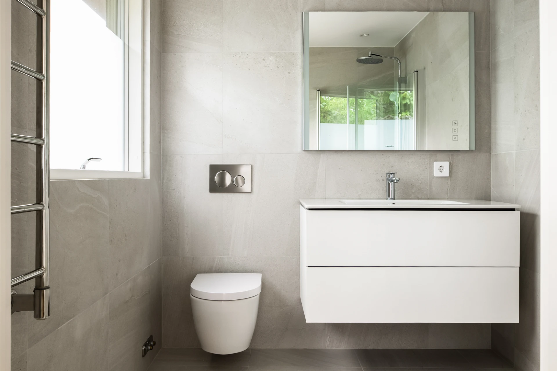 Helkaklat badrum i en varm sandfärgad ton, stilfullt renoverat 2023. Inredning (tvättställ, kommod, blandare, spegel och vägghängd toalett) från Duravit. Dusch från Hansgrohe, handdukstork, nya spotlights och behaglig golvvärme. Kvalitetsdokument och intyg för säker vatteninstallation finns.