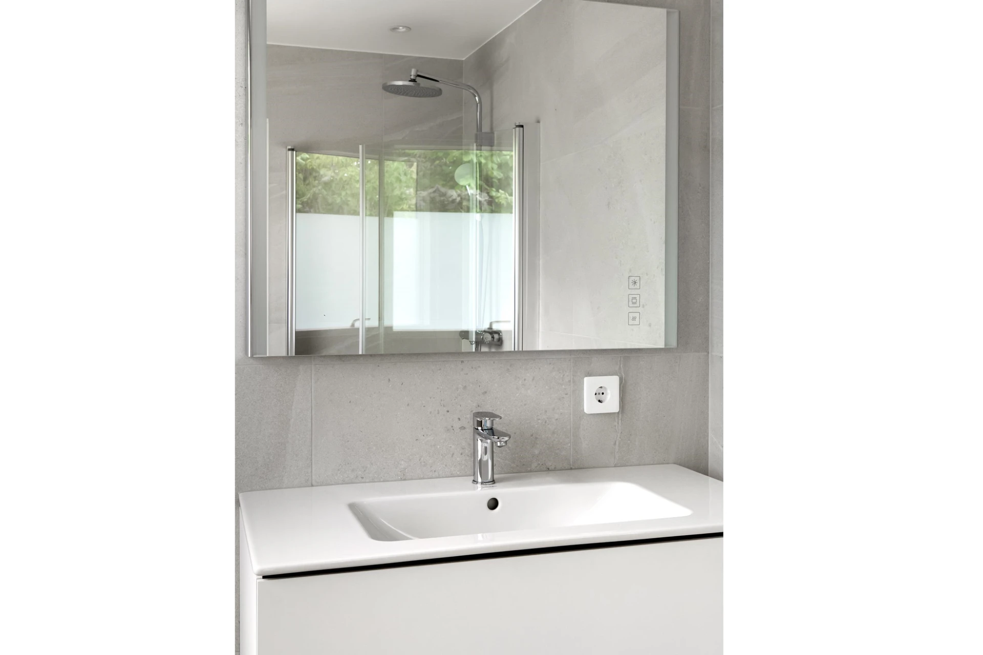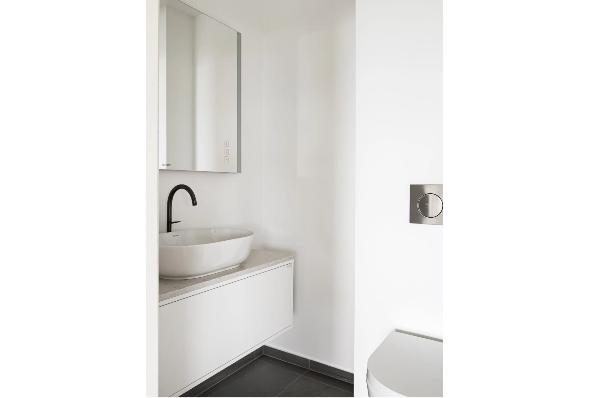 Inredning från Duravit (tvättställ, spegel och vägghängd toalett). Kommod från 4Aqua. Blandare från Axor Hansgrohe. Nya spotlights. Även WC är renoverat 2023. Kvalitetsdokument och intyg om säker vatteninstallation finns.