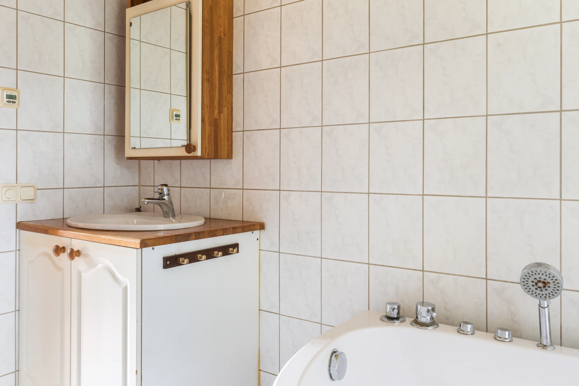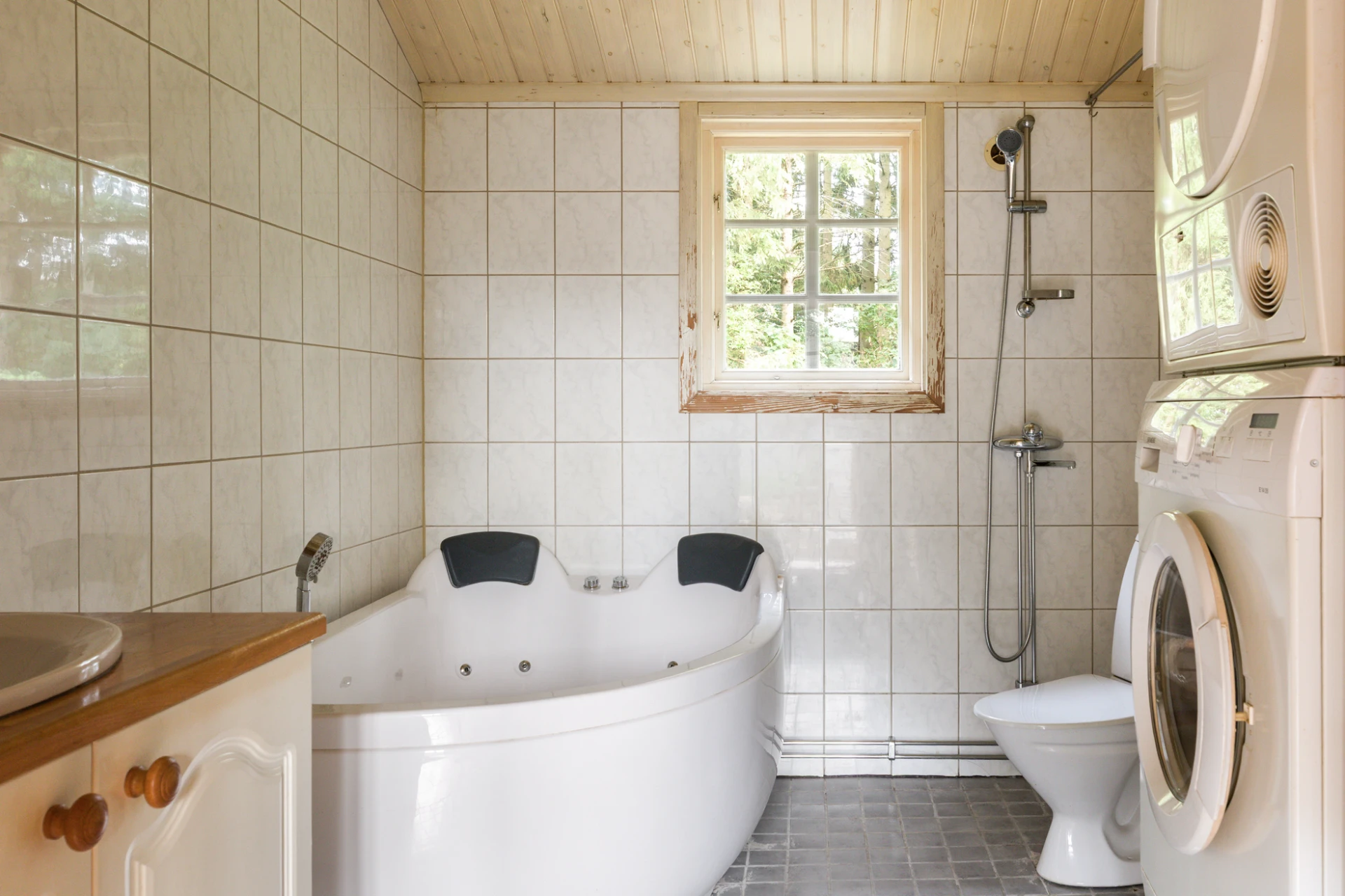 Helkakalt badrum med klinkergolv och golvvärme (el). Badkar, kommod, wc. Här finns även tvättmaskin och torktumlare.