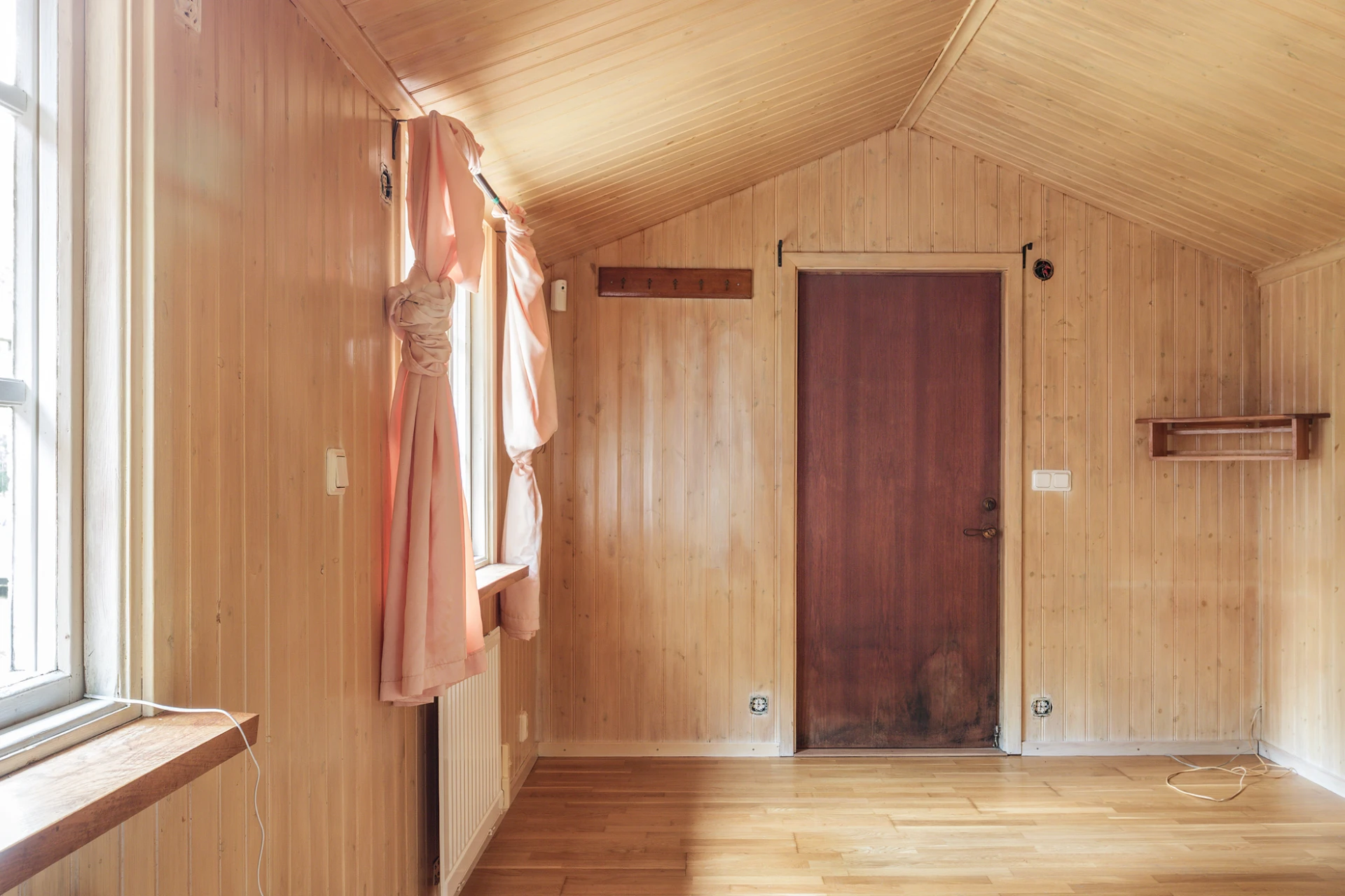 Från köket nås detta rum som använts som sovrum. Det är ifrån detta rum som nybyggnationen dockar an stugan.