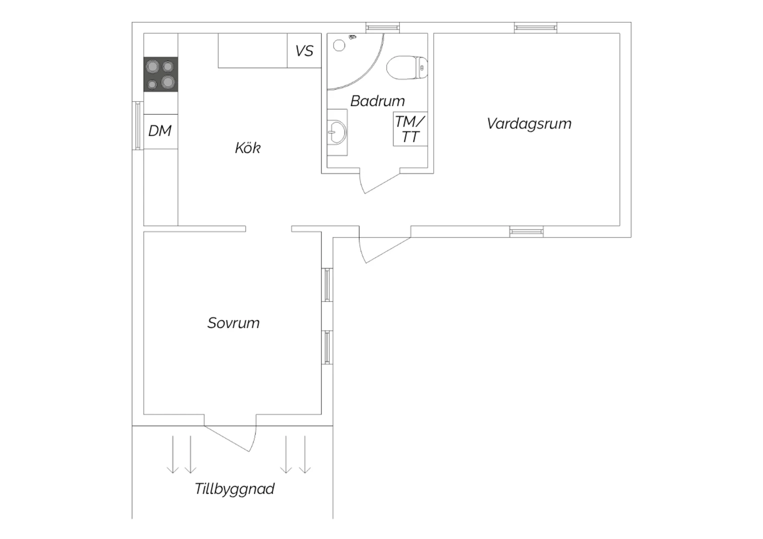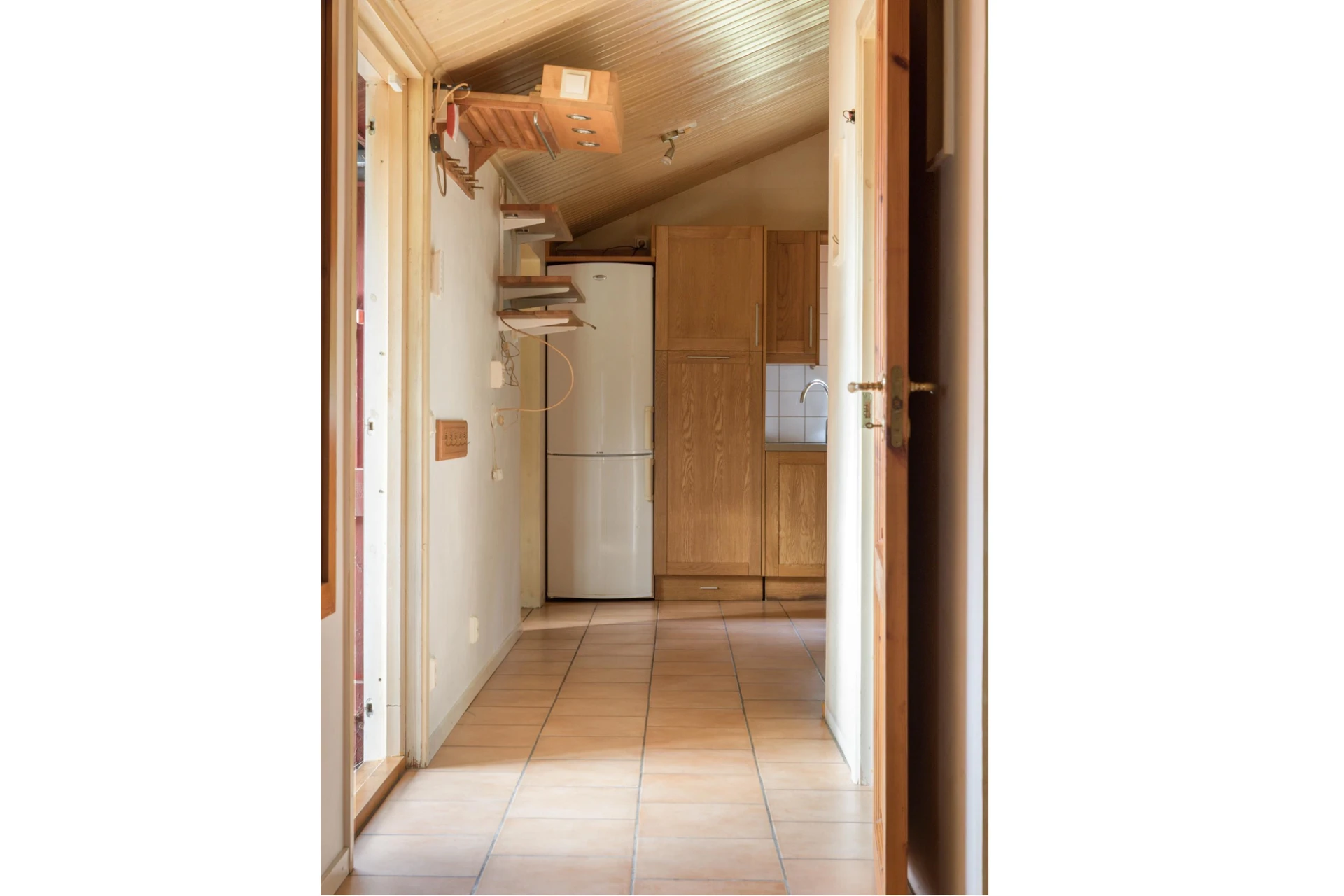 Entré med hall som leder till vardagsrum till höger och kök till vänster. Rakt fram finns badrummet.