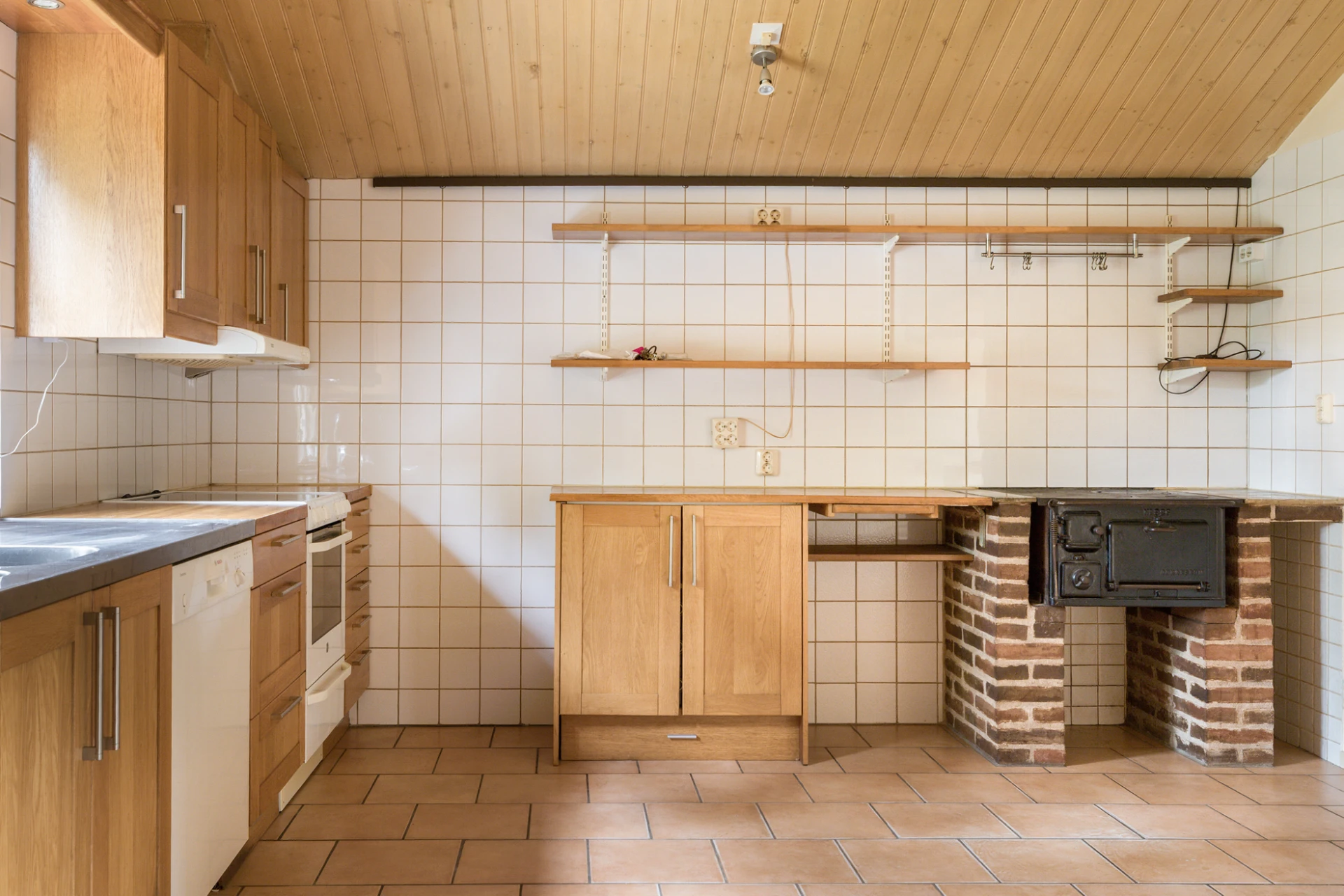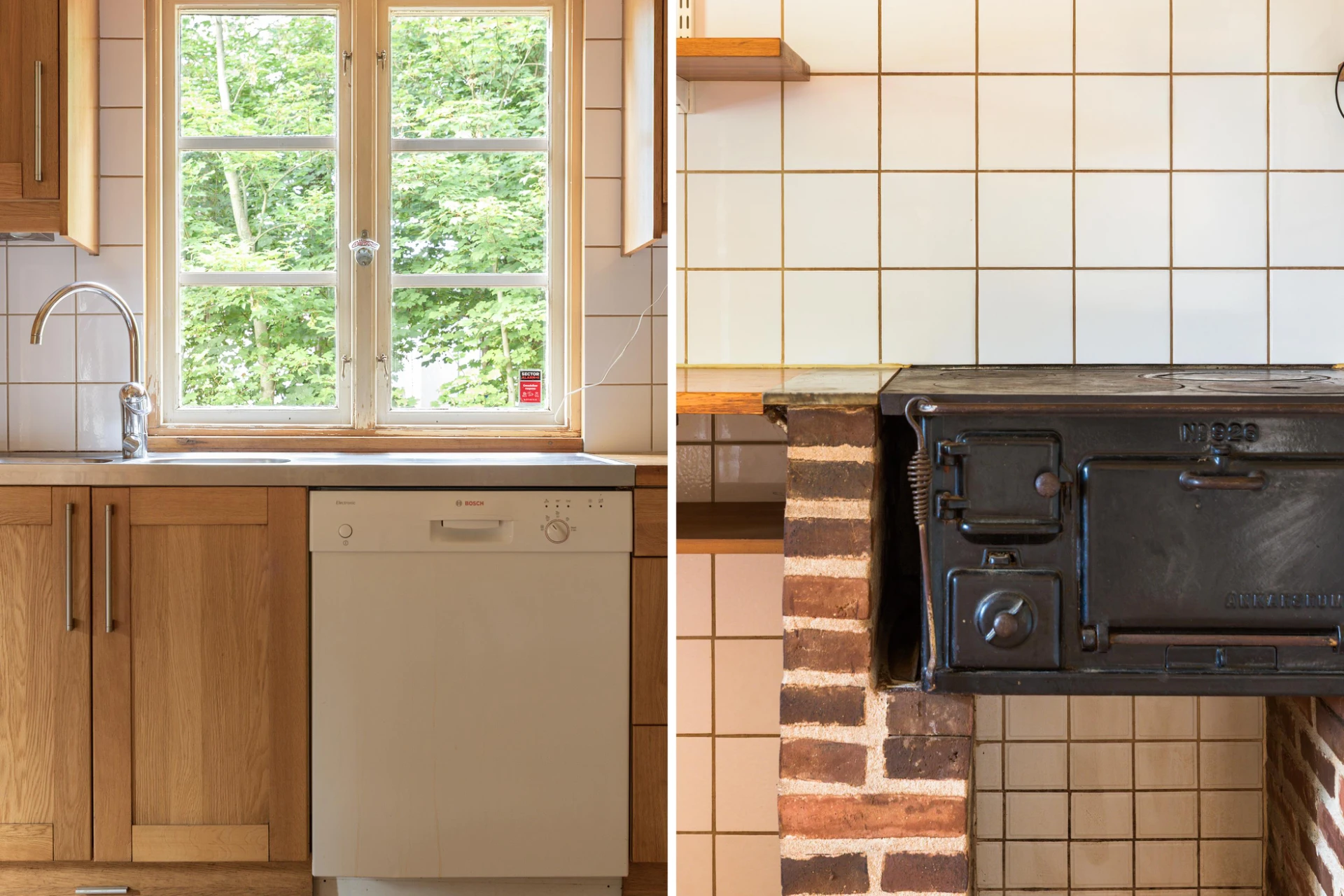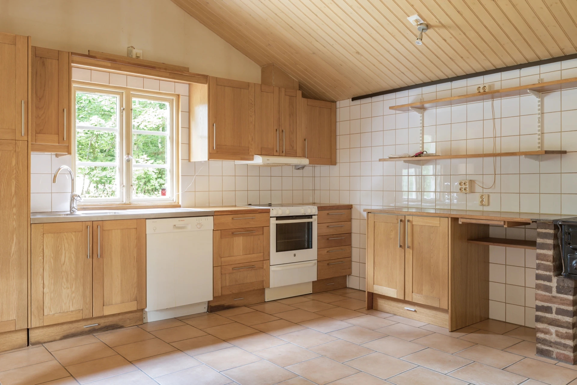 Rymligt kök med plats för ett stort köksbord. Maskinell utrustning är spis/ugn, fläkt och diskmaskin. Kyl/frys. Här finns även vedeldad spis (oklar status).