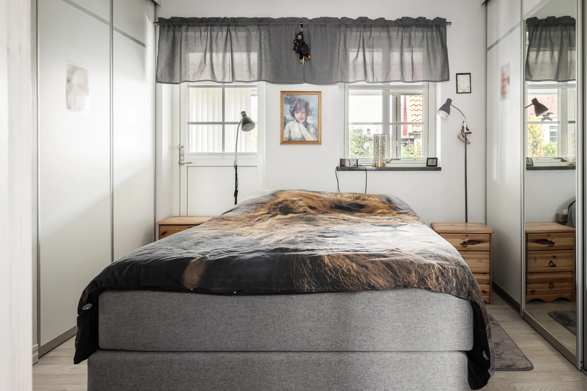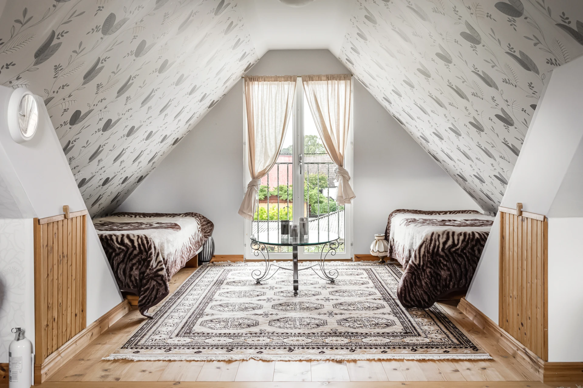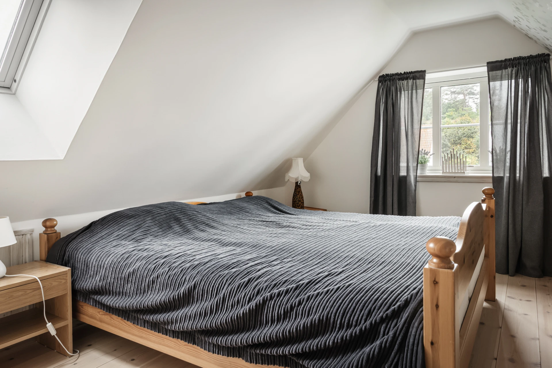 Gavelsovrum på ovanplan. Plats för dubbelsäng. Takfönster.