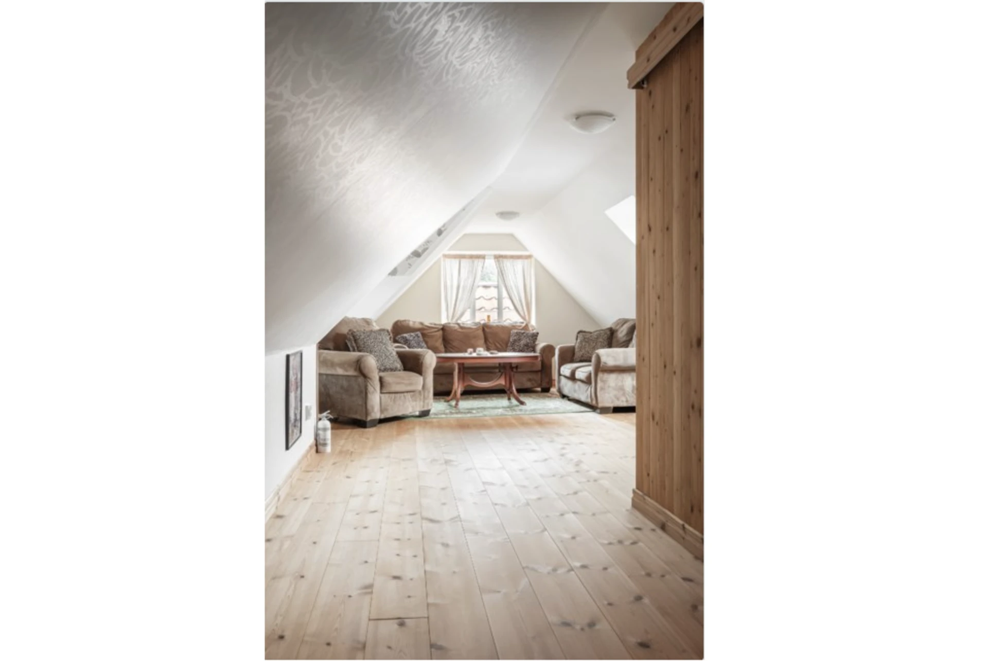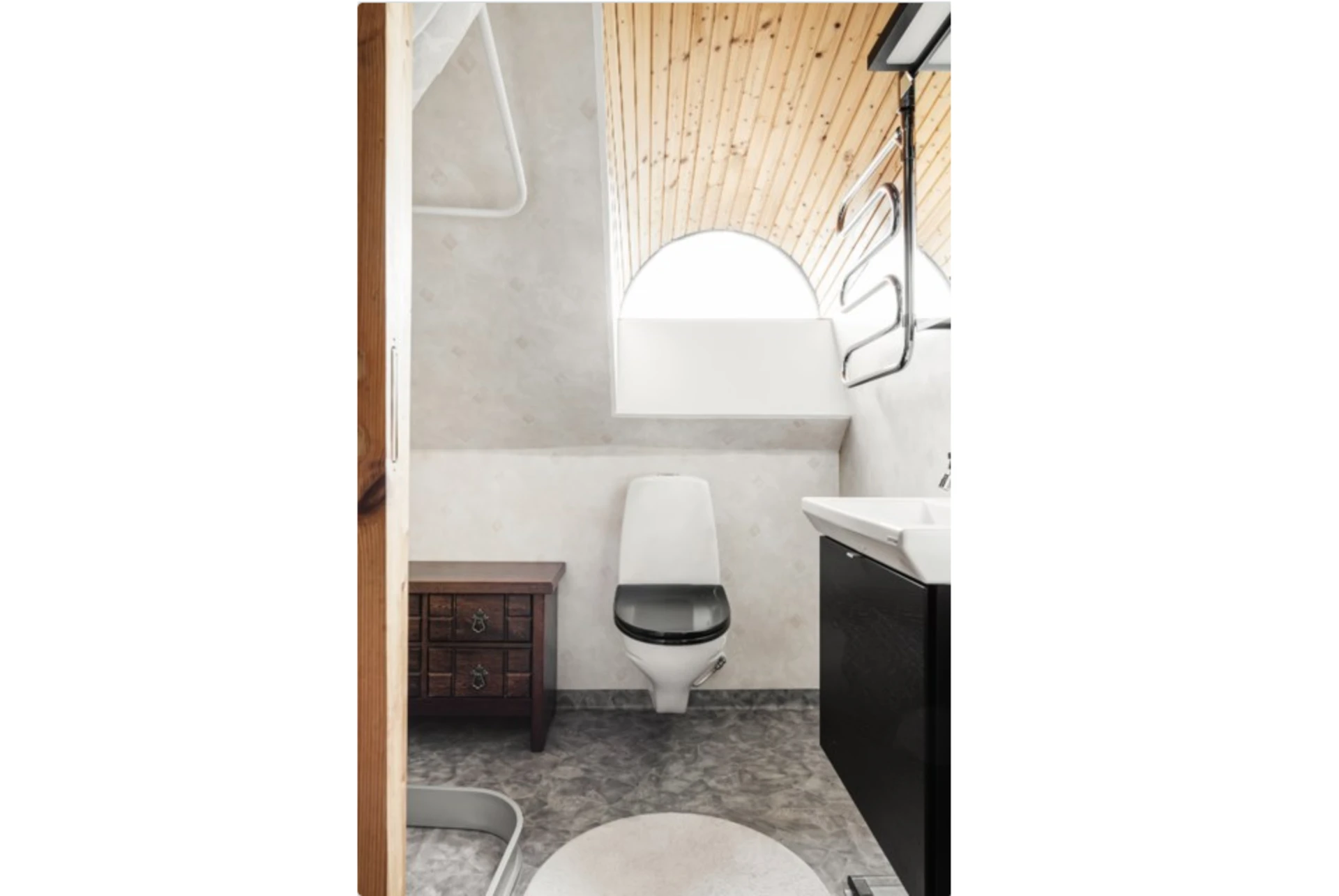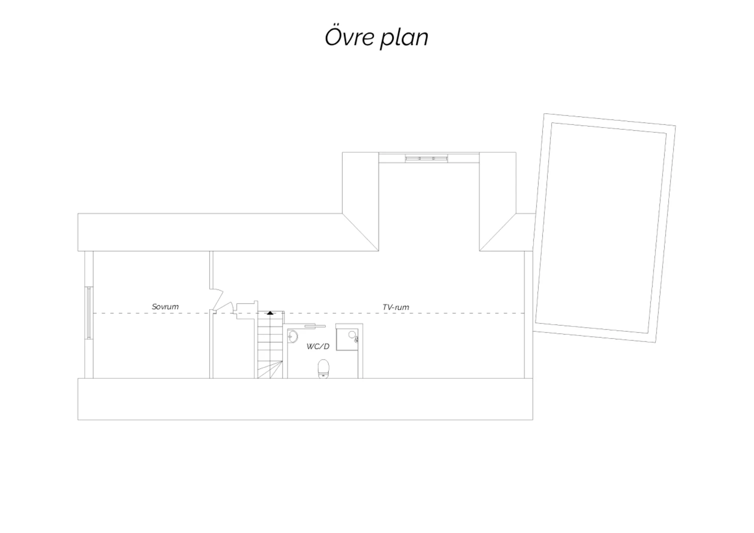 En rejäl trappa leder upp till övre planet, där du finner ett sovrum, allrum, duschrum, toalett och gott om förvaring. Här finns möjligheter till fler sovrum. Från fönstren glimmar havet mellan trädens grenar – en stilla påminnelse om närheten till kusten.
