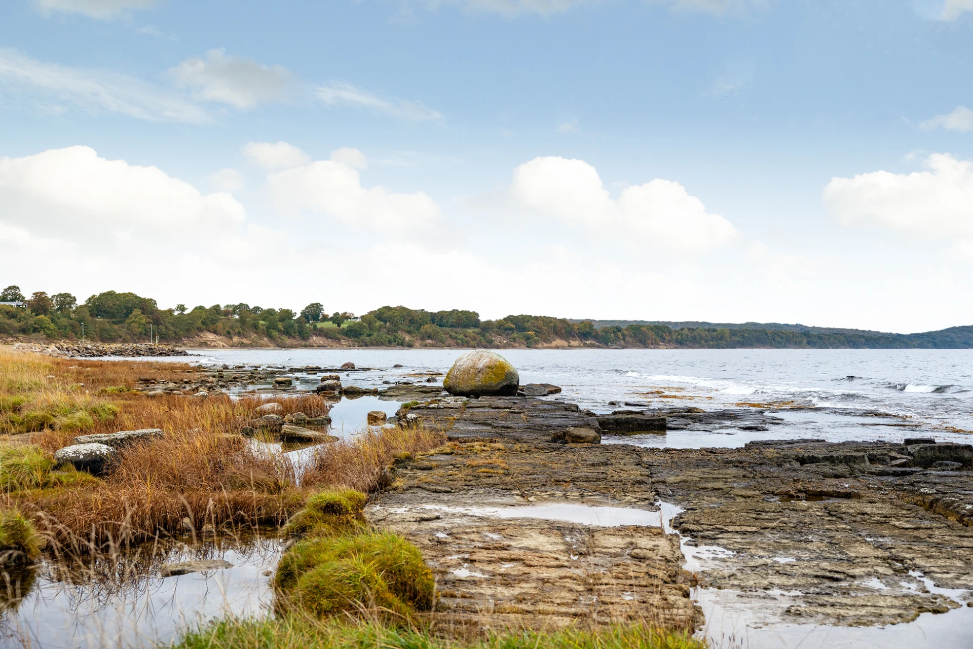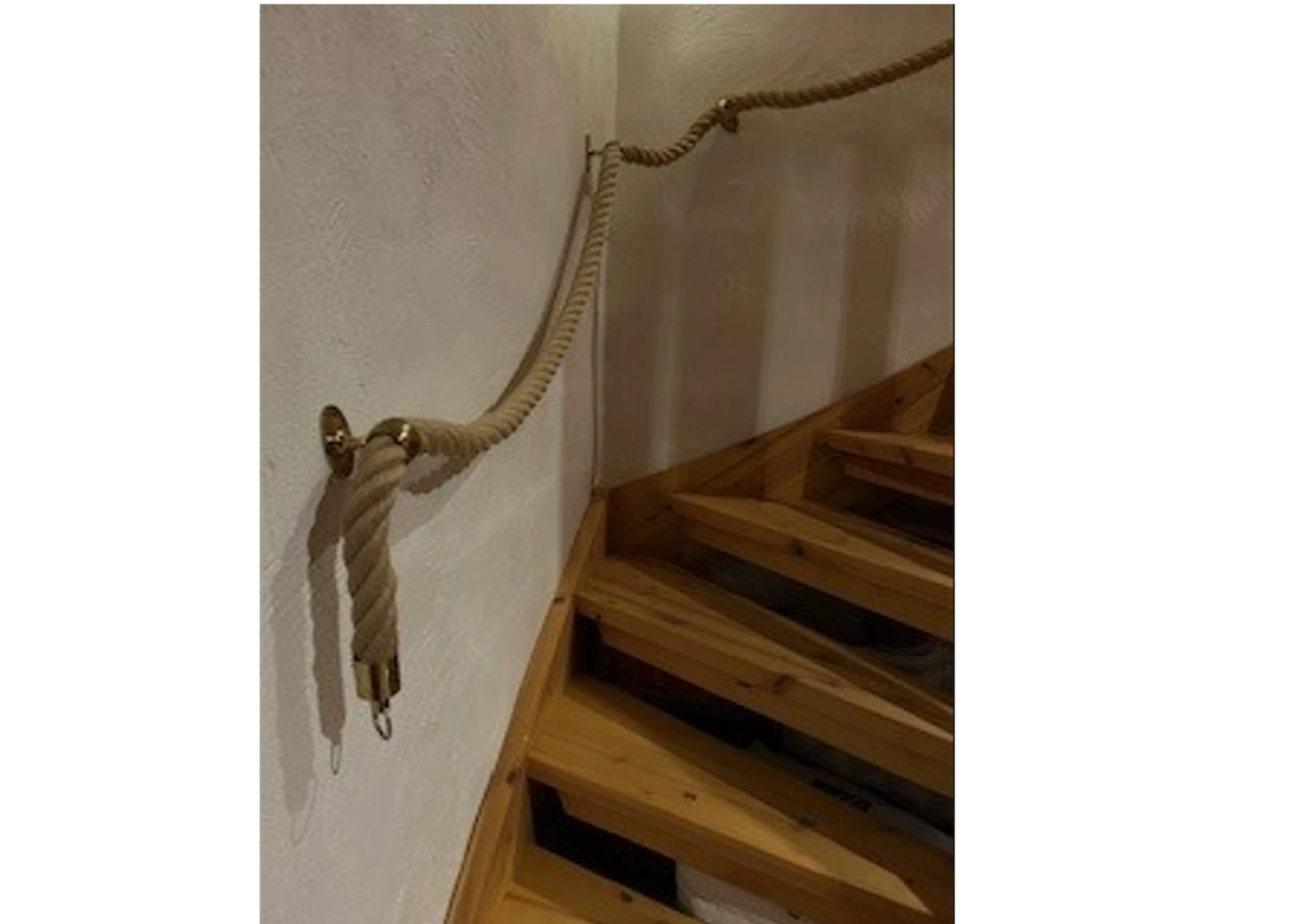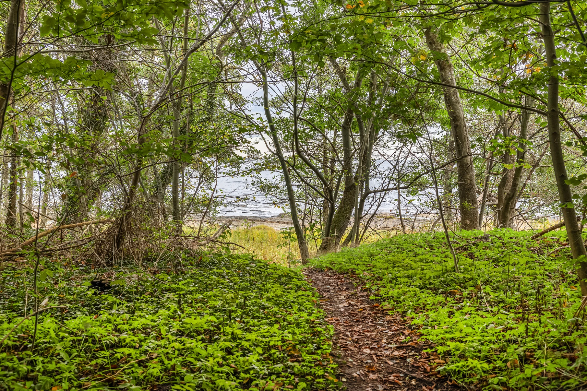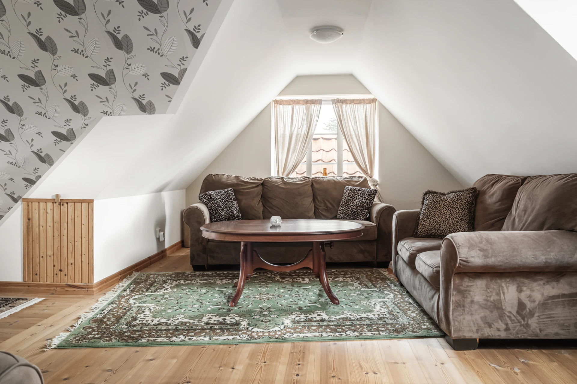 En rejäl trappa leder upp till övre planet, där du finner ett sovrum, allrum, duschrum, toalett och gott om förvaring. Här finns möjligheter till fler sovrum. Från fönstren glimmar havet mellan trädens grenar – en stilla påminnelse om närheten till kusten.