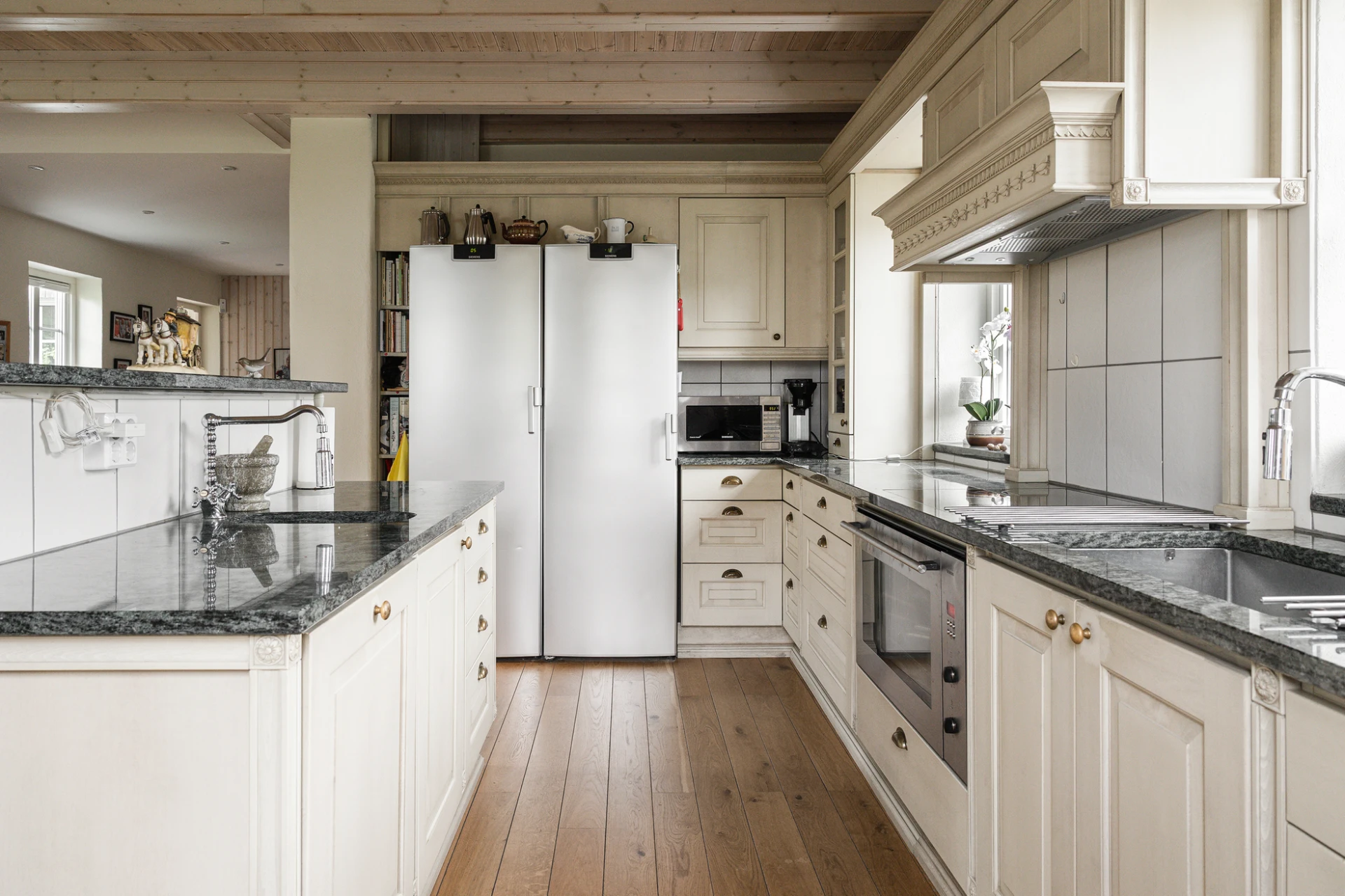 Stort och härligt kök för social samvaro. Generösa ytor i ett vackert snickerikök. Granitskivor, två vaskar. Maskinell utrustning är kylskåp, frysskåp, diskmaskin, spis med extra bred ugn och spisfläkt.