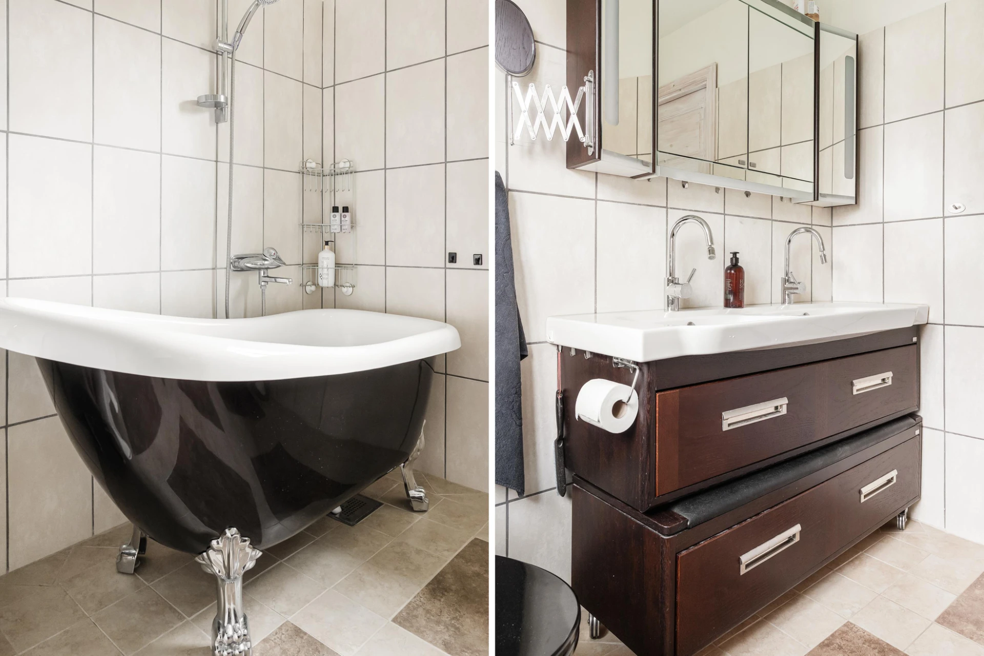Sovrum med eget badrum. Klinkersgolv och halvkaklade väggar. Gott om plats för dubbelsäng. Garderob. Badrum med WC, dubbelkommod, och badkar på lejontassar. Handdukstork.