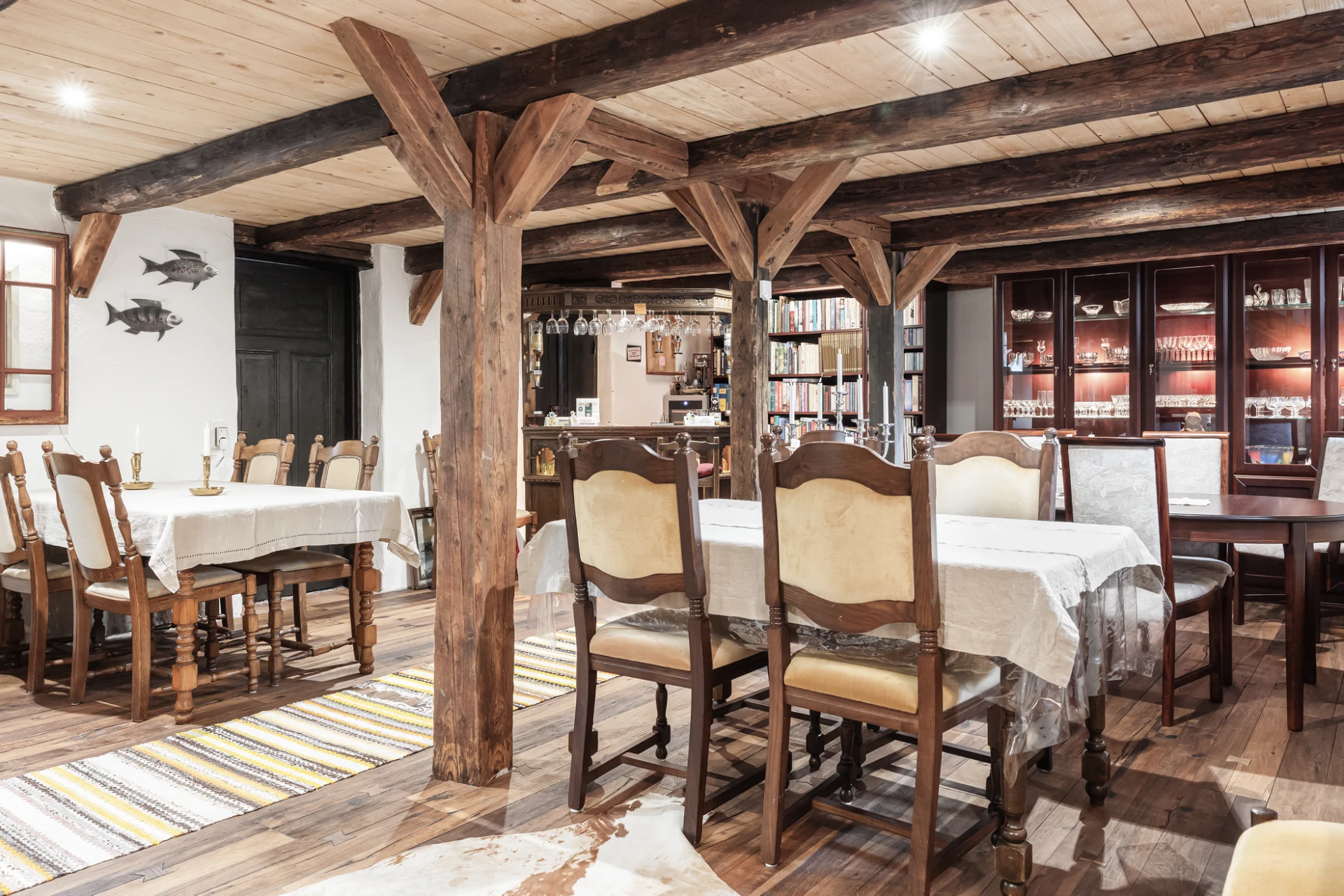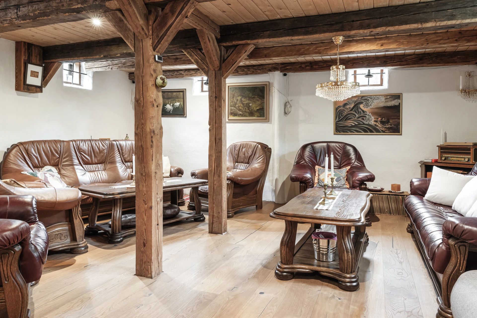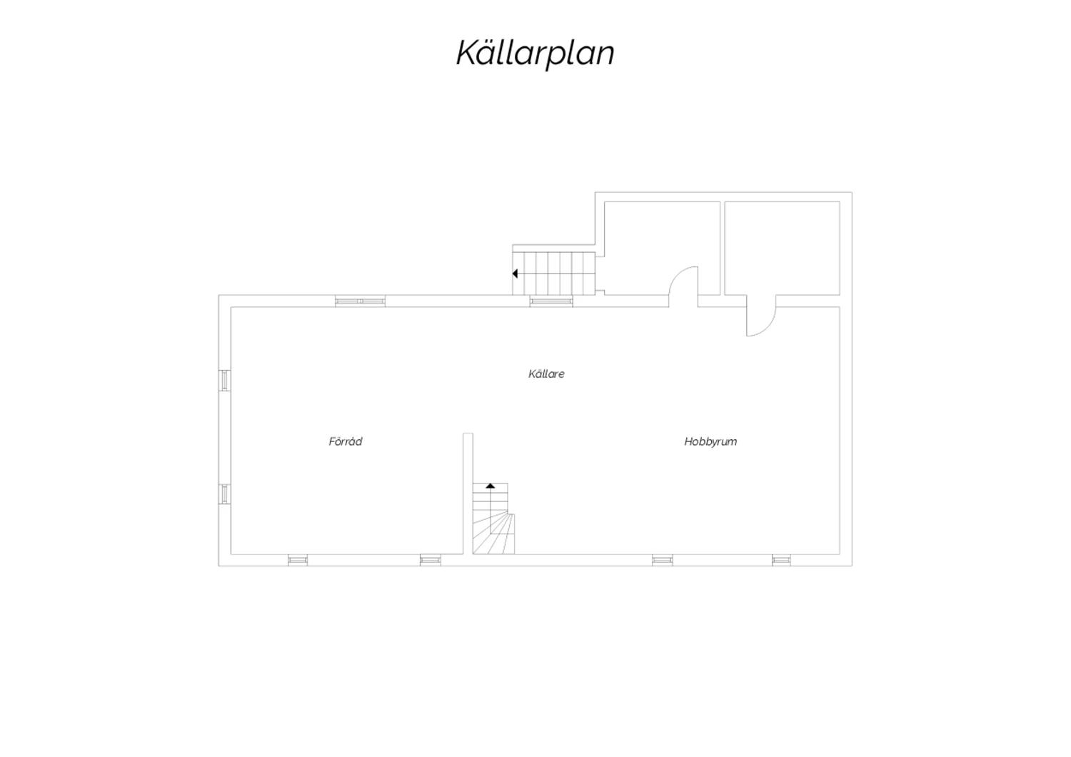 Ett läckert utrymme som har använts som festlokal och sällskapsutrymme. Här känns det som at stiga ned i en engelsk pub. Öppet utrymme som rymmer många. Vinkällare. Förråd med utgång till trädgården.