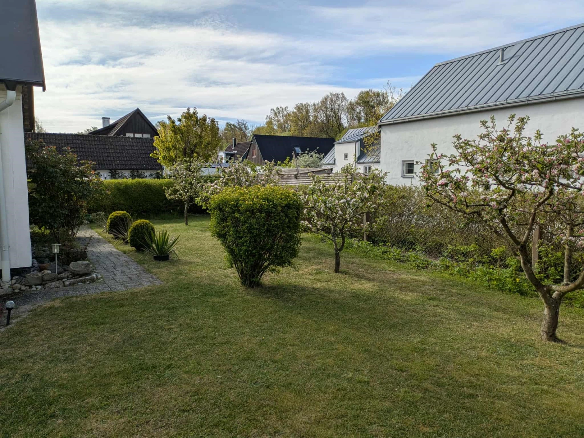 Trädgården är lättskött och grönskande, inramad av häckar, äppelträd, fikon, valnötsträd och stenmur, med mysig uteplats där du kan njuta av solen från morgon till kväll. Här finns plats för både odling, lek och avkoppling.