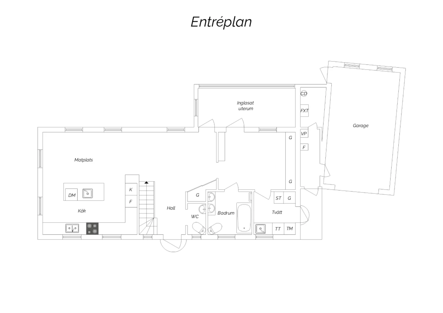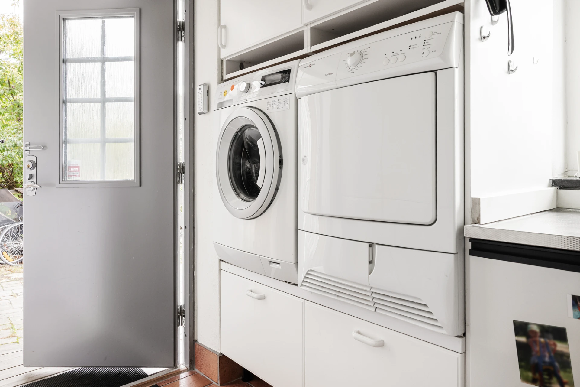 Tvättrum med egen entré från billuppställningsplatsen. Tvättmaskin och torktumlare. Vask.