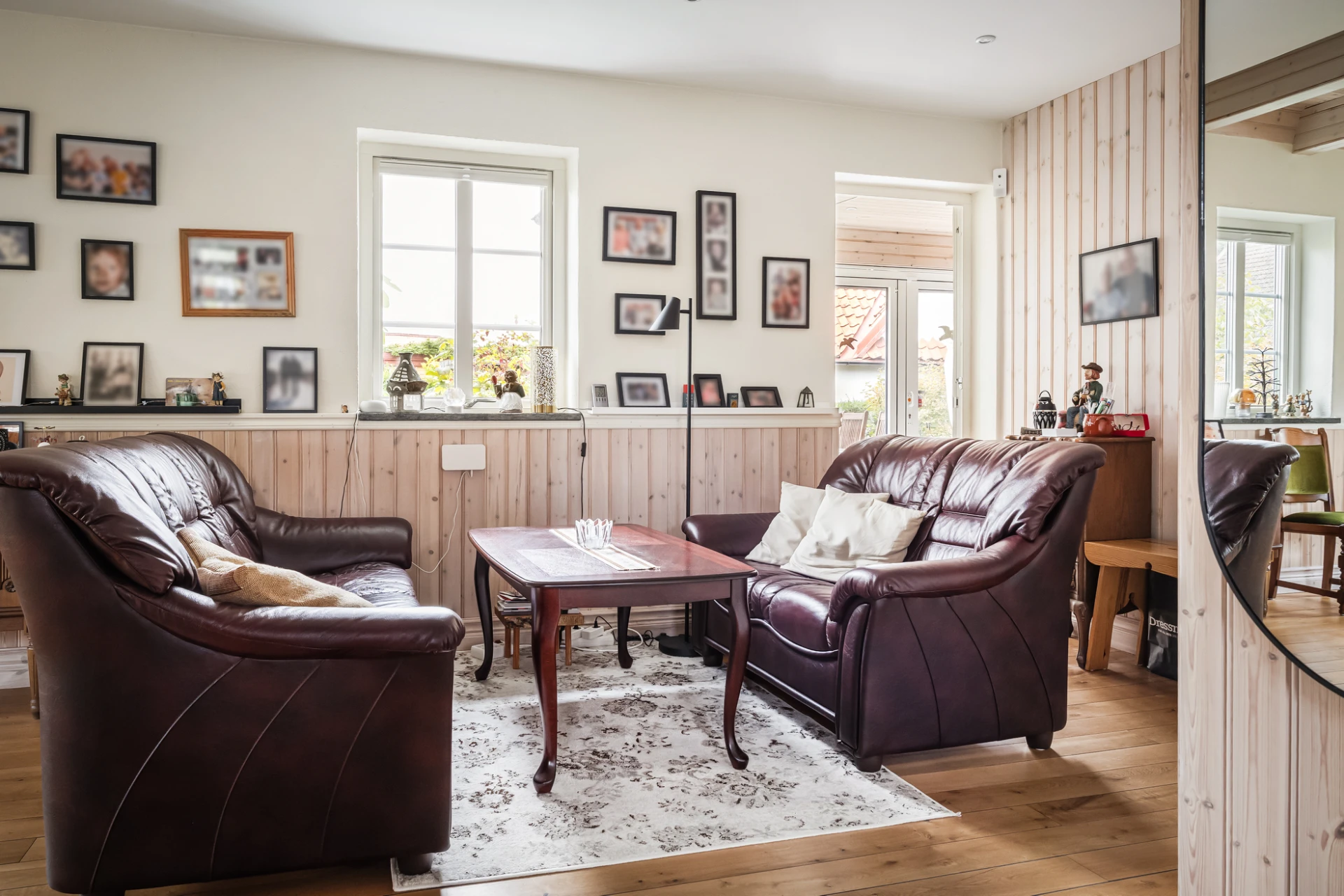Härligt sällskapsrum med gott om plats. Utgång till uterum, vattenburen golvvärme finns här. Vidare till trädäck i nordvästläge. Garderob mot sovrum. Gästtoalett.
