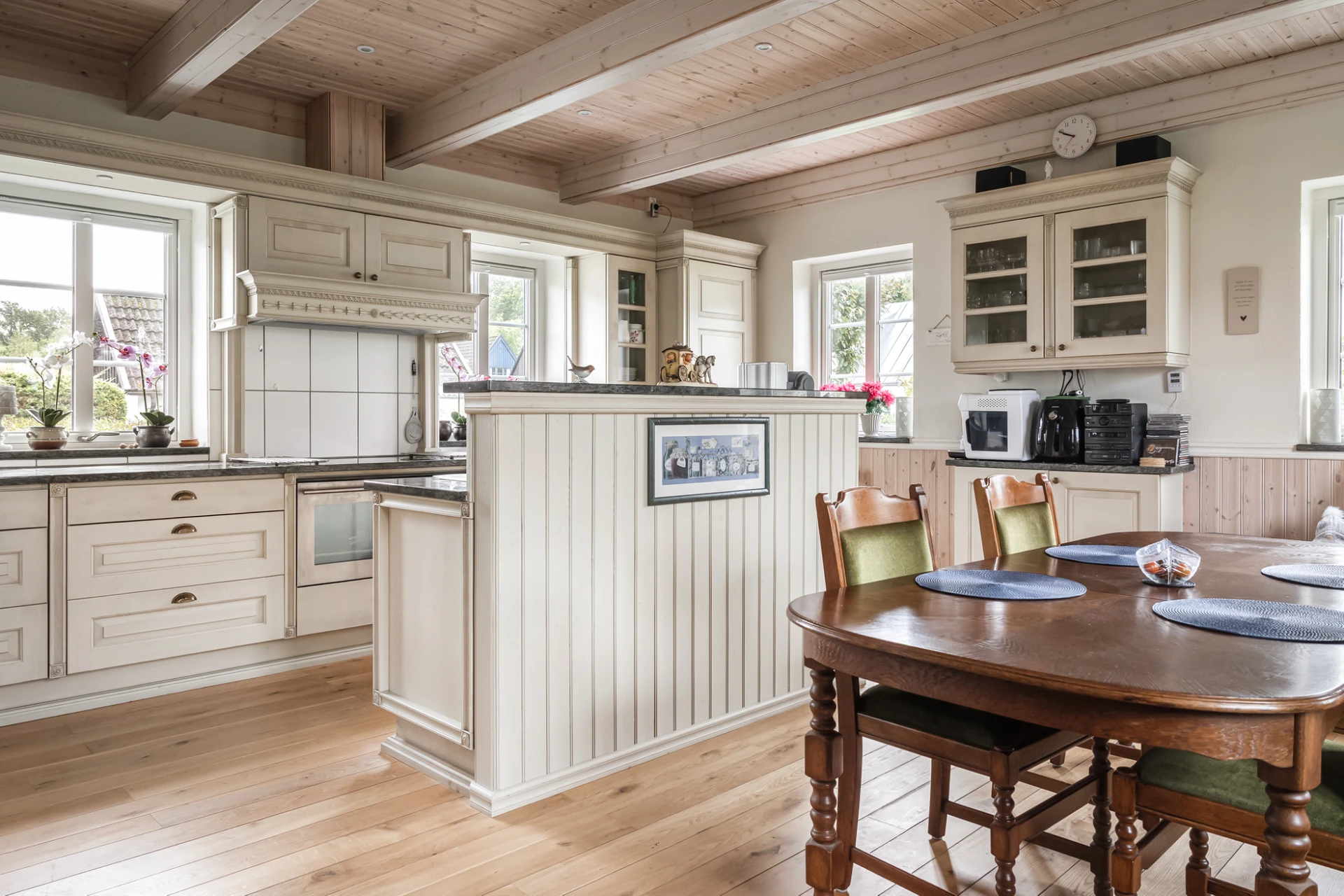 På entréplanet möts du av ett ljust och luftigt kök i lantlig stil med påkostade snickerier, granitbänkskivor, inbyggda vitvaror och generös arbetsyta. Härifrån når du en öppen planlösning mot matplats och vardagsrum – med vacker vy över trädgården och ljusinsläpp från flera väderstreck.