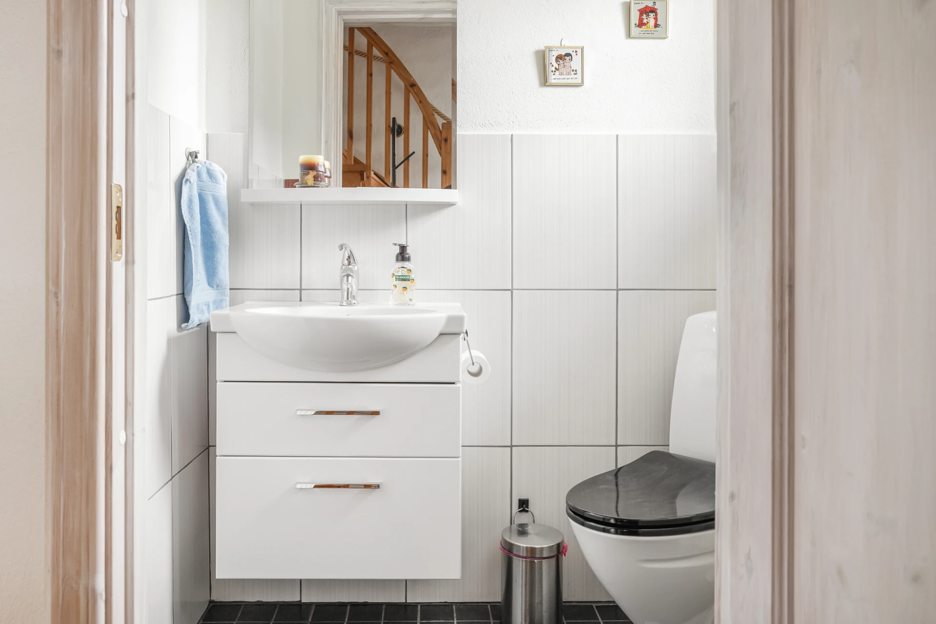 Gästtoalett på entréplan. Klinkersgolv och halvkaklade väggar. WC och tvättställ.